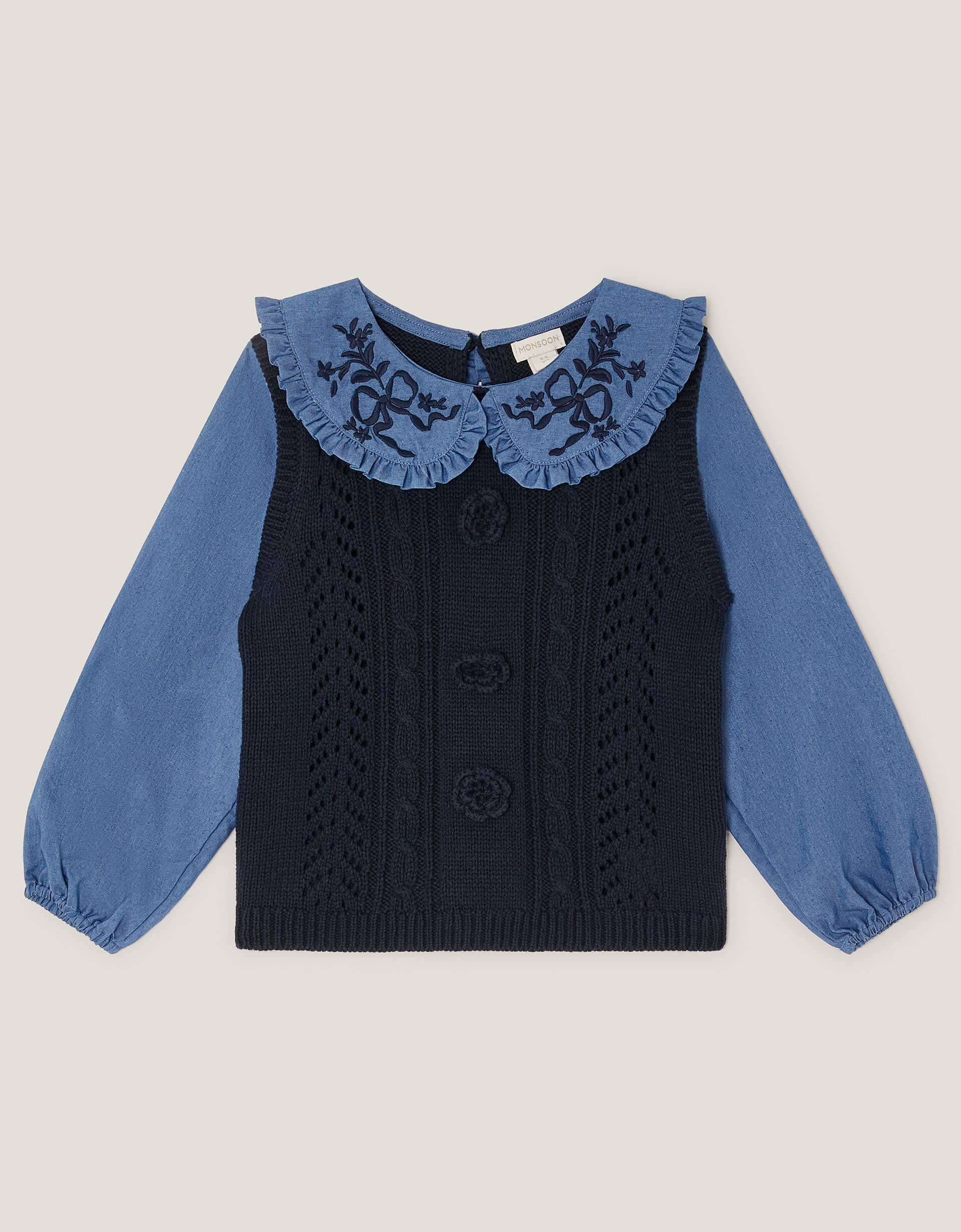 We’ve styled it so you don’t have to. Designed to look like a knit vest over a chambray blouse, this 2-in-1 style is finished with a cute embroidered collar and easy back button fastening. Blue