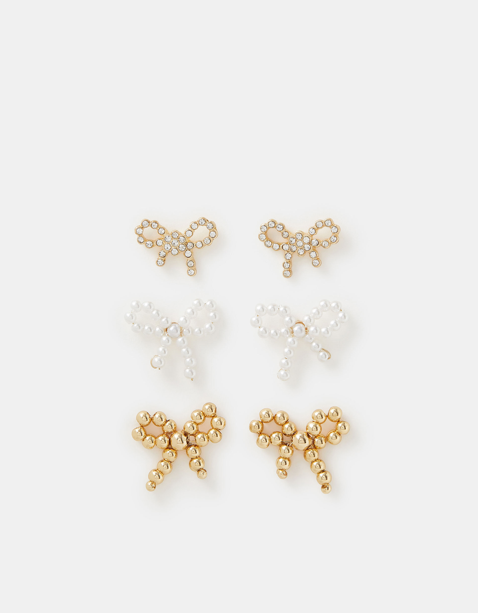 Finish all your looks with these bow-tiful earrings. Embellished with a mix of diamantés, faux pearls and gold beads, they’re shaped like a perfectly-tied bow on a stud profile. Three pairs included. Non-refundable.