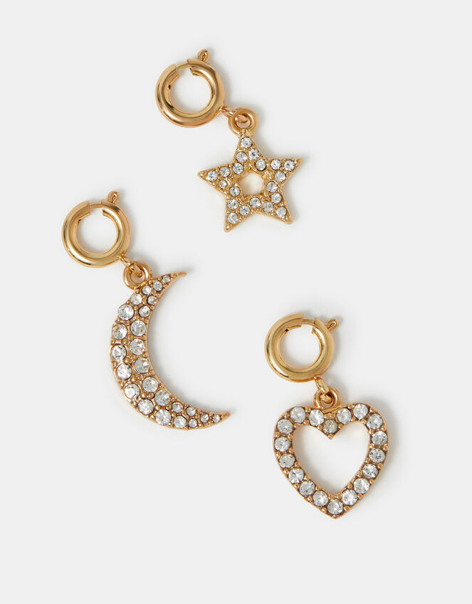 Accessories that are out of this world! Featuring designs of a star, moon and heart all encrusted with diamante stones, these jewellery charms are a dazzling addition to bracelets or necklaces. Three included.
