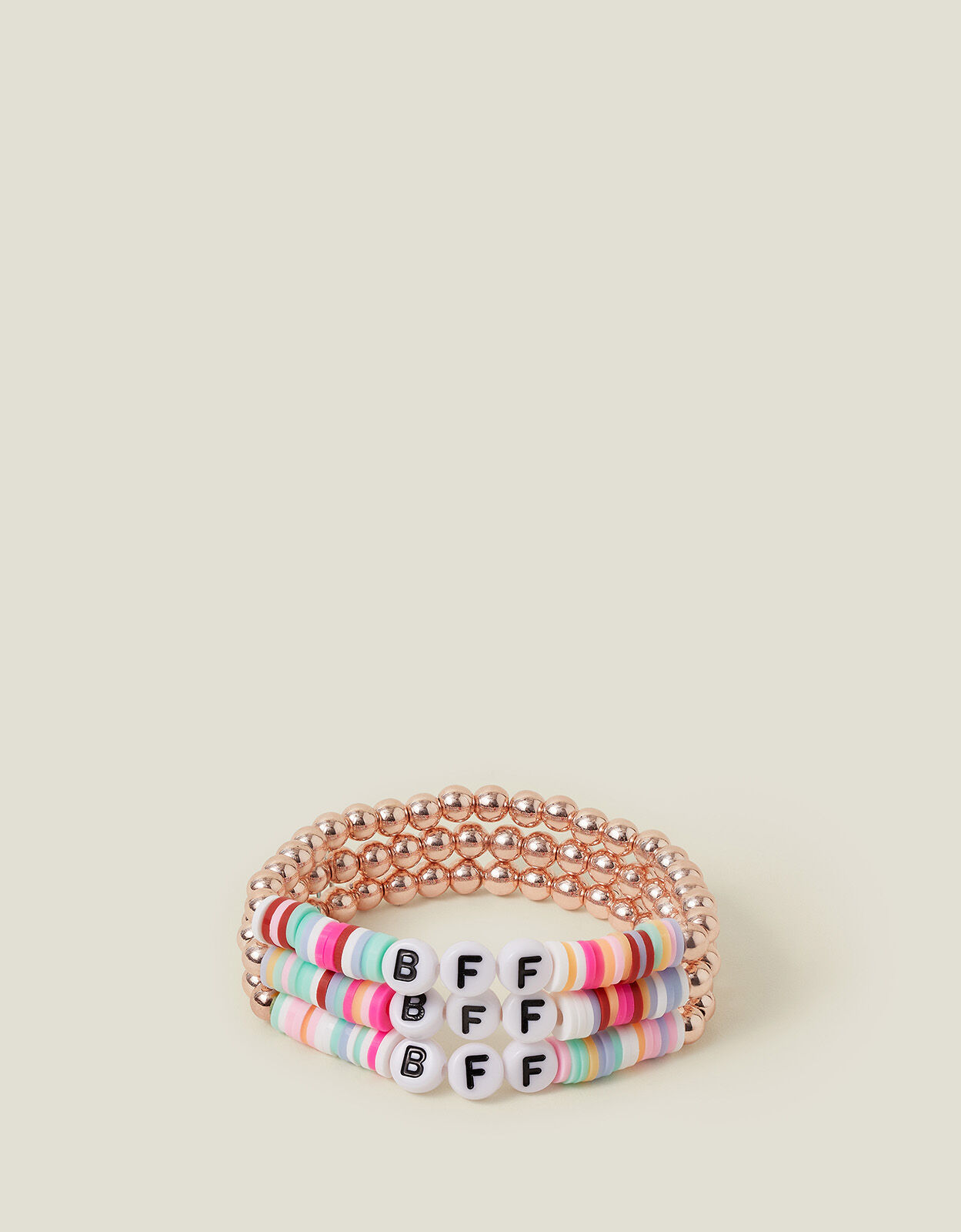 Hey, besties! Perfect for sharing amongst friends, this bracelet set features three beaded stretch bracelets with the phrase ‘BFF’ in lettered beads.