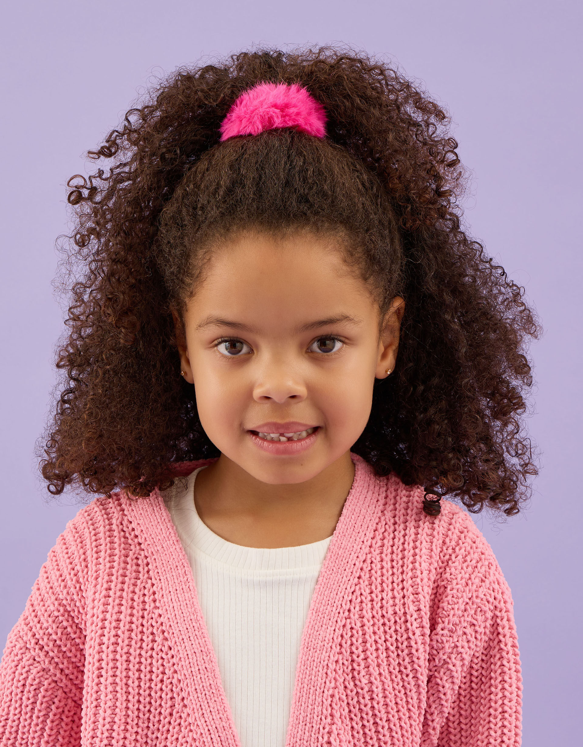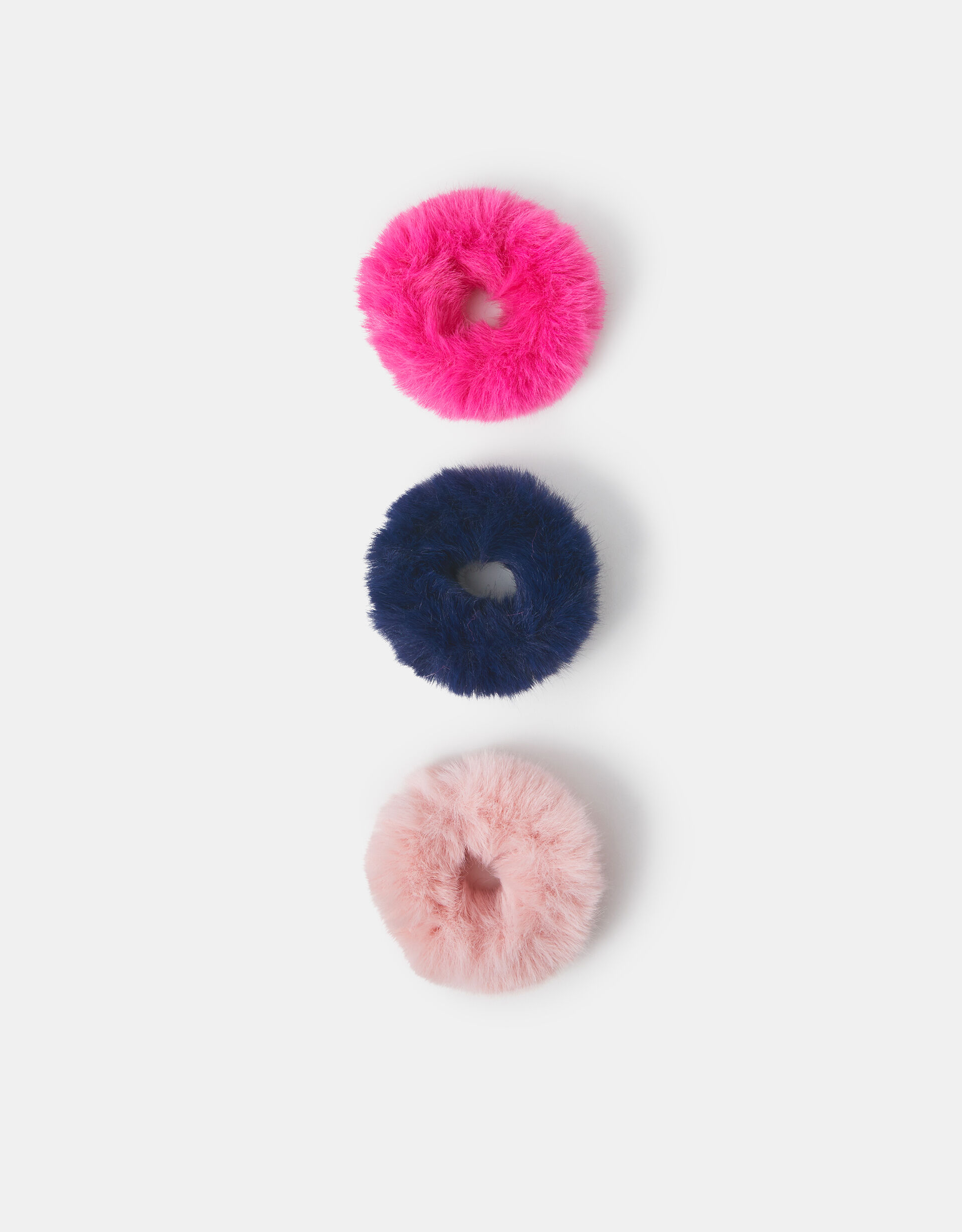 A touch of 90s for the new generation, these hair scrunchies are made from super fluffy faux with in hot pink, navy blue and blush. Three included. Warning! Choking Hazard—Small parts. Not suitable for children under 3 years old.