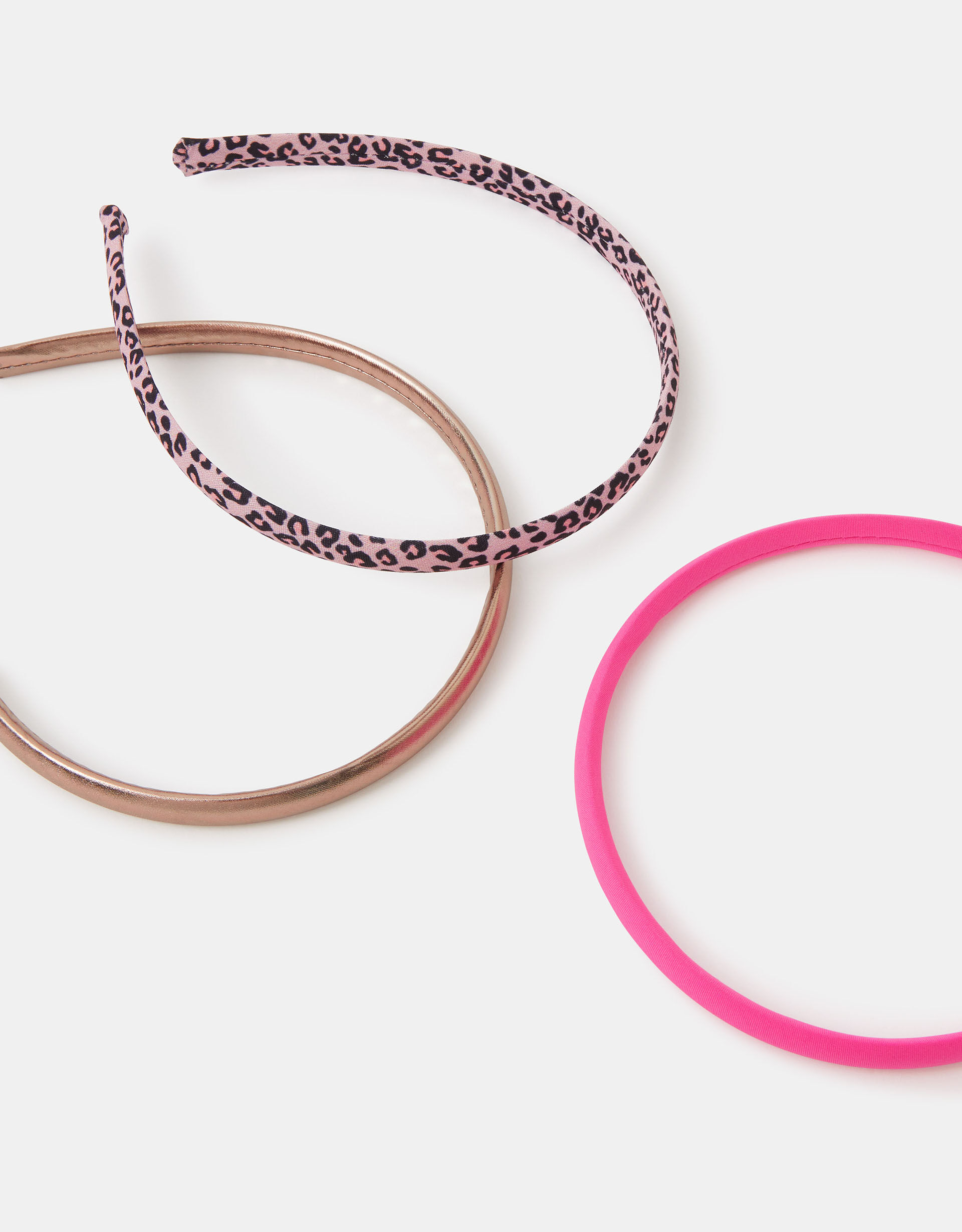 Decisions, decisions… Ready to zhuzh/i> up their outfit, this hair set includes three headbands in different finishes. Your little one can choose from the metallic rose gold, bright pink, or leopard print style. Fun! Three included. Warning! Choking Hazard—Small parts. Not suitable for children under 3 years old.