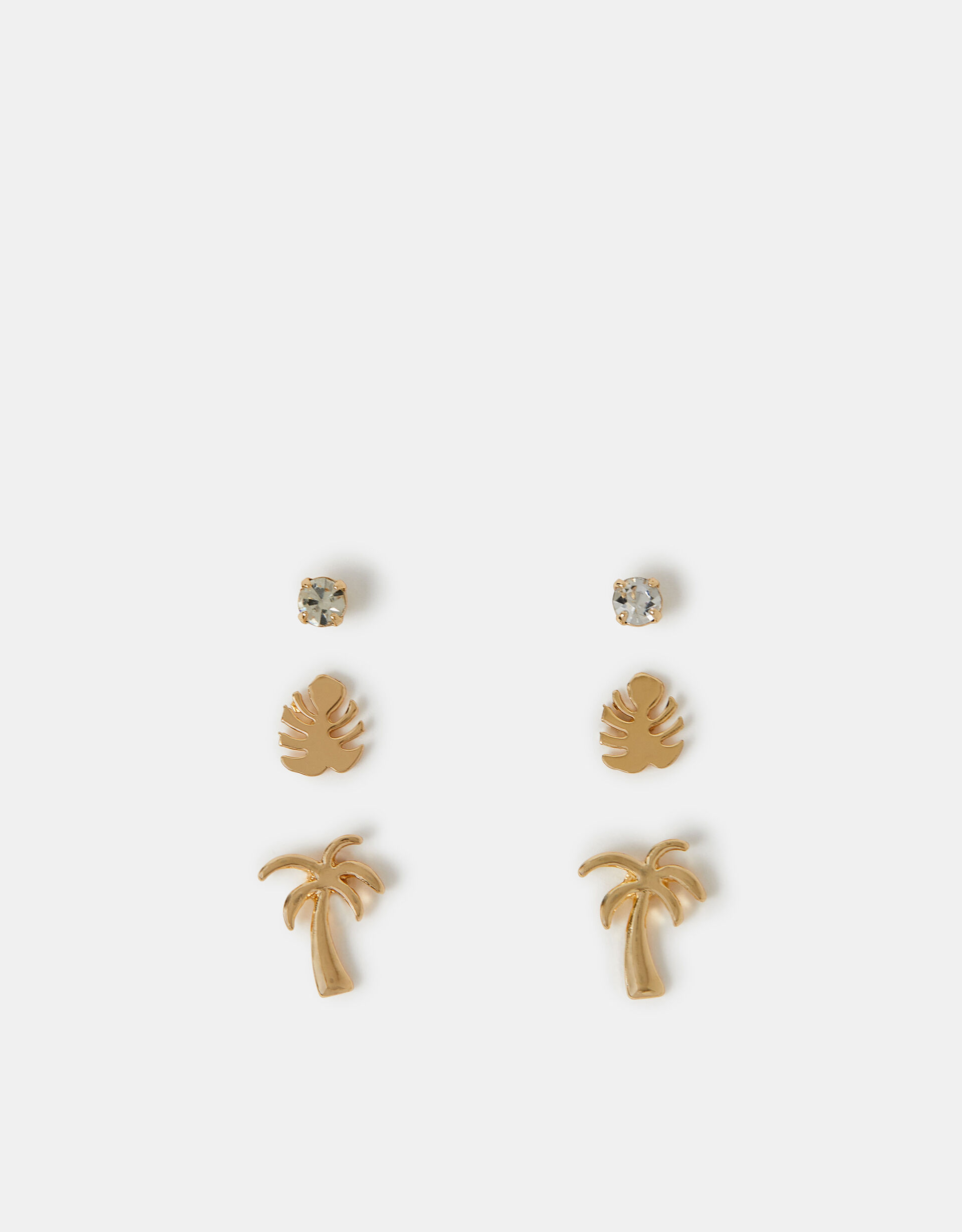 Balmy days are calling with this fun earring set. Crafted in a golden tone, these studs include palm tree, palm leaf, and sparkly diamante designs. Three pairs included. Non-refundable.