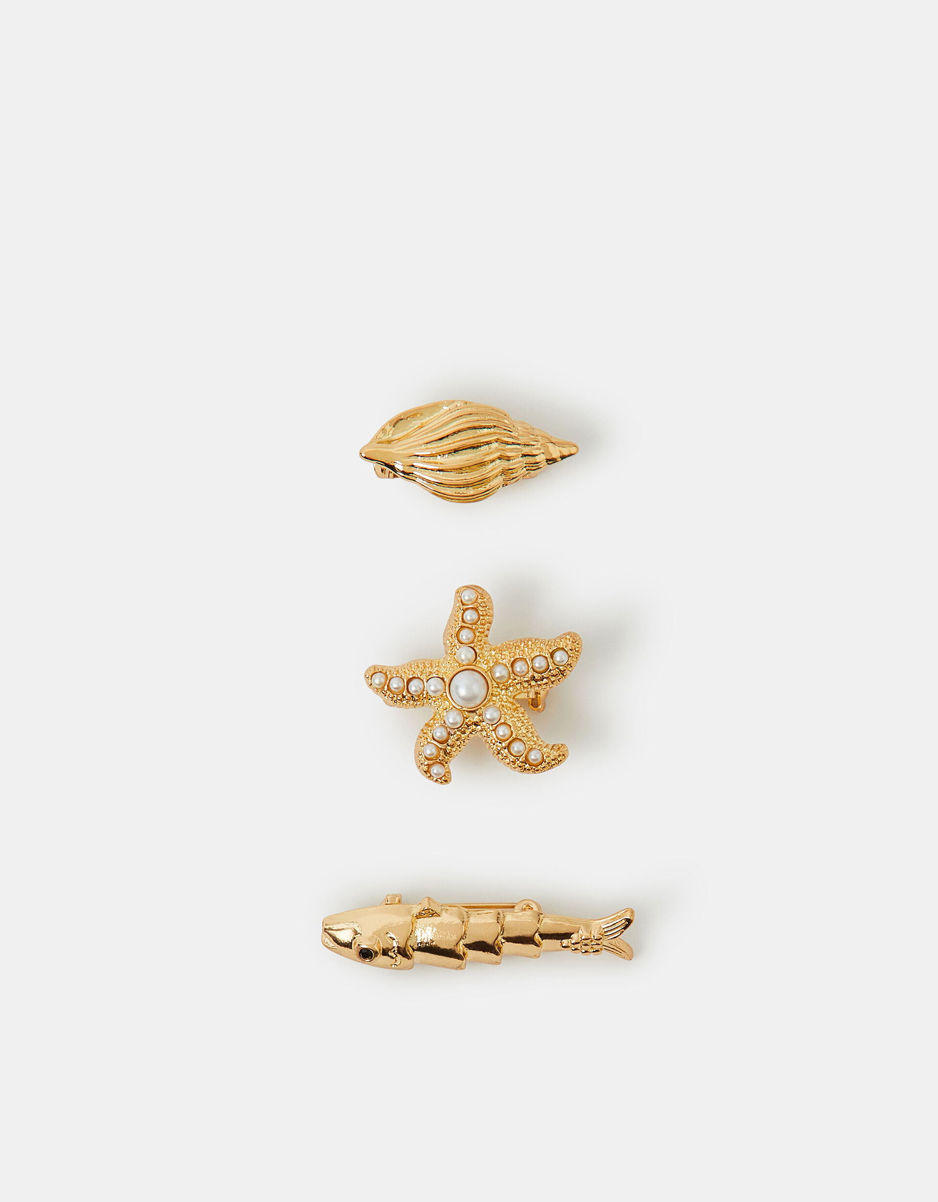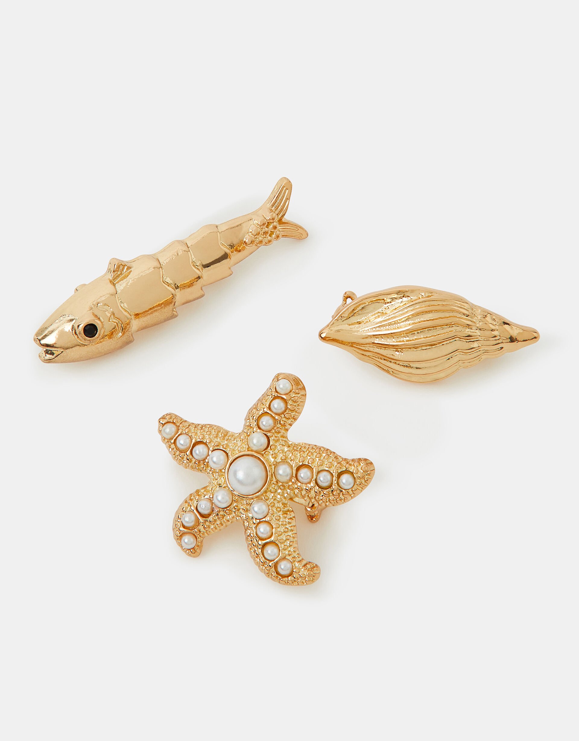What a catch! Dipped in a golden tone, this set of brooches include a fish, starfish and seashell design, finished with shimmery pearl accents. Three included.