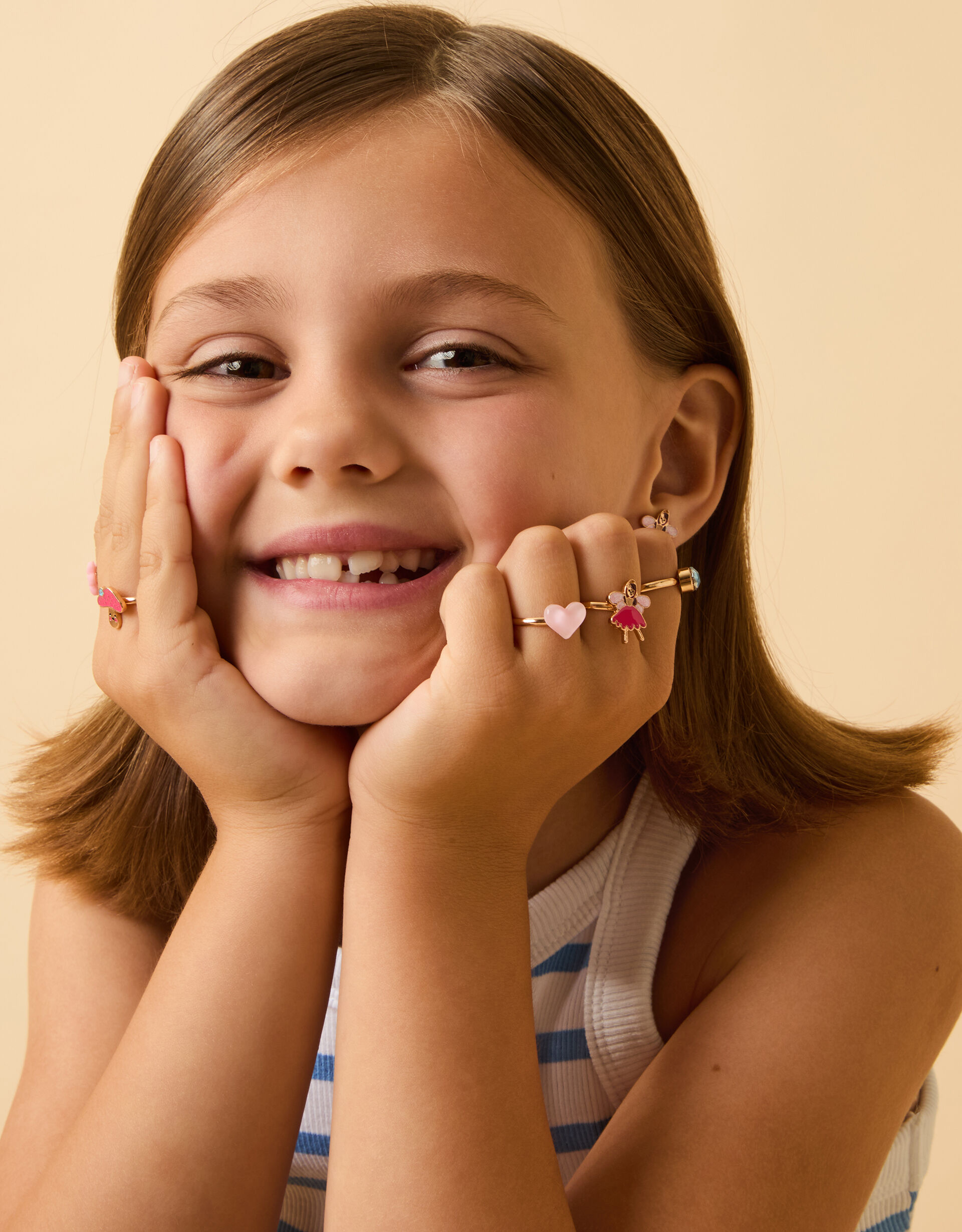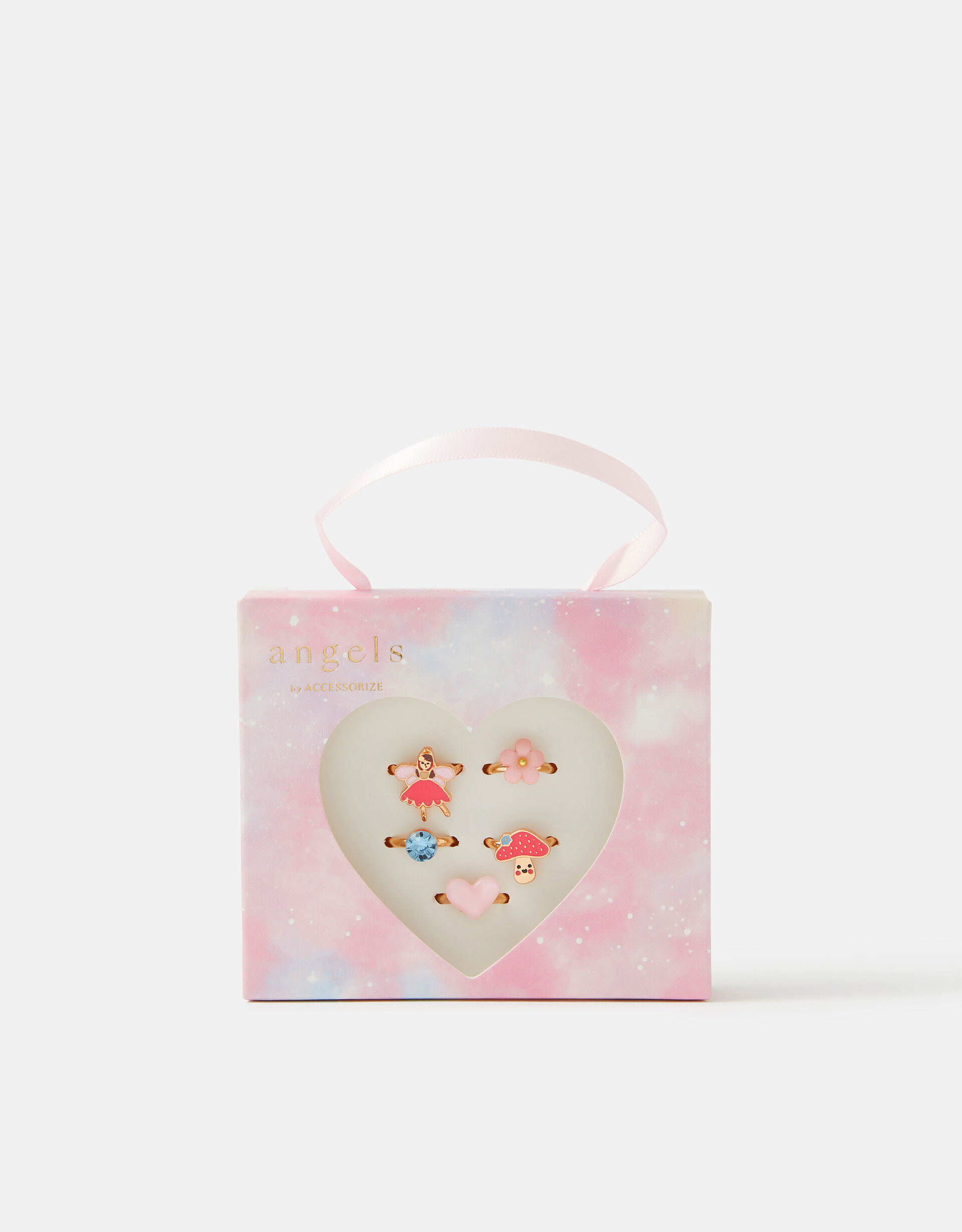 *Sprinkles fairy dust* This set of rings includes a mix of fairy-inspired designs sitting atop adjustable gold-tone bands. Five included. Warning! Choking Hazard—Small parts. Not suitable for children under 3 years old.