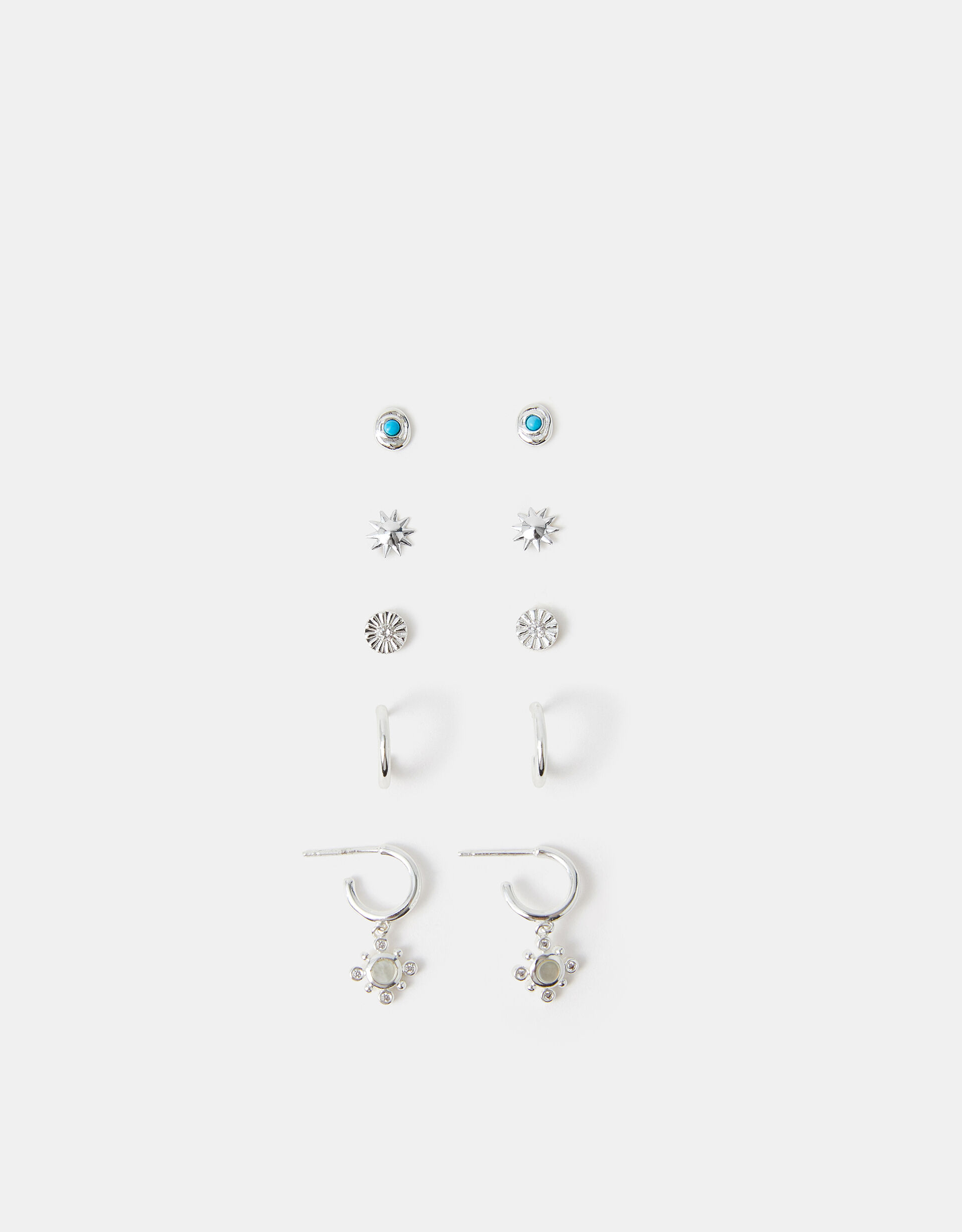 Dipped in sterling silver for a long-lasting finish, this pack of hoops and studs feature sun motifs with mother of pearl, diamanté, and beaded accents. Which pair will you wear first? Non-refundable.