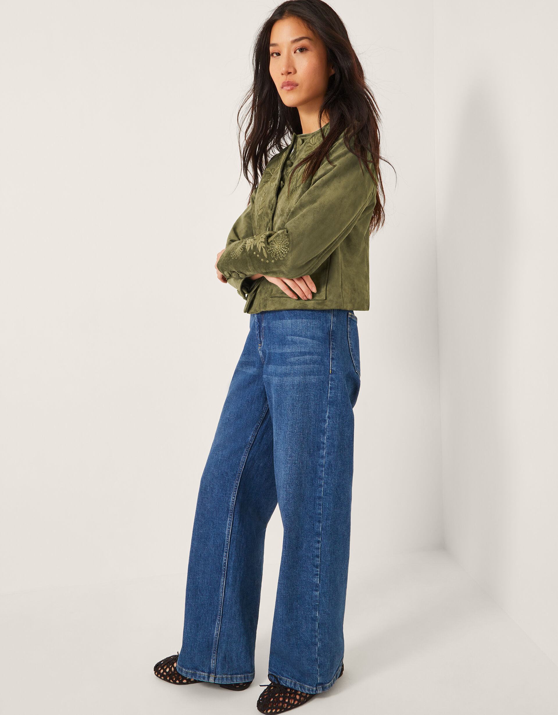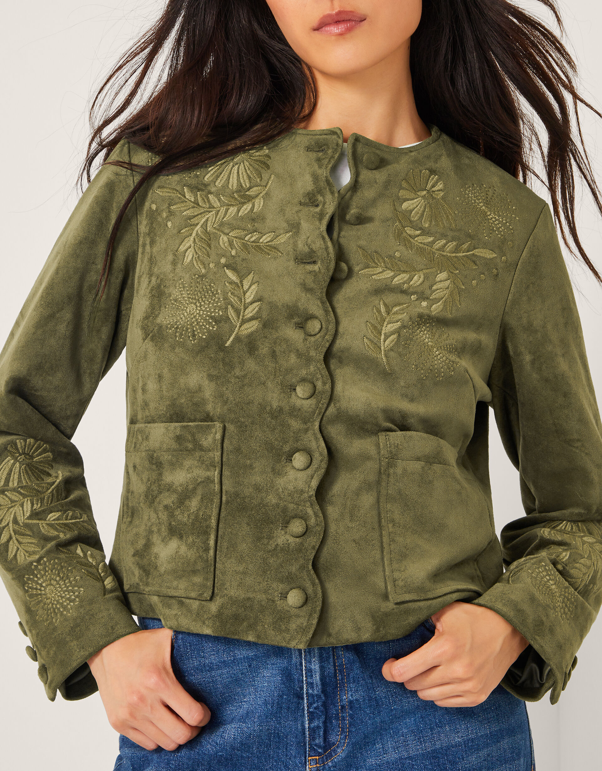 You’ve got great taste. Soaked in military green with a soft (faux) suede finish, this jacket it the ultimate layer for all your boho-inspired looks. Decorated with floral embroidery and scalloped edges, it features two patch pockets and front button fastenings. Green
