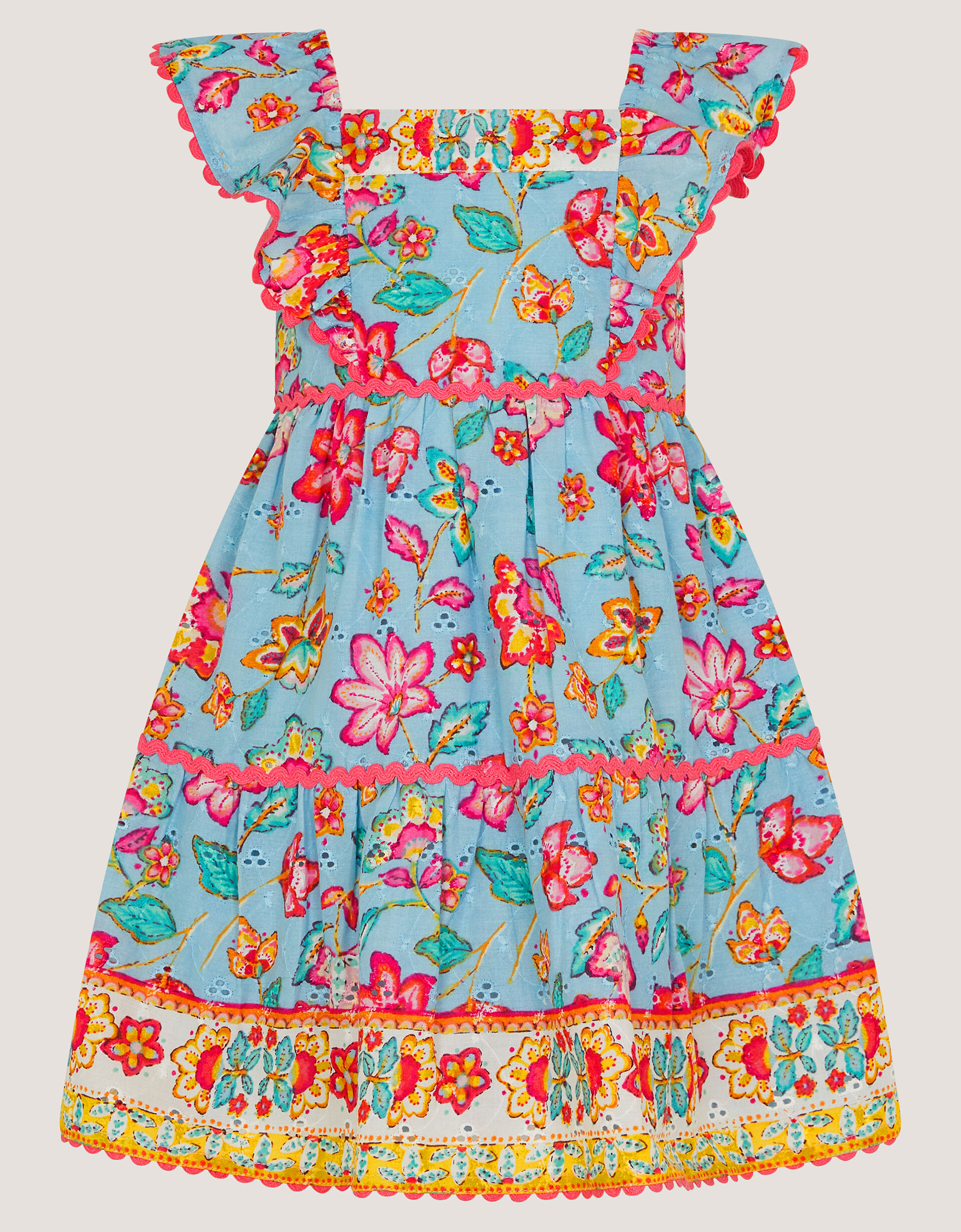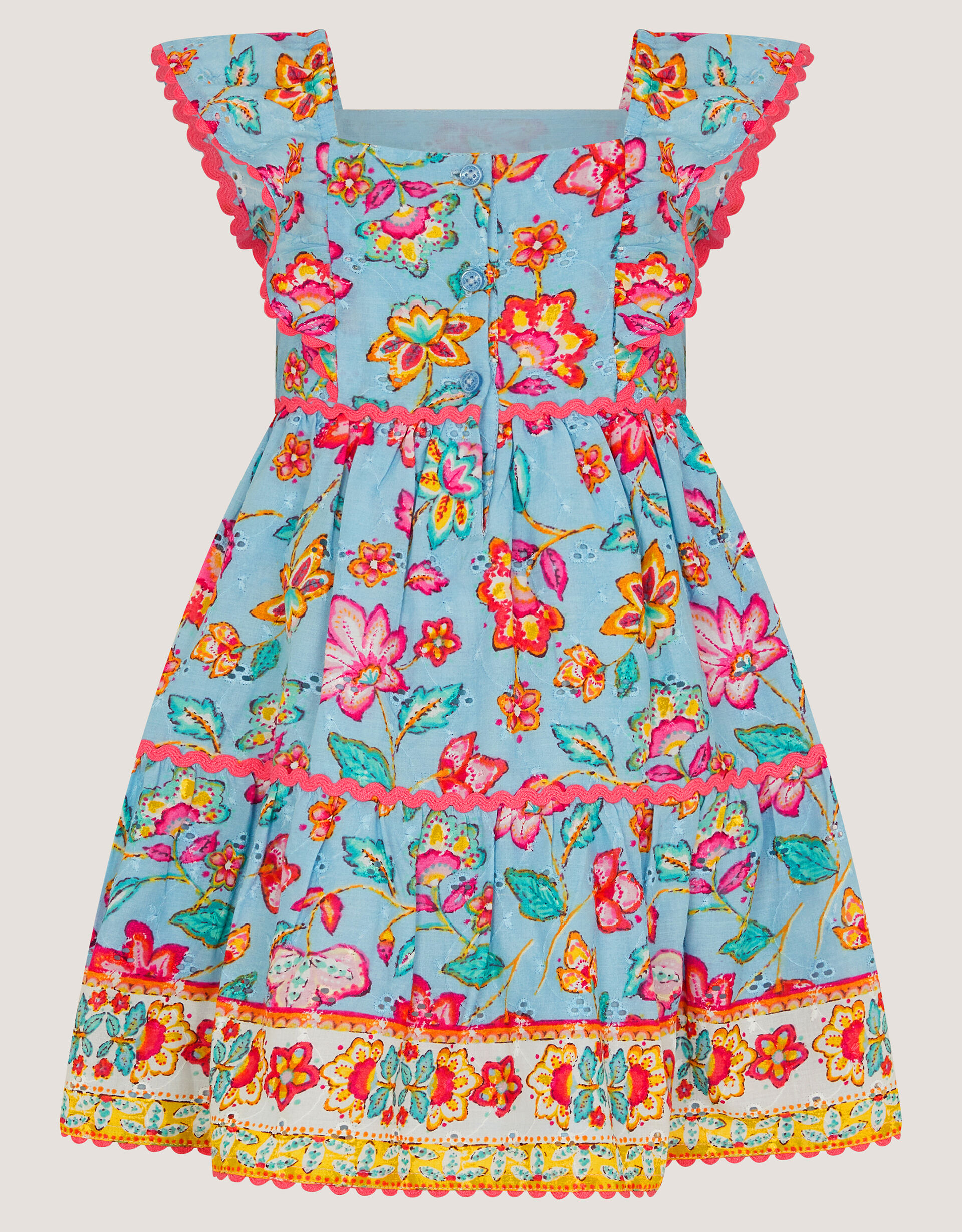 Today’s forecast: Bright! Made with broderie cotton in a lovely sky blue, this dress is patterned with heritage florals in a mix of super vibrant colours. Trimmed with ric rac embroidery and frilly straps for an elevated finish, it’s a beautiful pick for them to wear day and night.