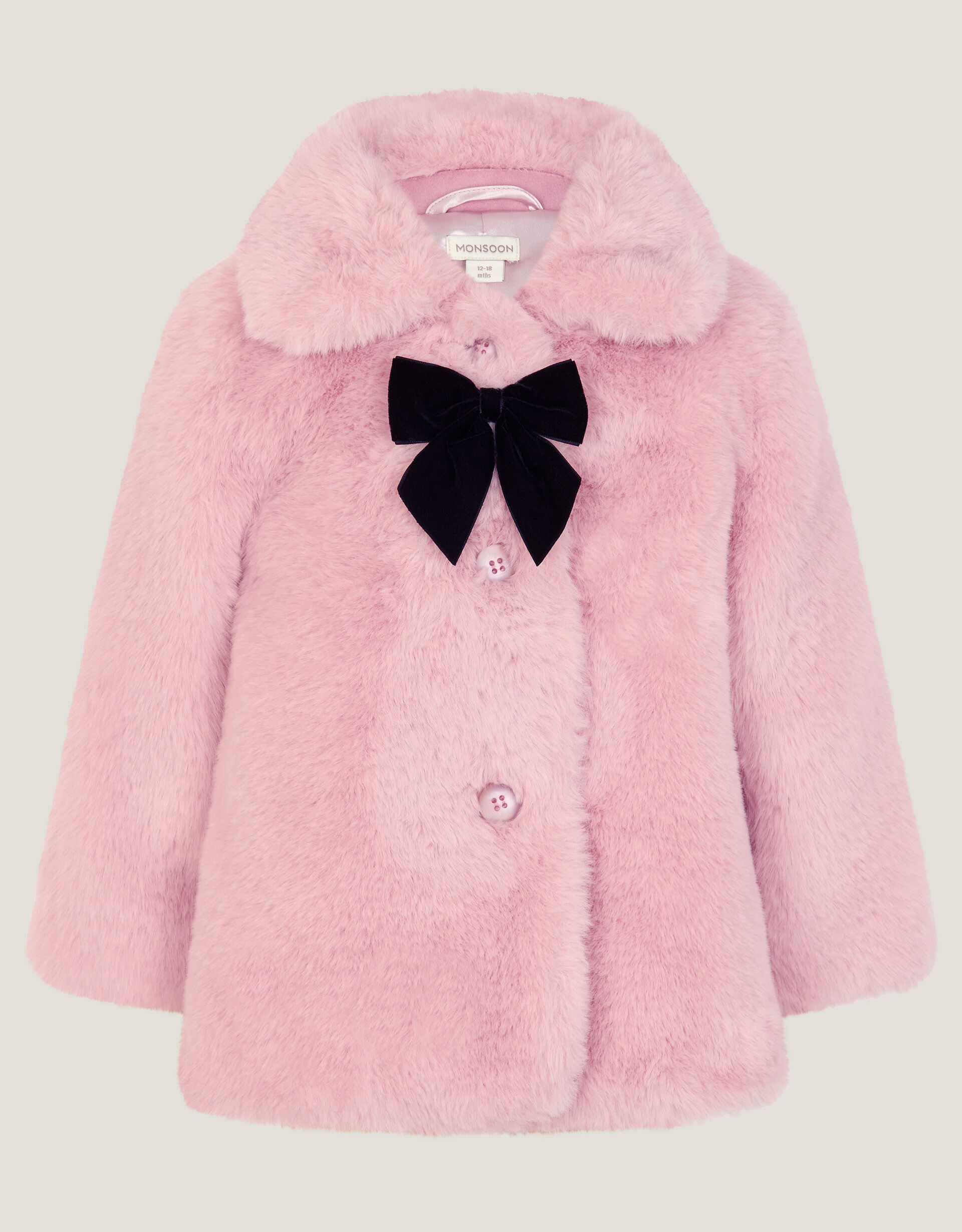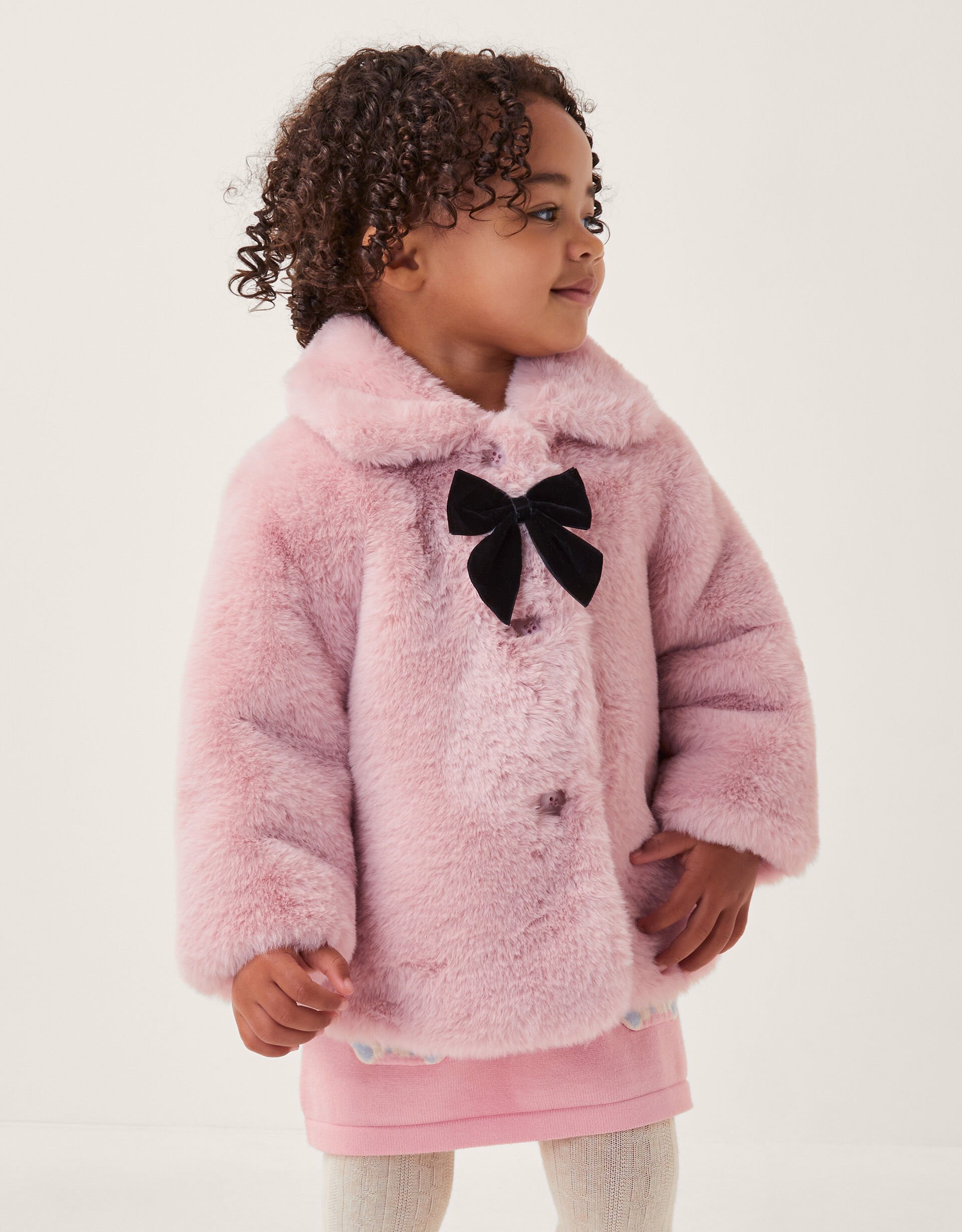 Little coat, big runway energy. Keep them warm and extra cosy in style this season. Made from fluffy faux fur in a baby pink colour, this coat is designed with a snuggly collar and a black bow detail amongst the front button fastenings. Pink