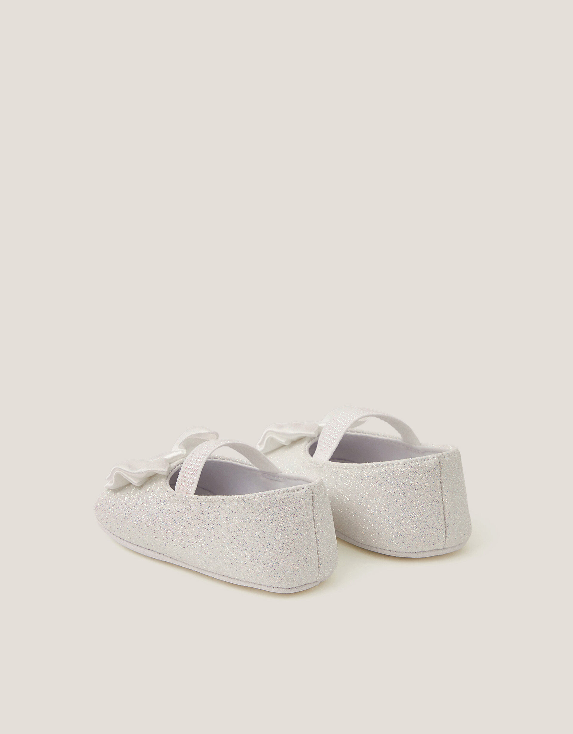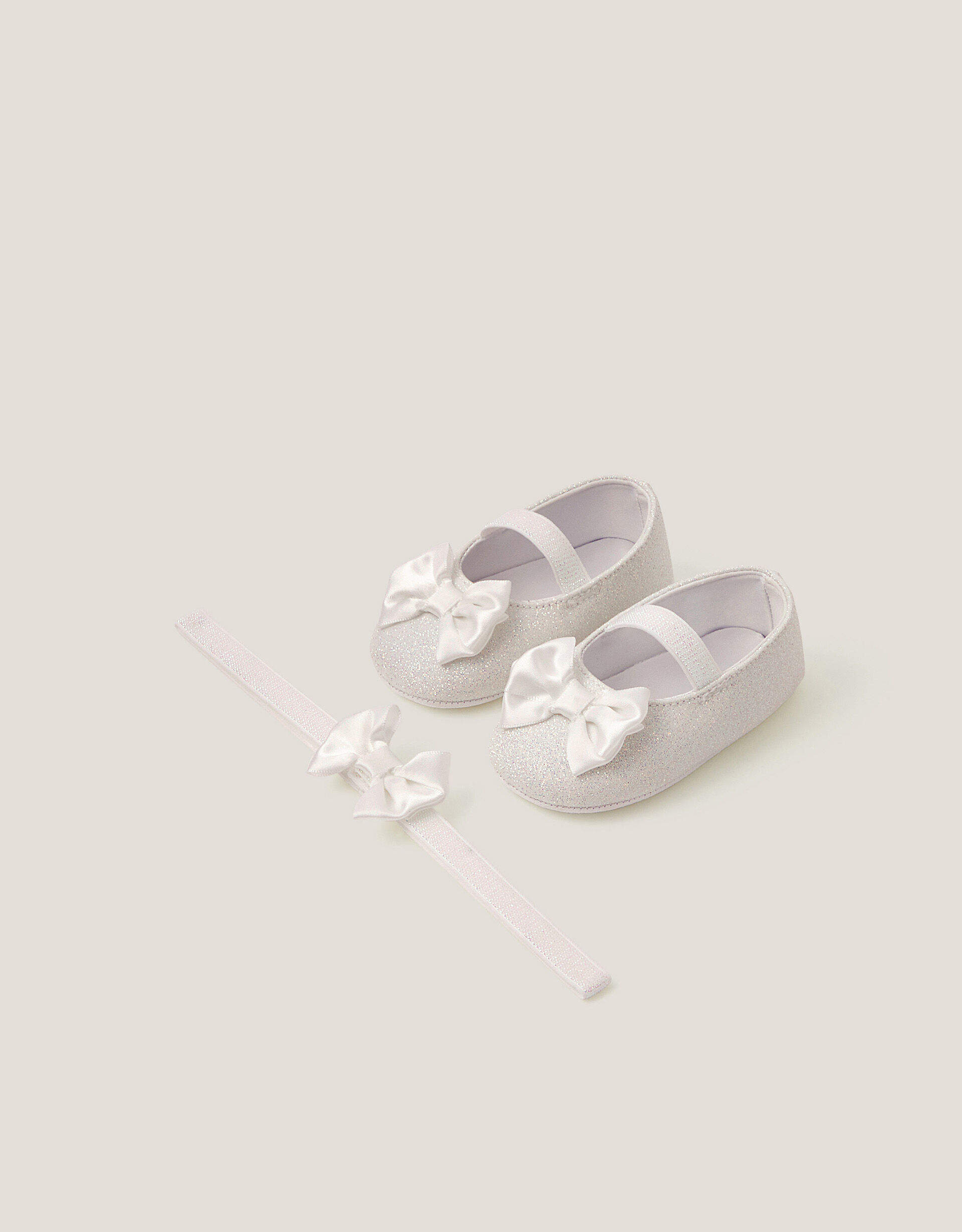 Sparkles from head to toes. Perfect for baby’s first special occasion or party, this set includes a stretchy bando headband and booties, both sprinkled with glitter and topped with satin bows. Ivory