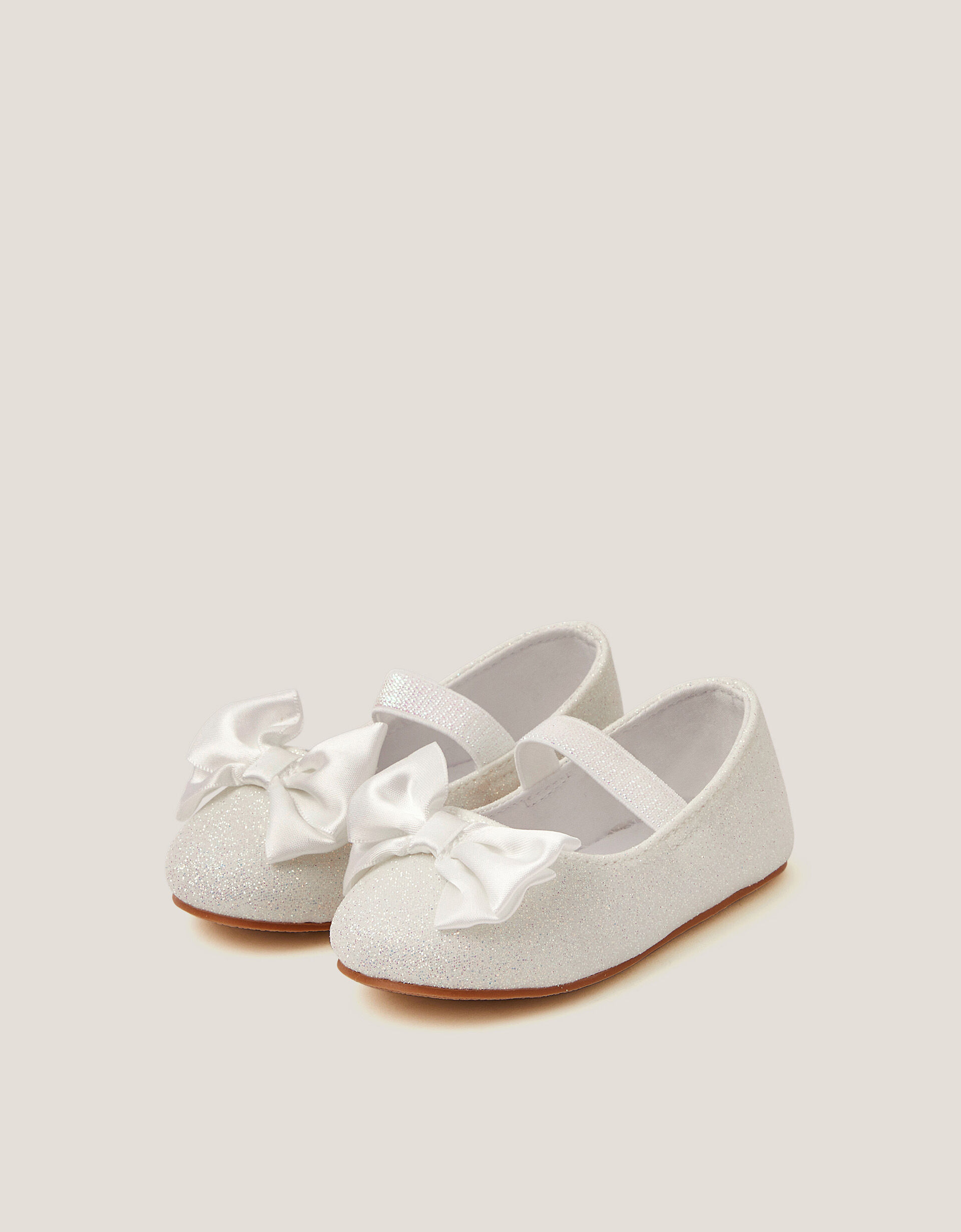Make their first steps sparkle. Perfect for special occasions and parties, these walkers are sprinkled with glitter and topped with a ribbon bow. Finished with a stretchy top strap for keeping their wriggly toes in place. Ivory