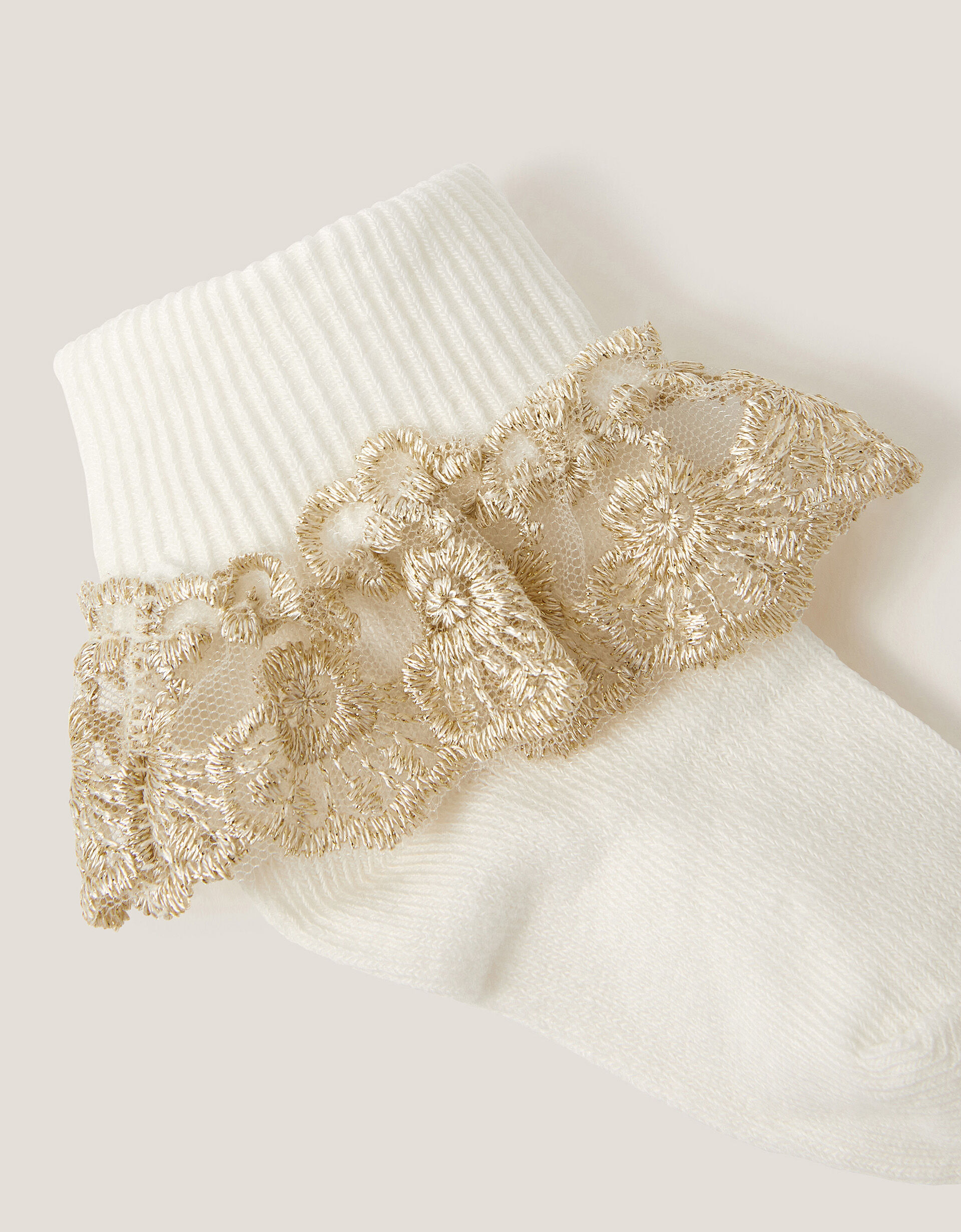 Baby’s outfit isn’t complete without a pair of cute socks! Keep their little tootsies snuggly and stylish with this ivory pair, designed with a gold lace frill around the ankle. Ivory