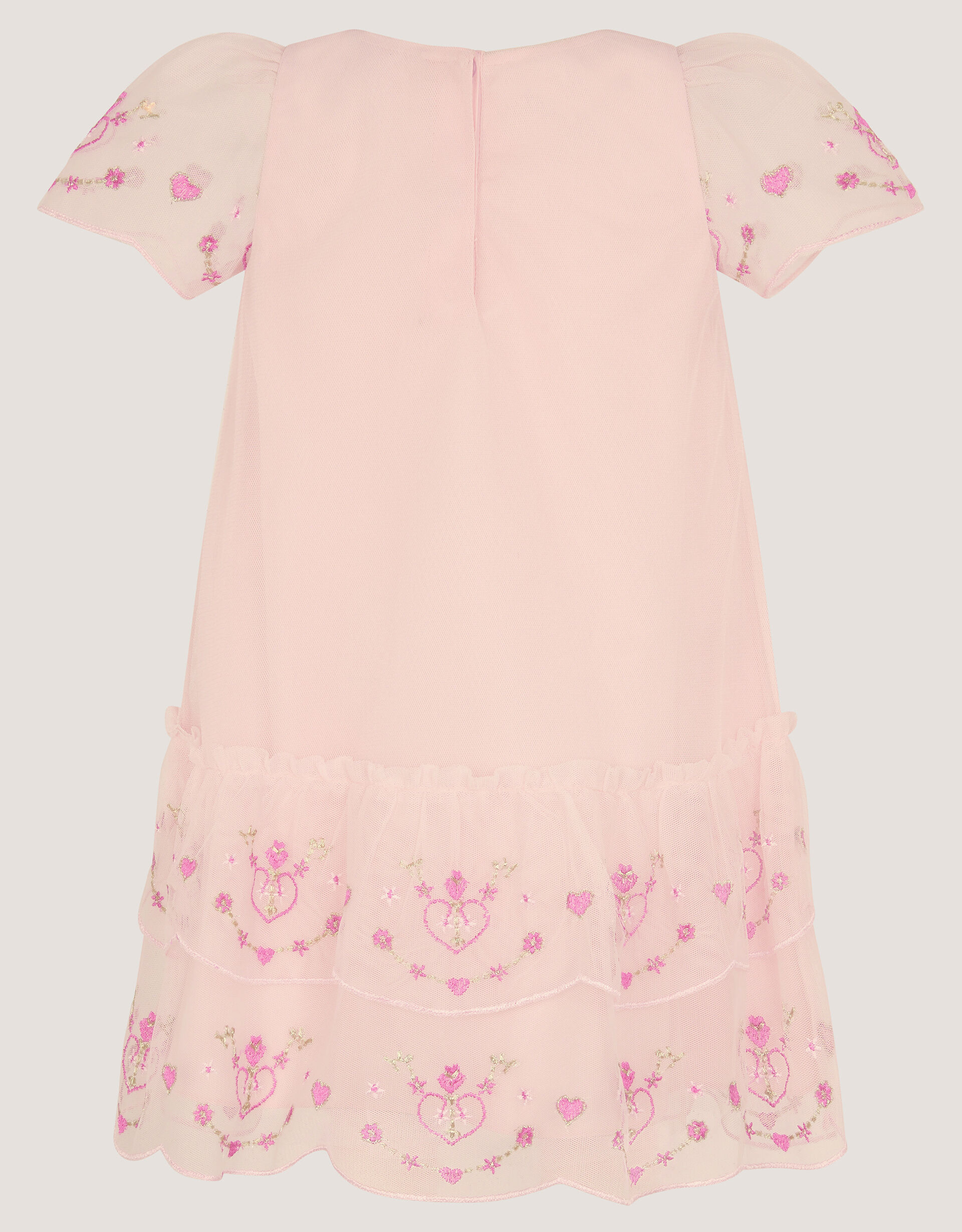*Heart eyes*. Covered in soft pink mesh, this dress is embroidered with decorative hearts and flower chains through the short sleeves and around the scalloped tiers. In this, baby will be best-dressed for every occasion. Pink