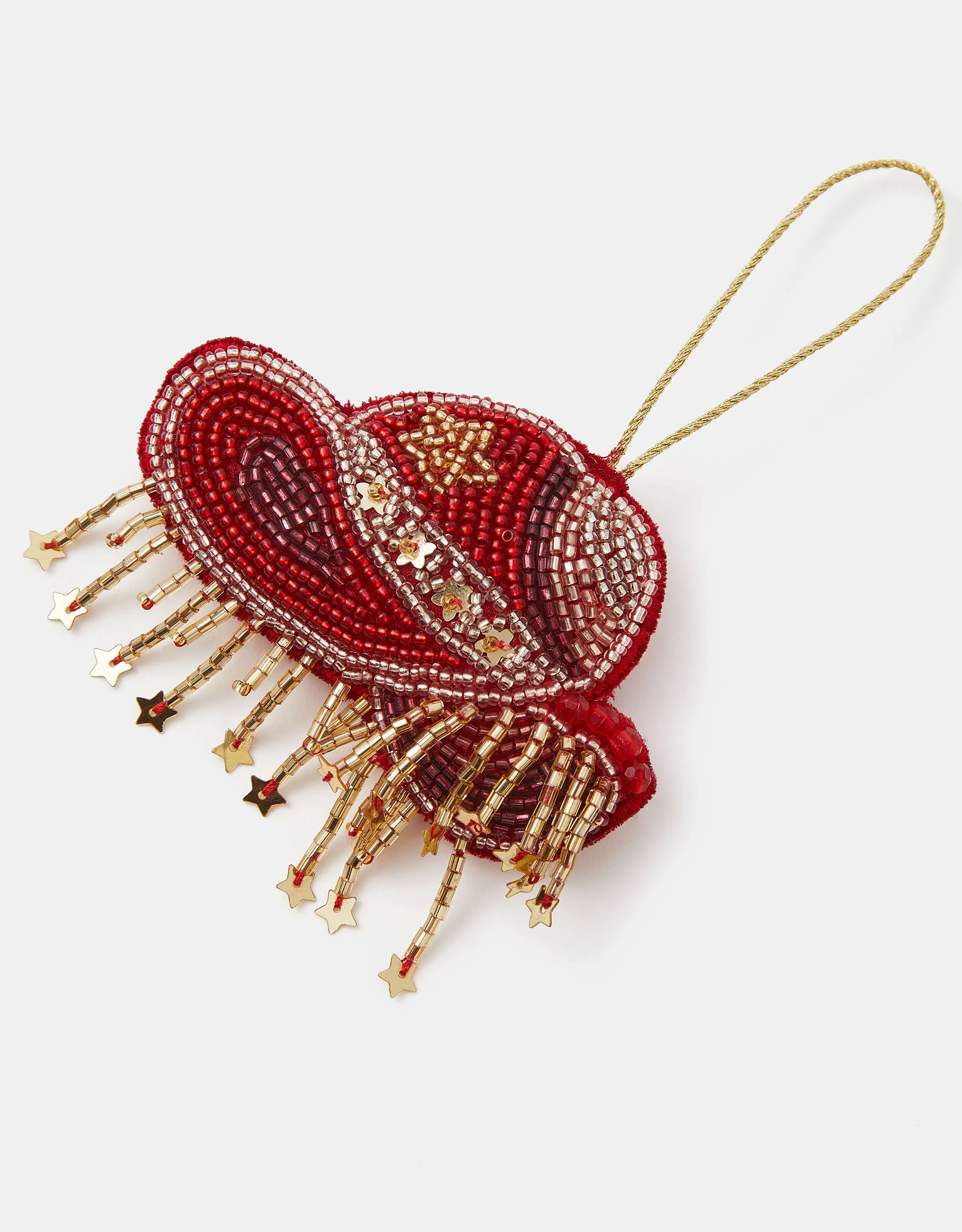 Yeehaw! The wild west is never far with this cowboy hat decoration. Delicately beaded and designed with starry tassels, it deserves a space on your tree.