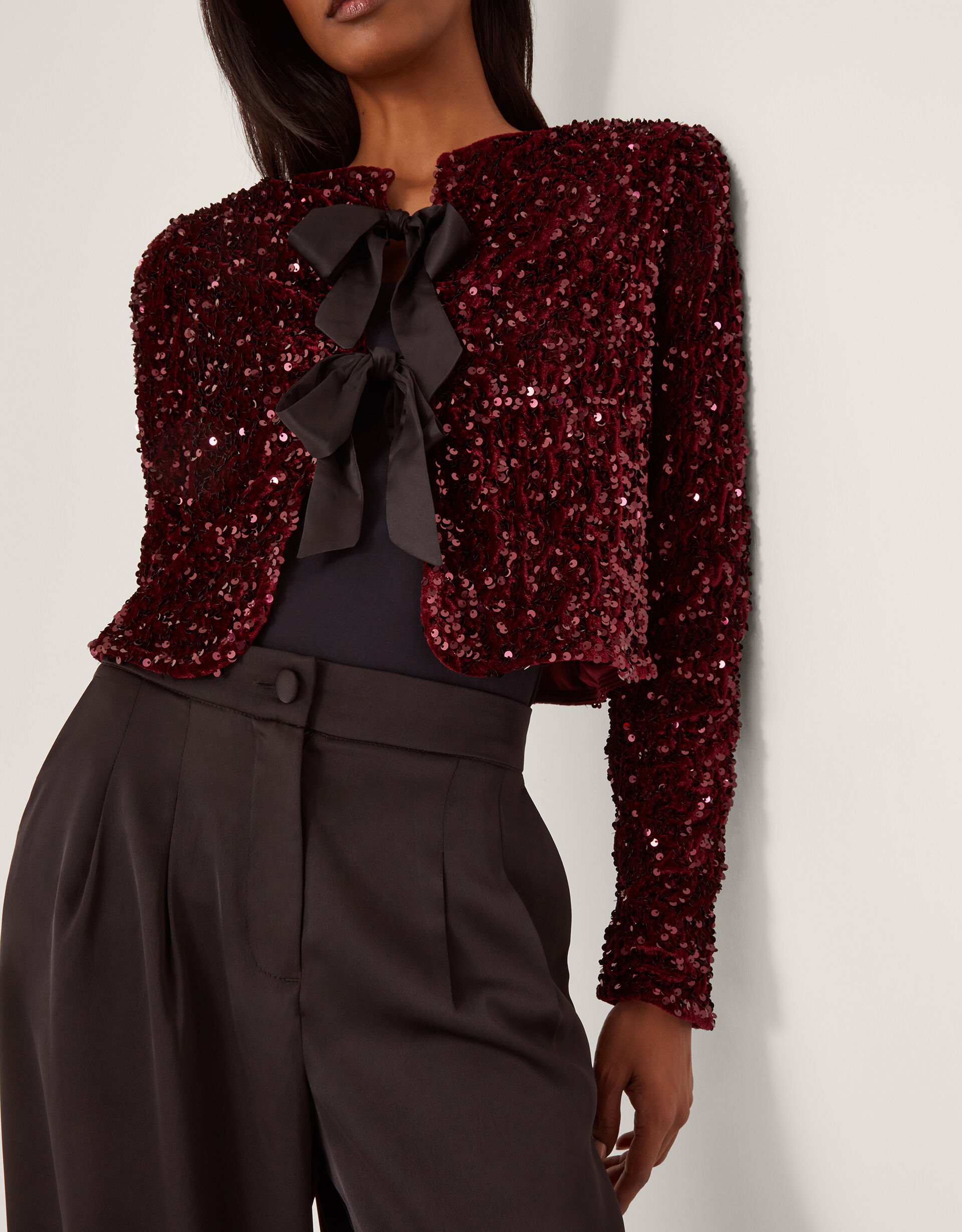 Talk about making a statement. Completely covered in sequins, this cropped jacket has been designed with satin bows. Slip it on top of a tee and you’ll be the life of every party. Red
