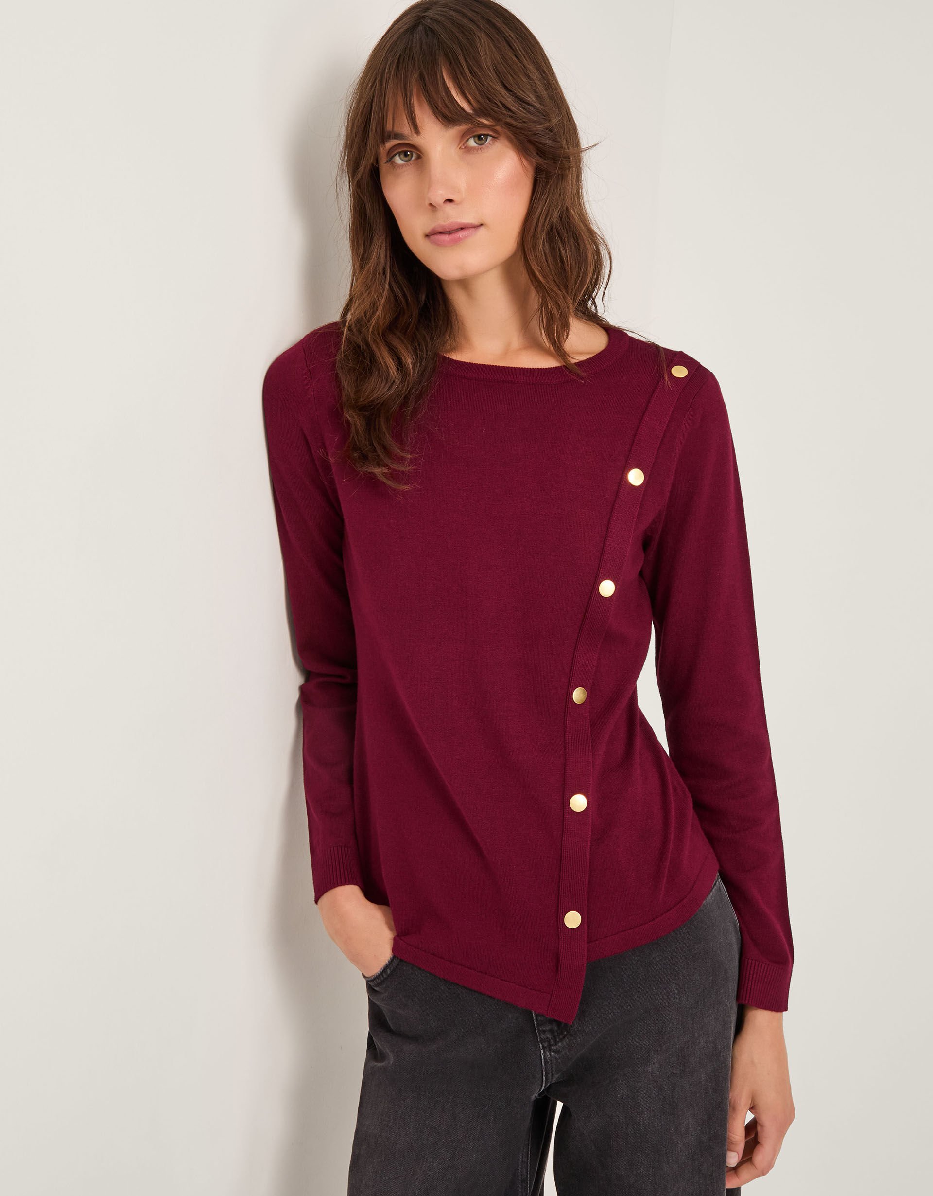 Hello sweater weather. Designed with a line of asymmetrical buttons in a golden tone, this jumper is an elevated addition to your knitwear collection. Couple with a midi skirt or your favourite jeans for an outfit you can rely on all season long. Red