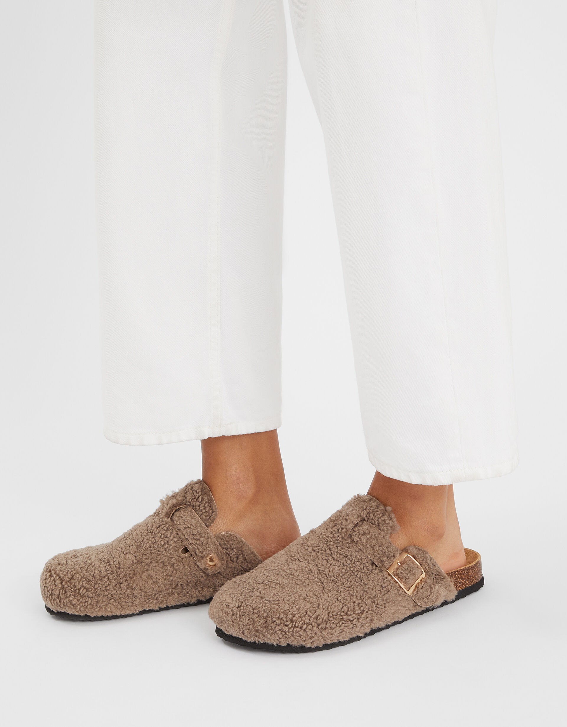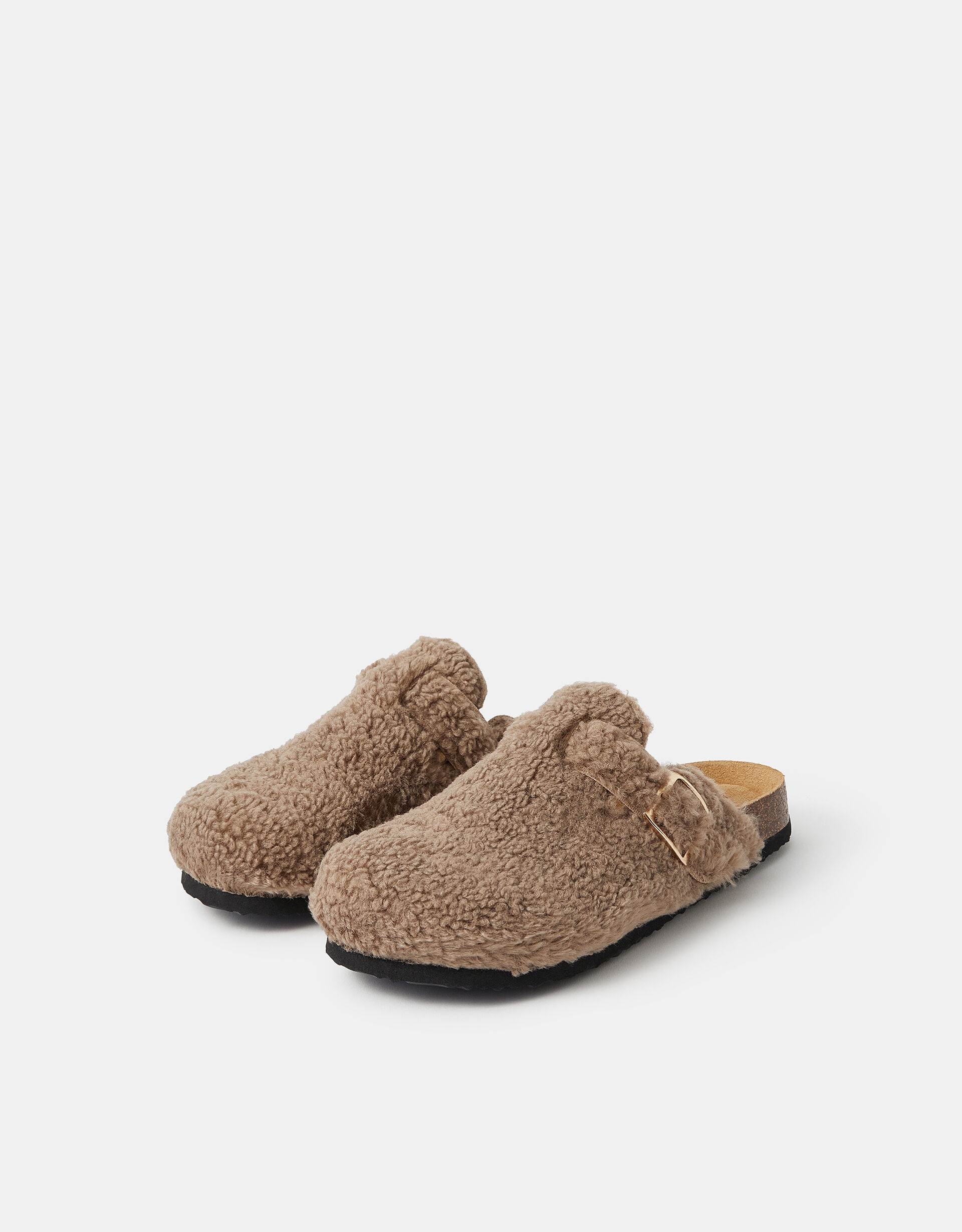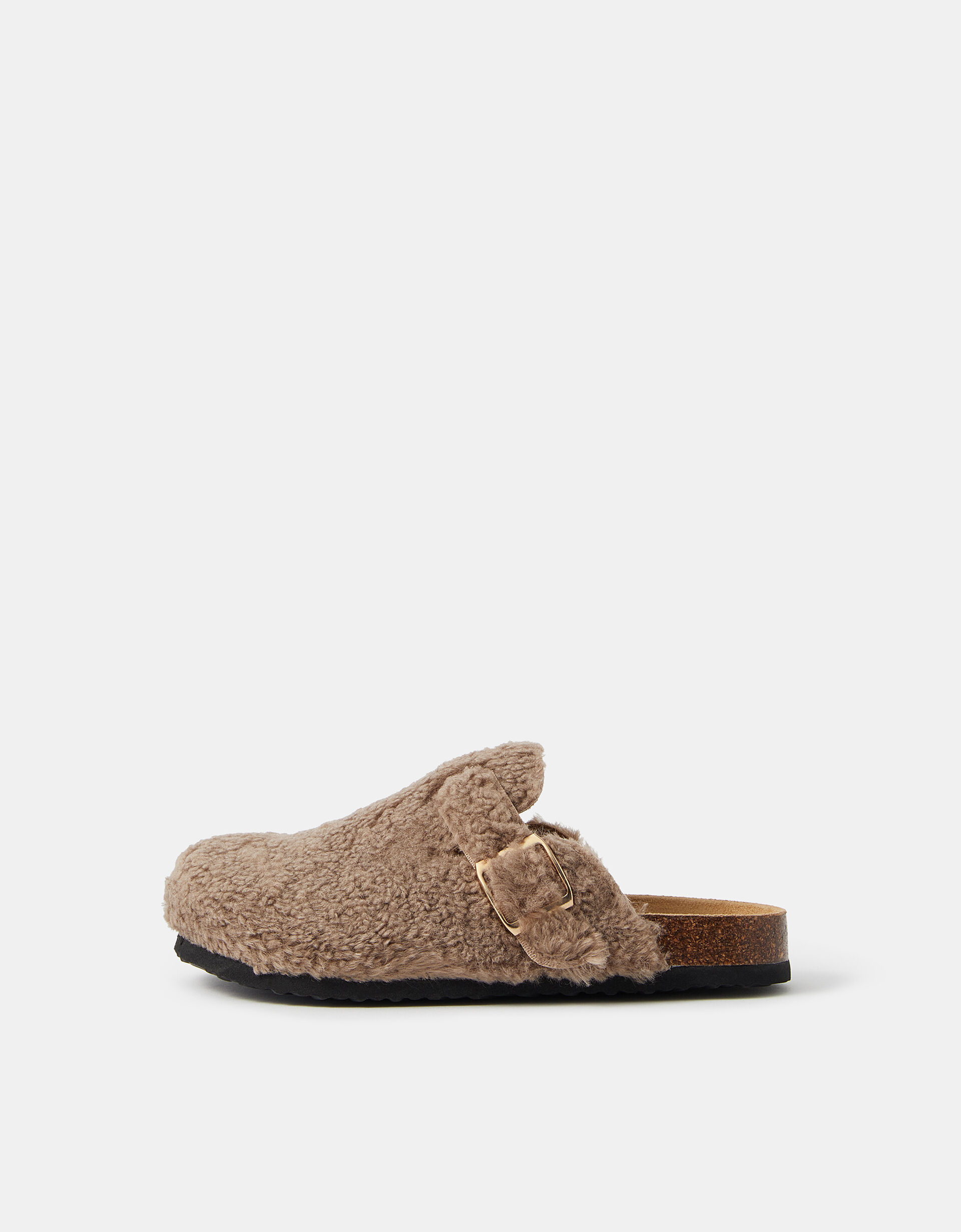 Slip into comfort with these cosy clogs. Easy to slide on, these slippers feature a borg fleece upper in a natural shade. Finished with gold-tone buckle detail. Natural