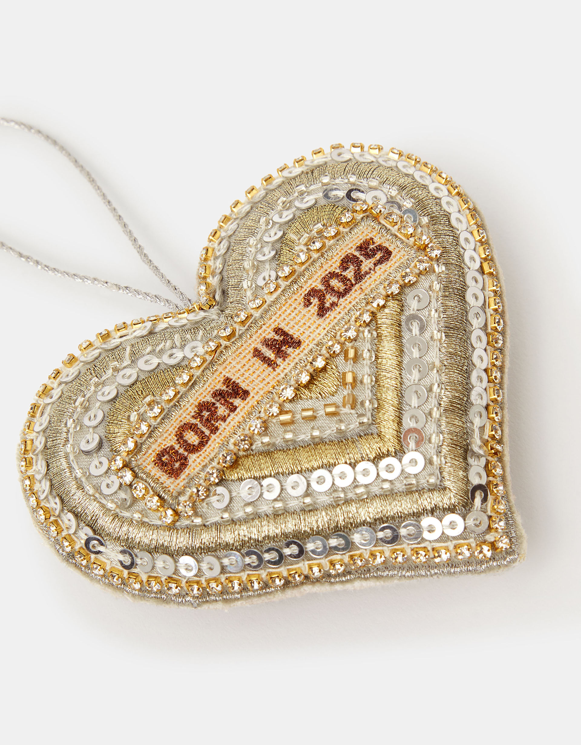 Remember the year your little one was brought into the world with this Christmas tree decoration. Shaped like a love heart, it’s embroidered with ‘Born in 2025’ amongst sparkly sequins and shimmery beads.