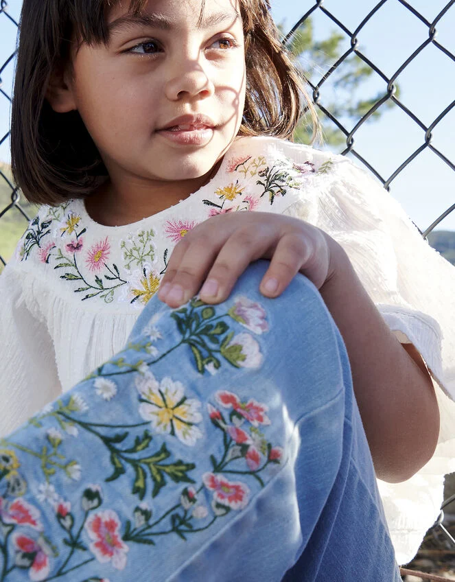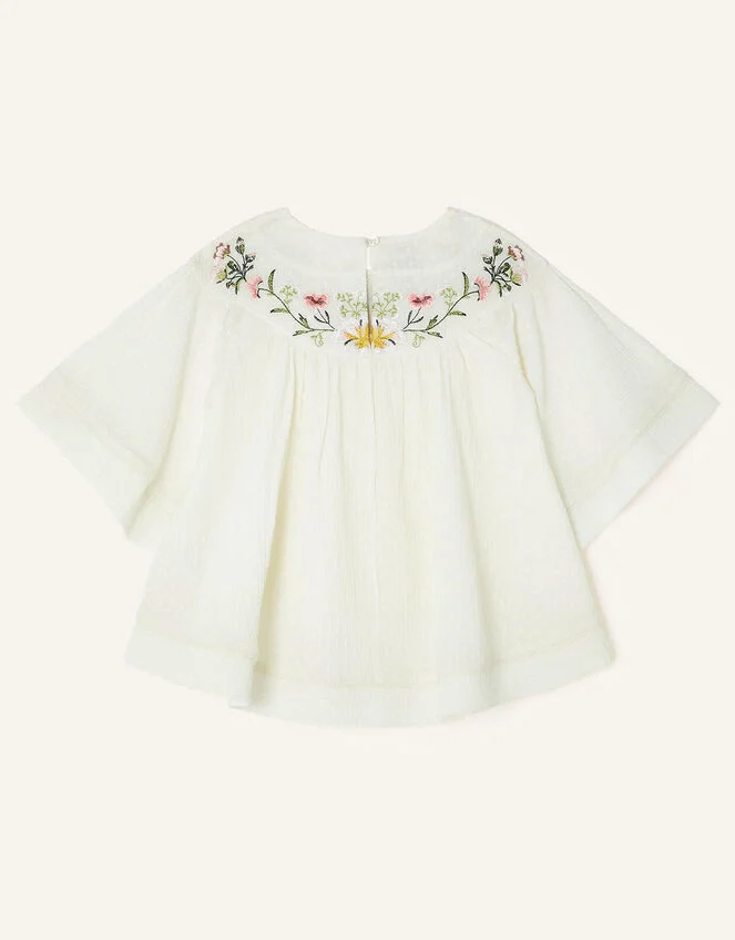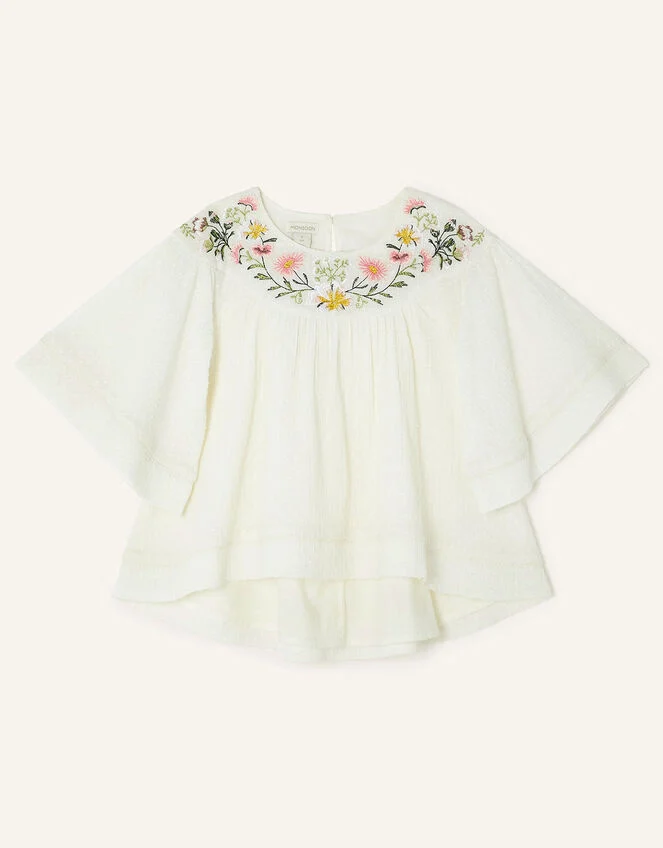 A touch of spring adorns this blouse, with embroidered florals aside the round neckline and a dobby texture throughout. The angel sleeves and relaxed fit will keep them cool at garden parties, simply style with a floaty skirt to complete the look. Ivory