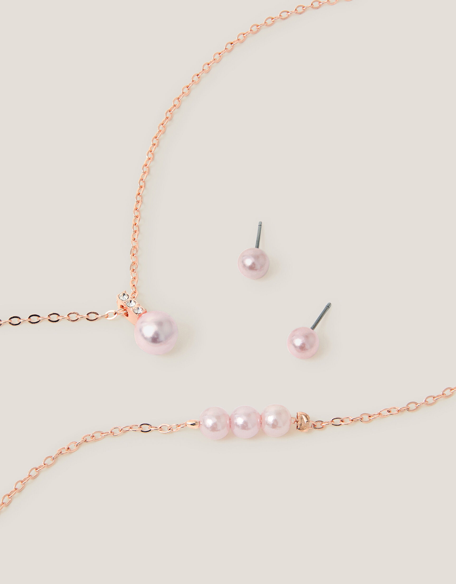 Extra special. Make sure they’re fully accessorised on their day full of duties with this set. Designed in silver-tone metal, it features a pearl pendant necklace, bracelet, and matching stud earrings. Non-refundable.