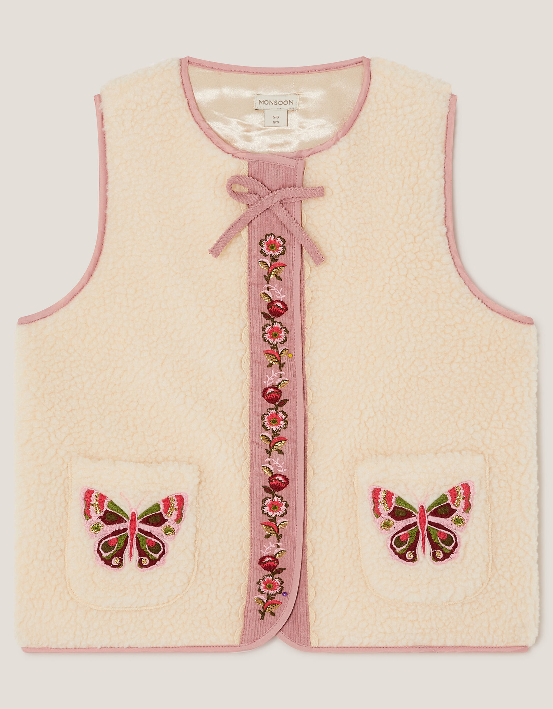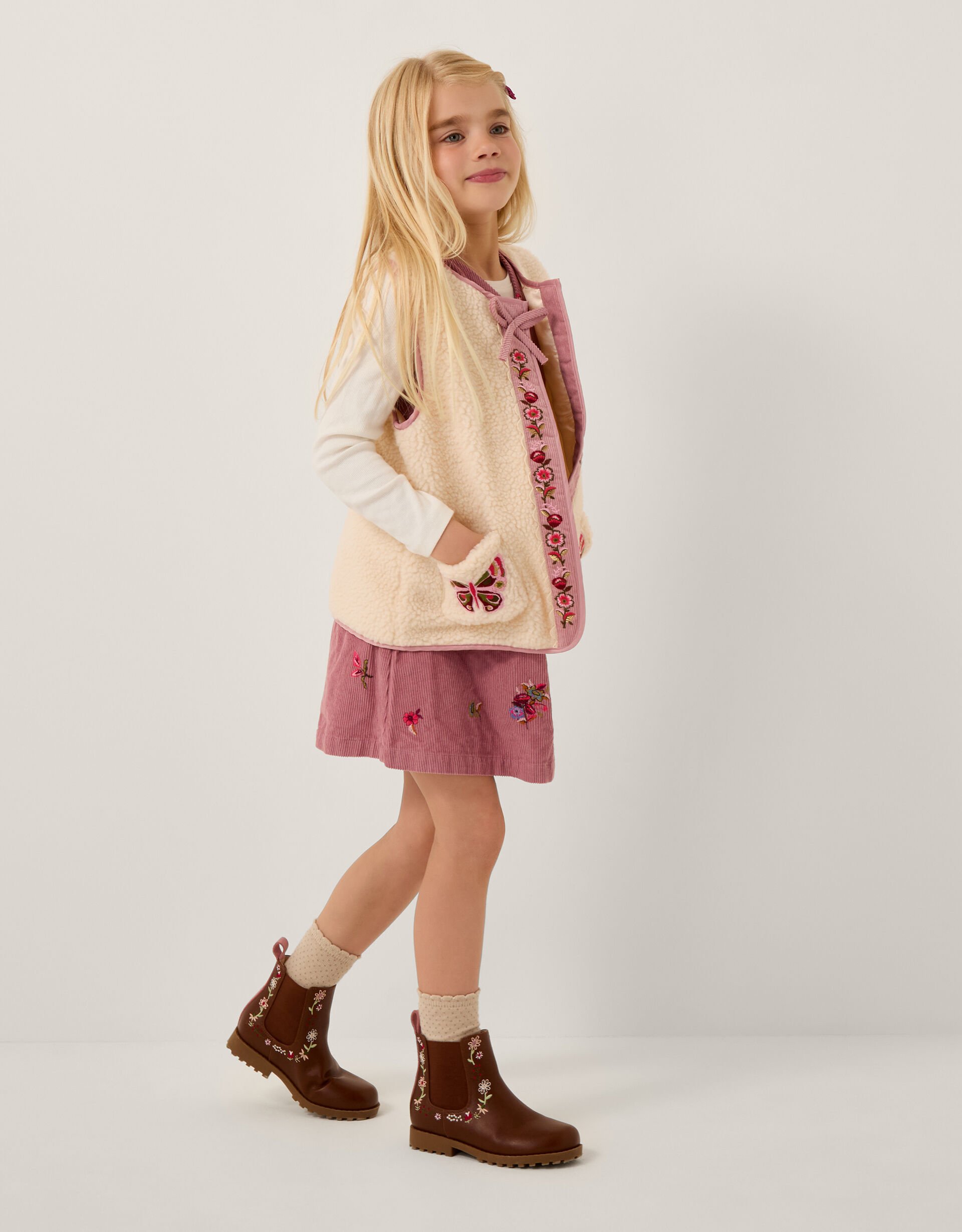 Simply the vest! The perfect layer for between-seasons styling, this gilet is made from a cuddly borg fabric with pink corduroy trims. Patterned with a daisy chain of embroidered flowers and fluttery butterflies on the patch pockets. Cute, right? Ivory