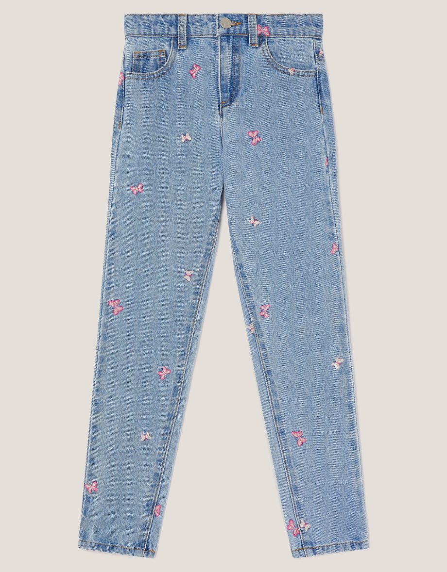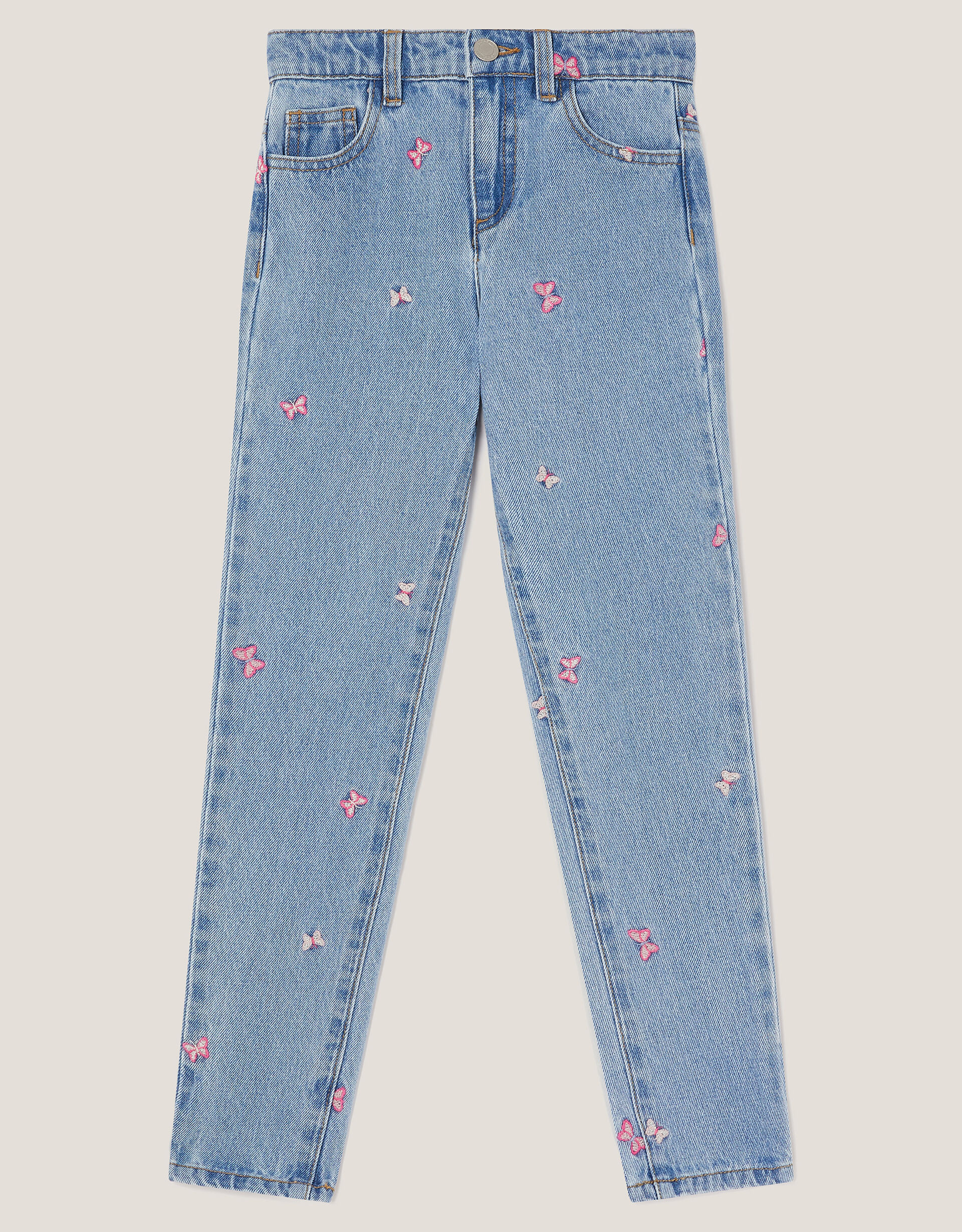 It’s all about the pretty details. Designed in a classic blue denim wash, these jeans boast a straight leg fit with pink fluttery butterflies embroidered all-over. Blue