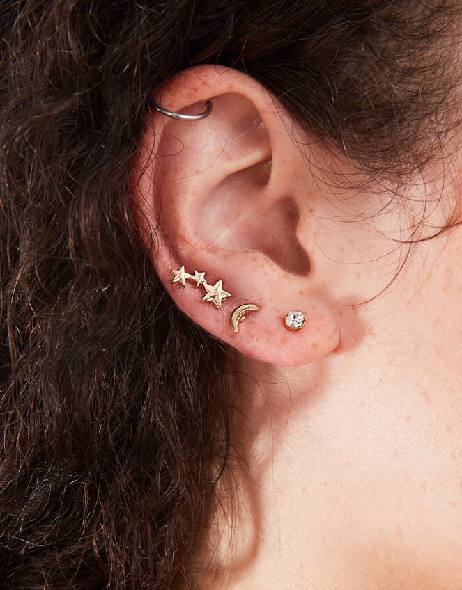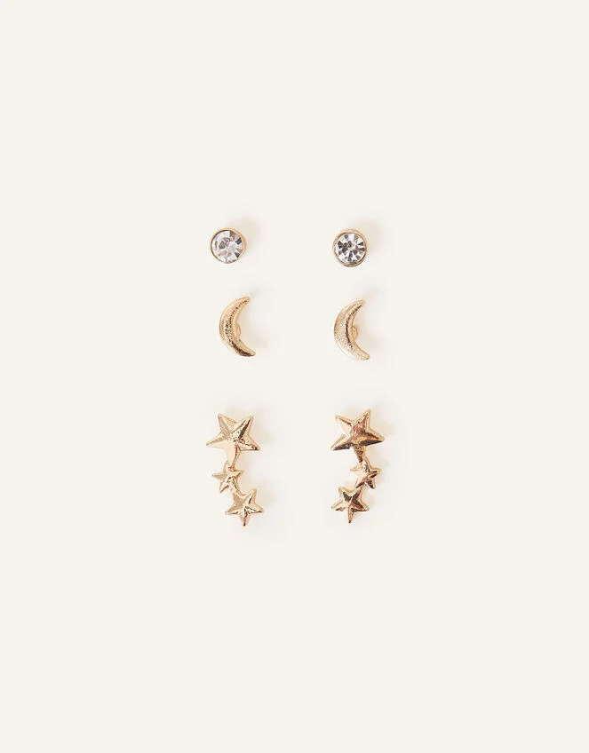 Pulled directly from the midnight sky, this earring set will channel celestial energy all day long. Created in gold-tone metal, they feature star and moon designs, with a little twinkling touch.