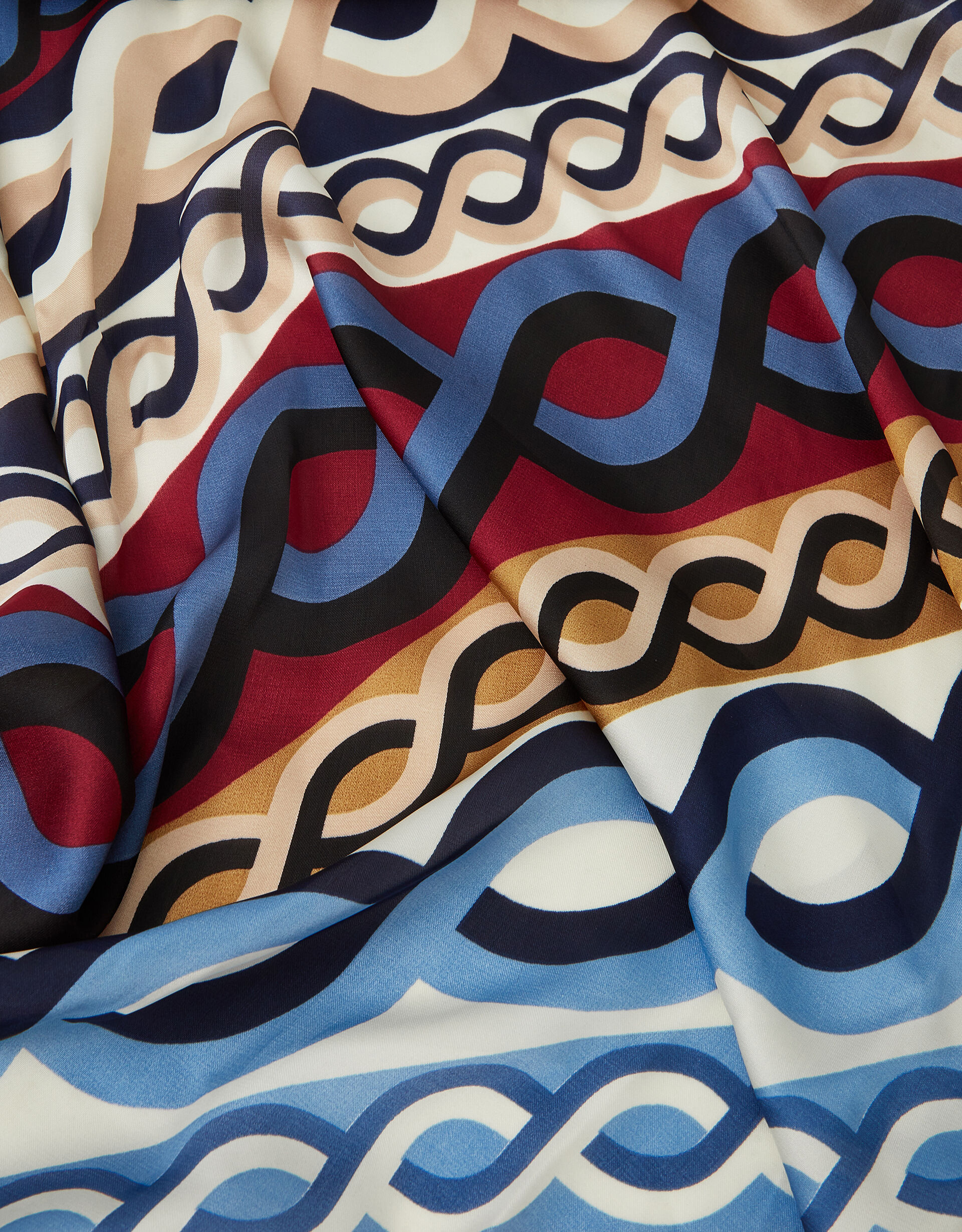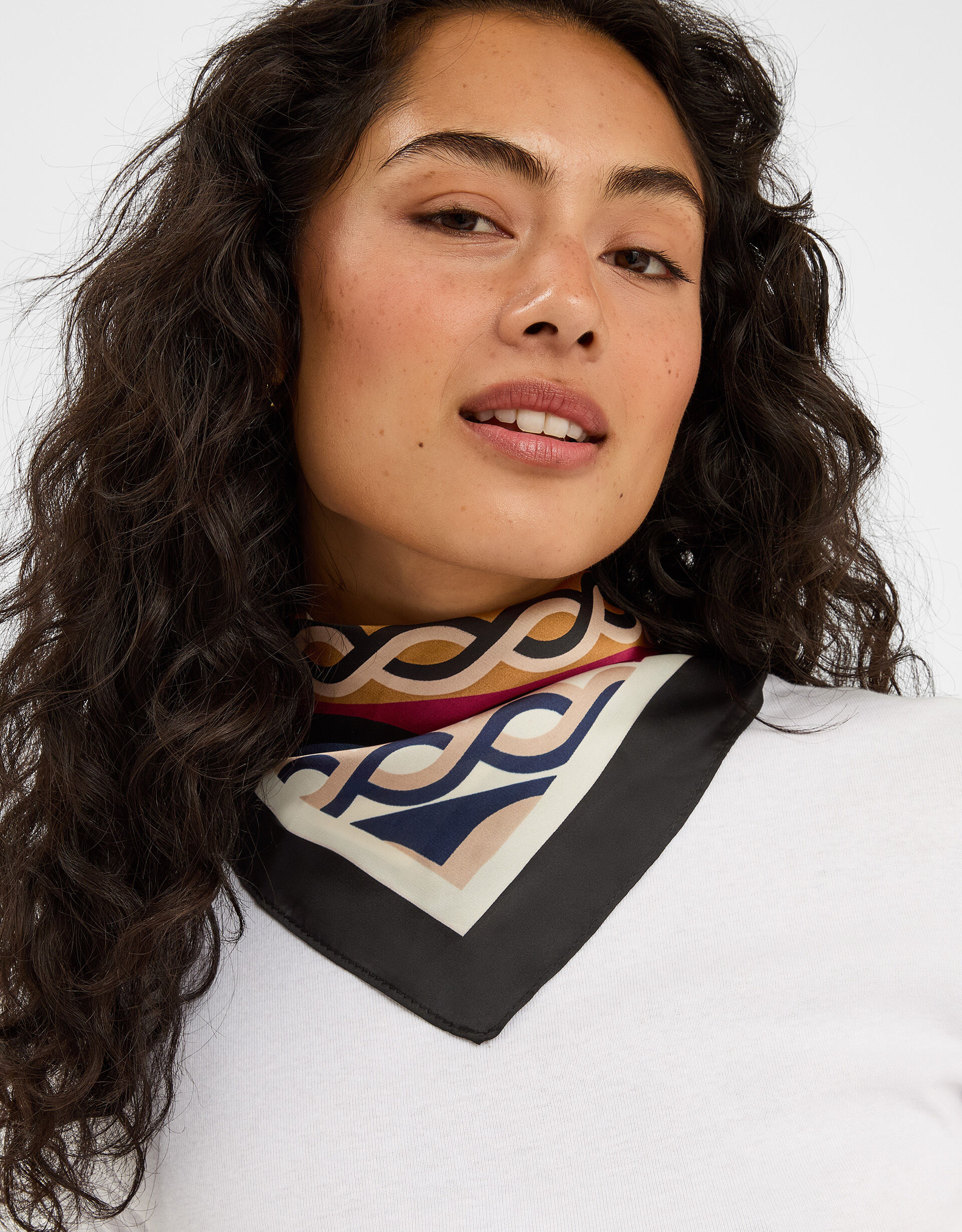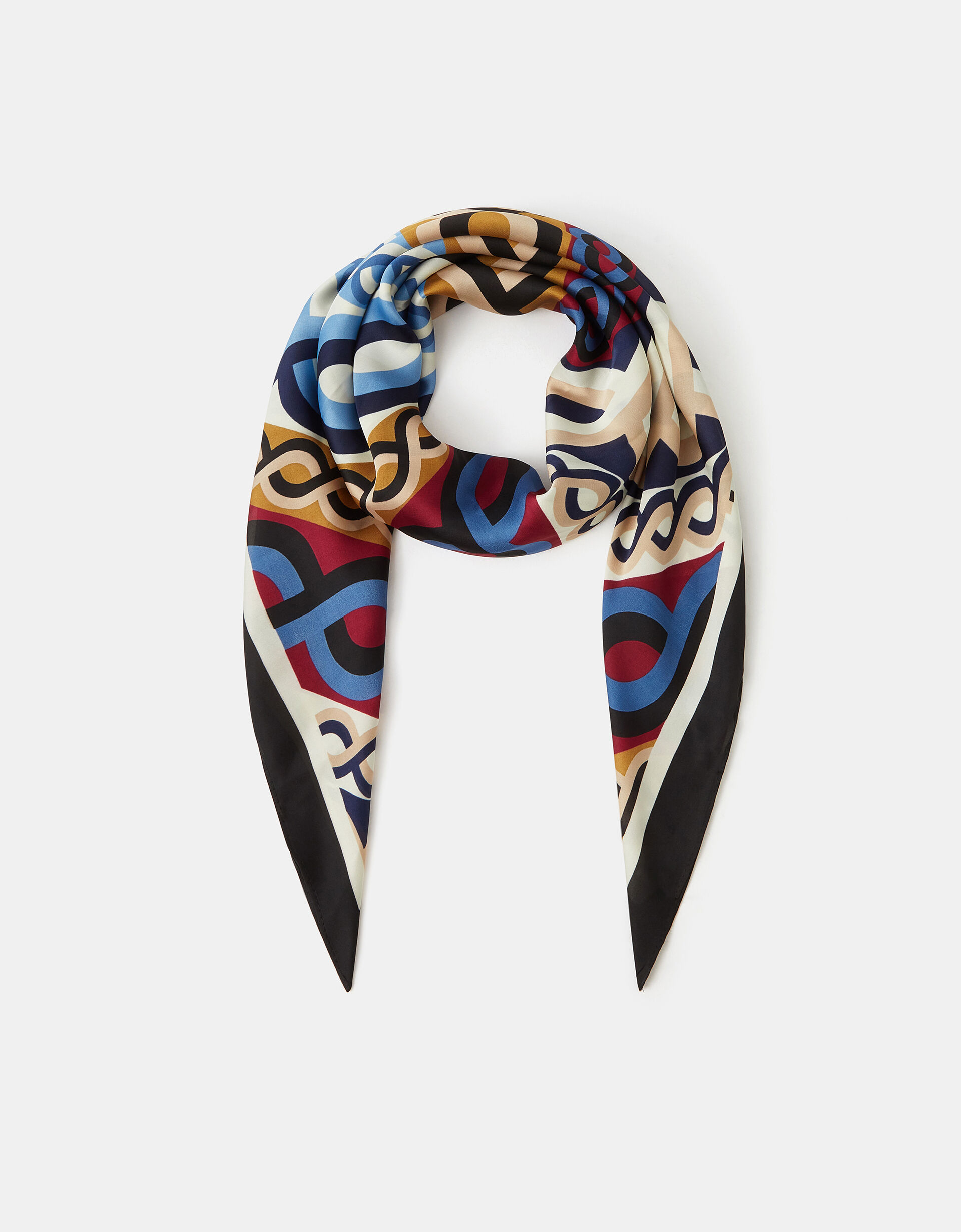 A fun way to add a pop of colour into all your ‘fits, this small square scarf is made from a soft satin fabric with a chain print in bold hues.