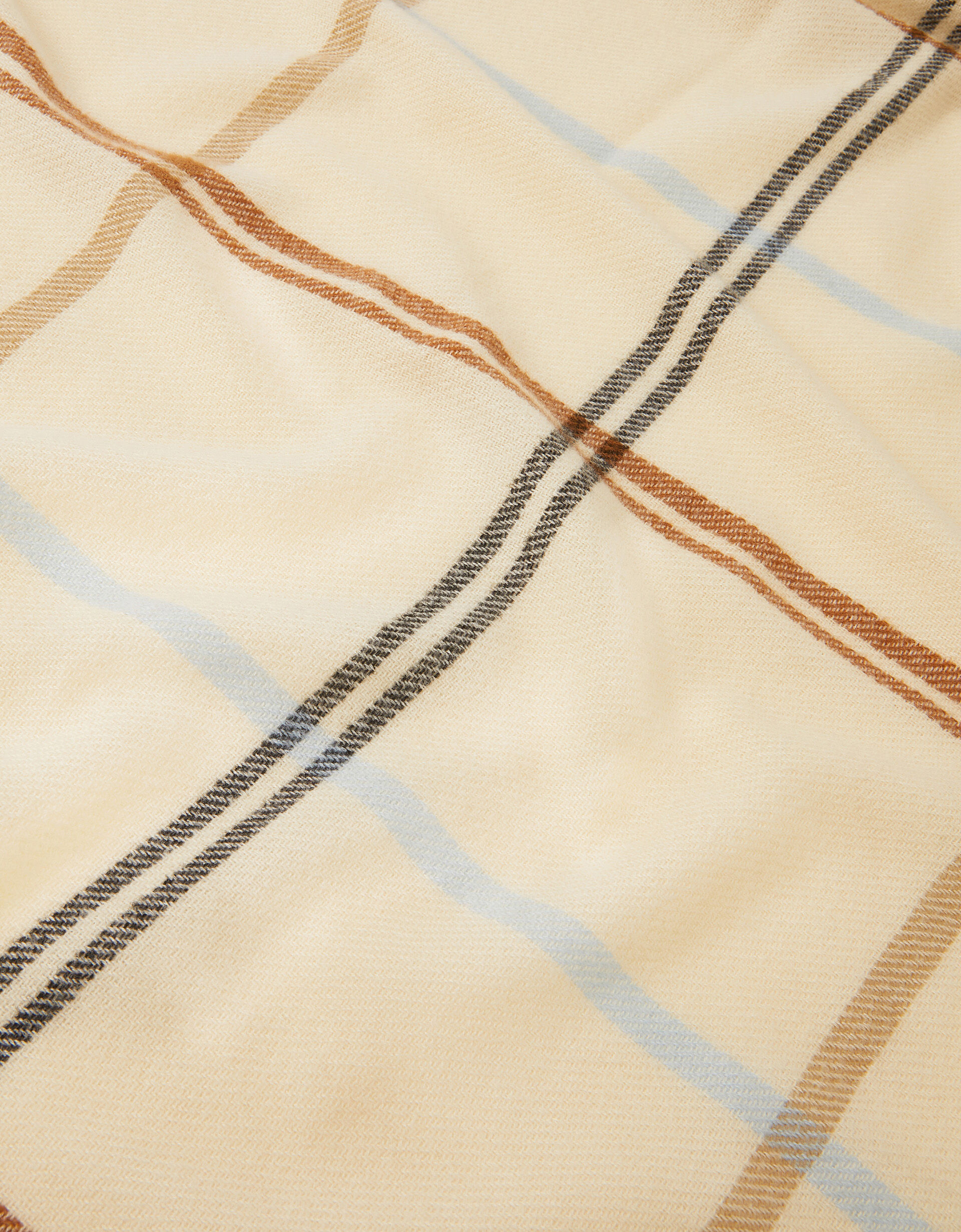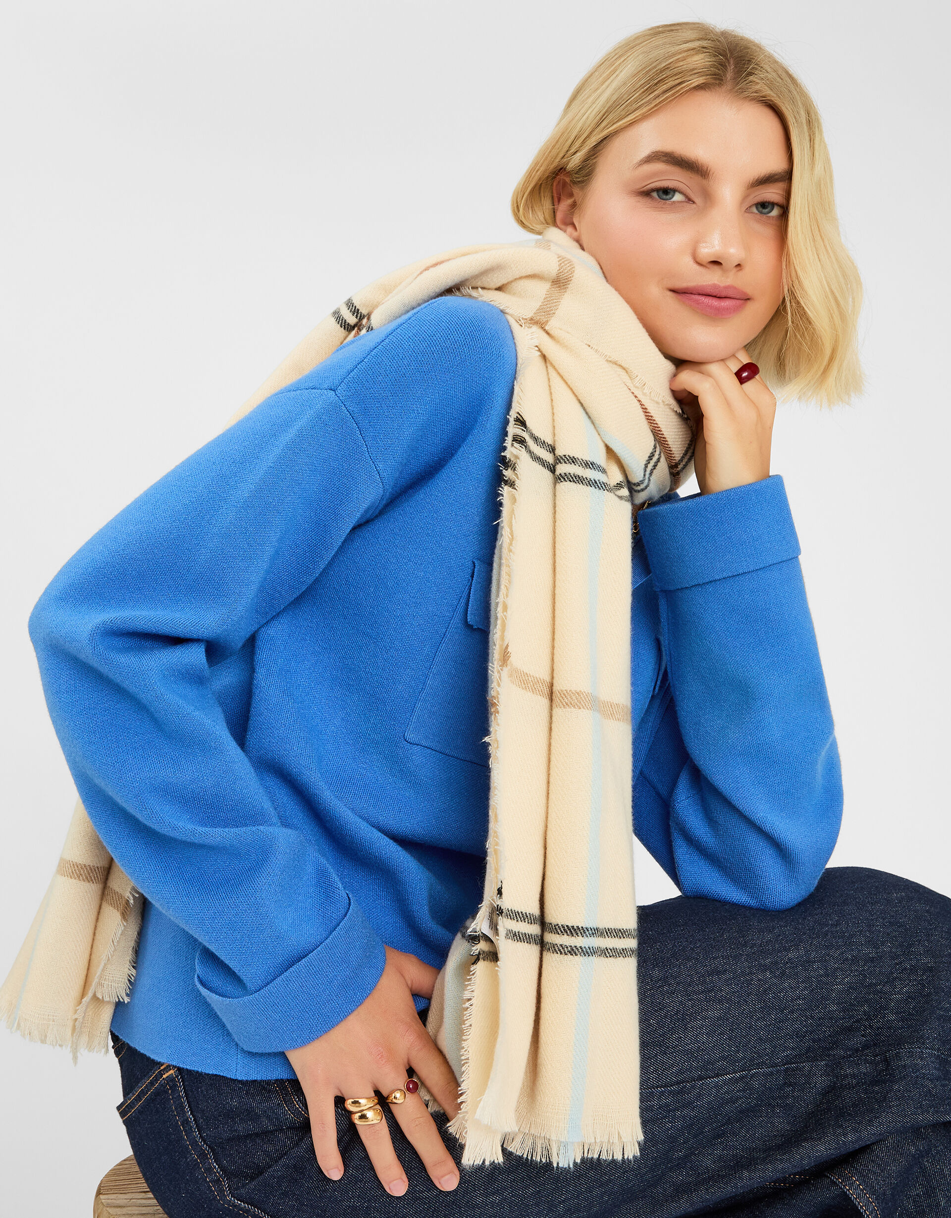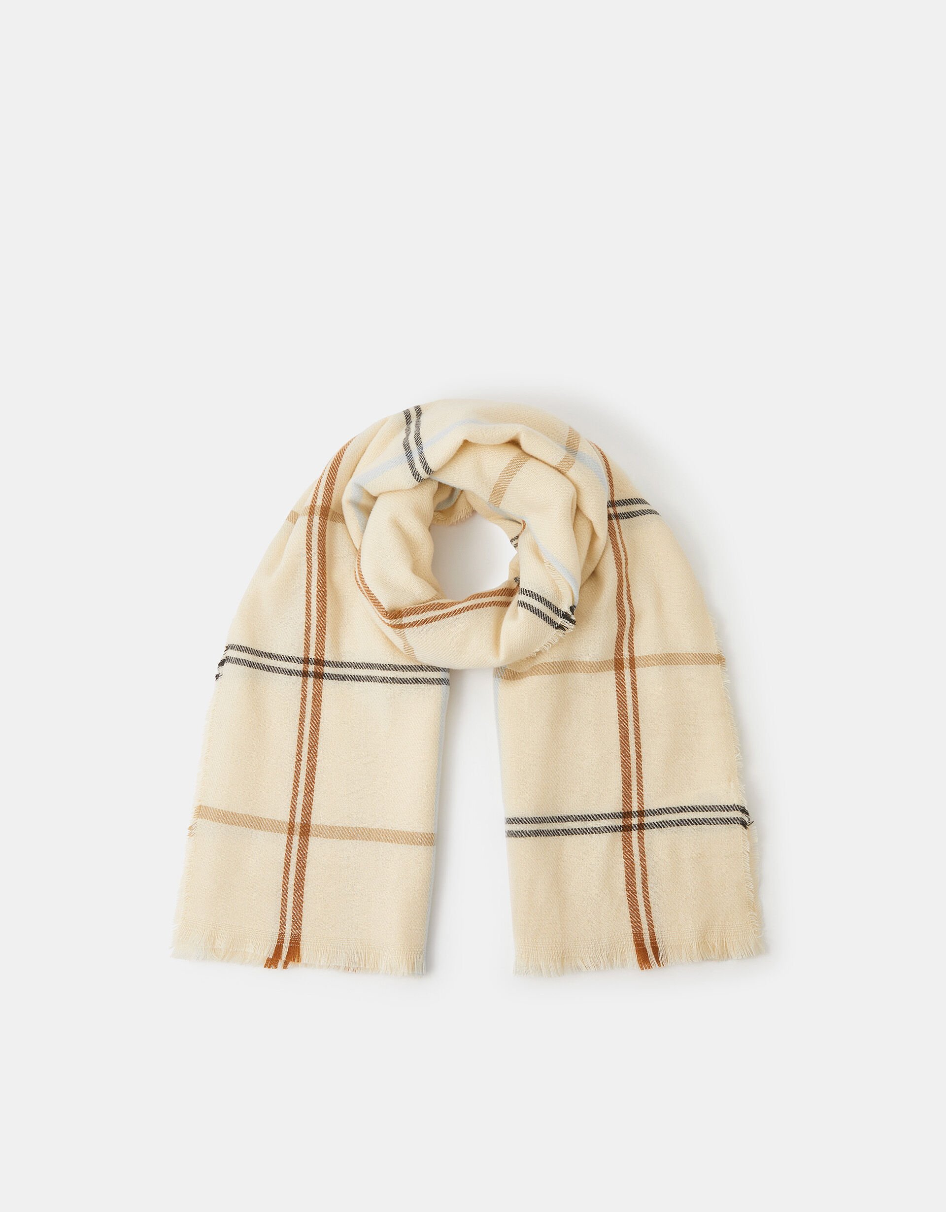 Picture you. Wrapped in this. With a pumpkin spice latte in hand… Woven with a wide check pattern in a mix of neutral colours, this blanket scarf is the perfect layer to go with all your winter outfits.