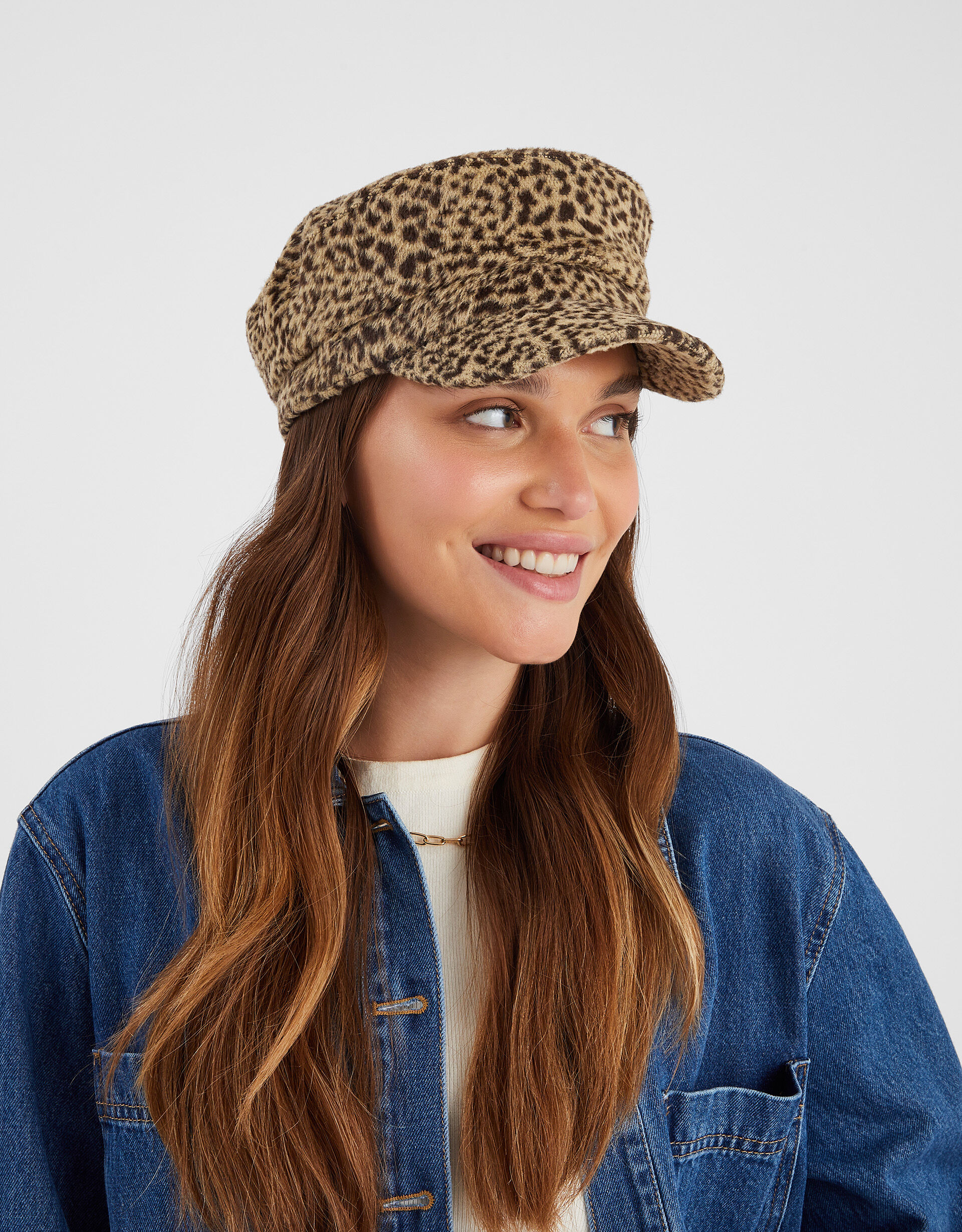 Prrrr! Meet the statement hat everyone will compliment. This baker boy cap boasts a cool cheetah print in a soft textured finish.