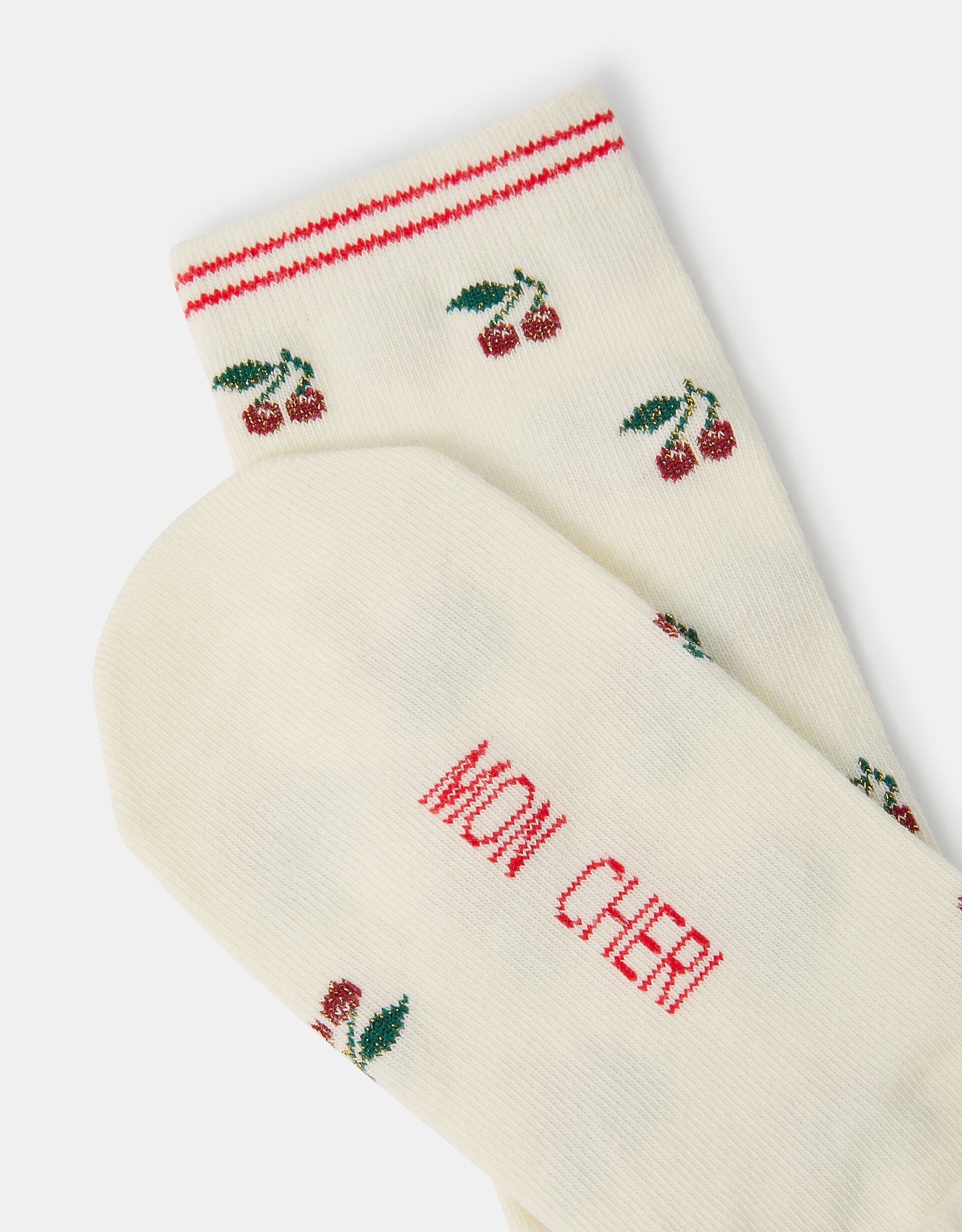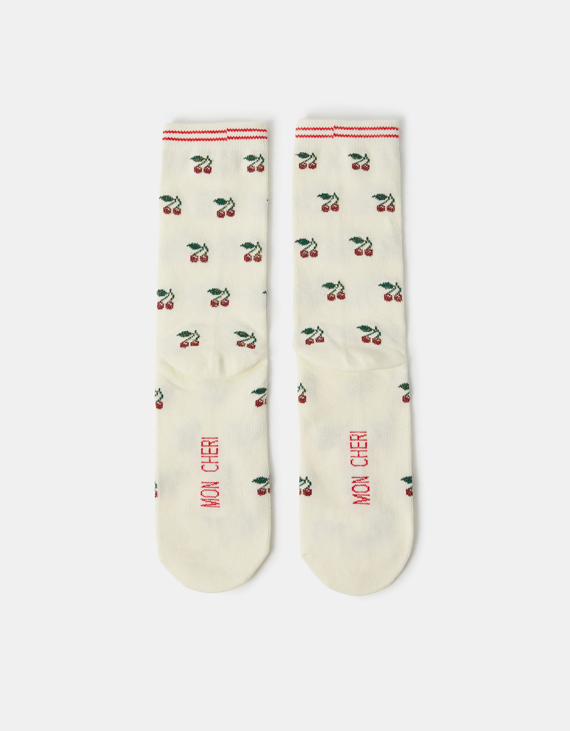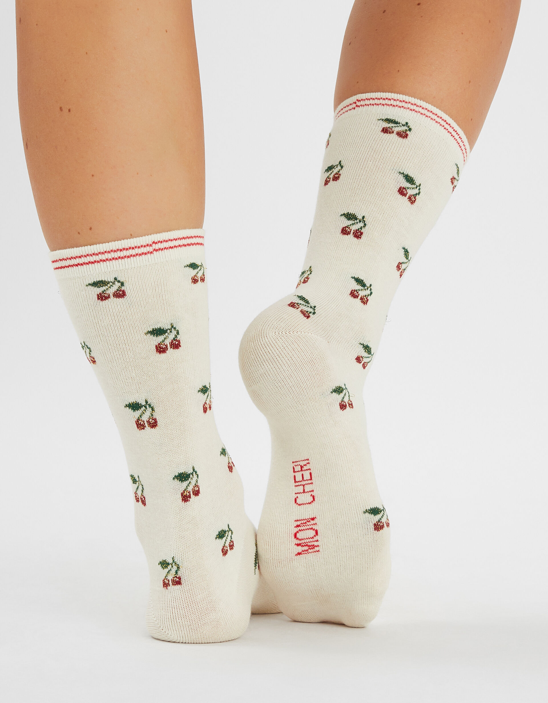 Spun in a super-soft cotton blend and patterned with adorable cherry motifs, these socks are a sweet addition to your sock drawer. Finished with ‘mon cheri’ stitched to the soles.