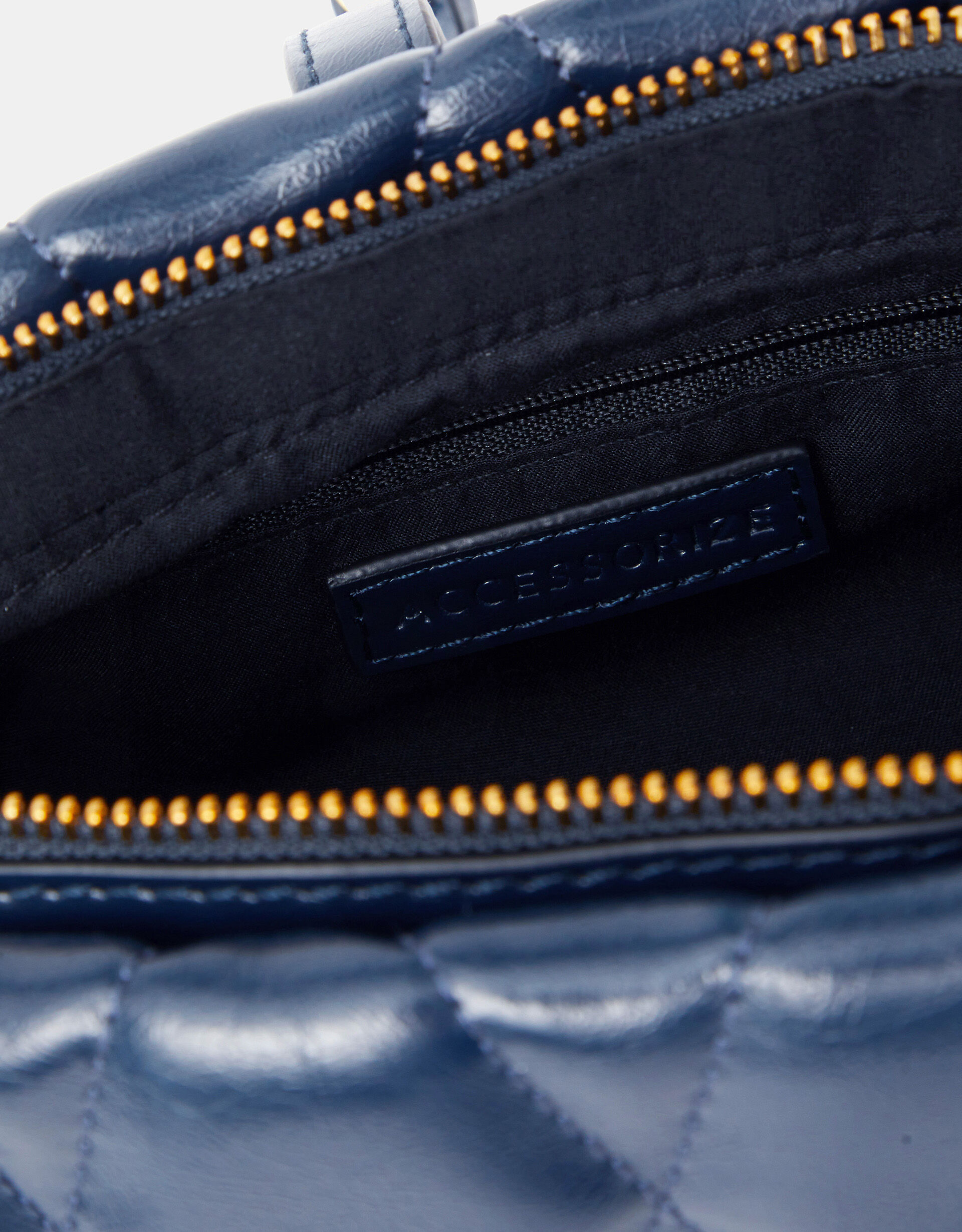 Like you, she’s versatile. Designed in navy faux leather with a gold-tone buckle strap, this bag offers a vintage vibe with the diamond quilted finish. Featuring two detachable straps, it can be styled like a crossbody or swung like a handbag.