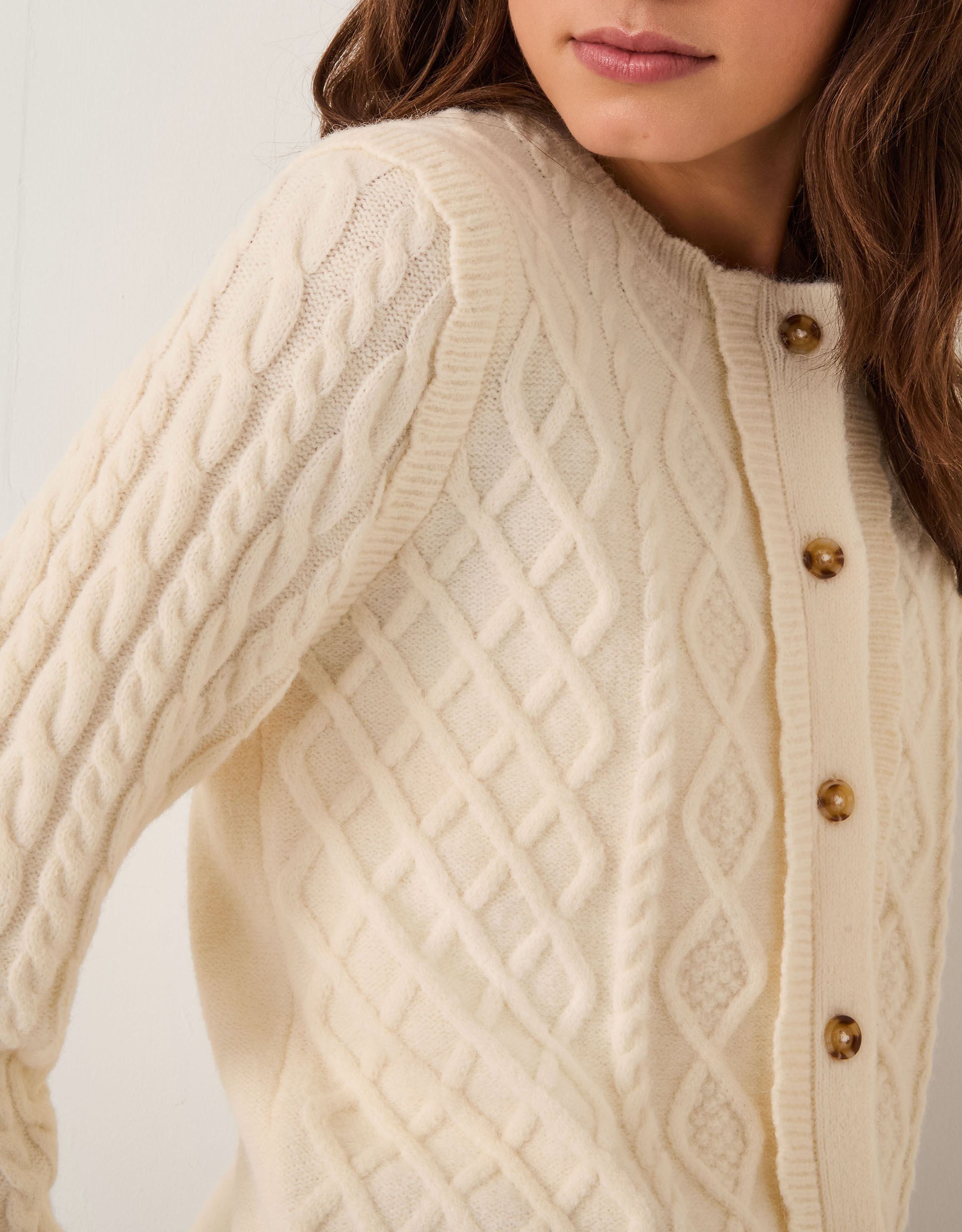 Enjoy the simple things in life. Knitted in a cosy blend, this cable knit cardigan is a timeless staple you can layer over all your winter looks. Finished with scalloped trims and tort buttons, it’s the perfect balance between comfort and style. Ivory