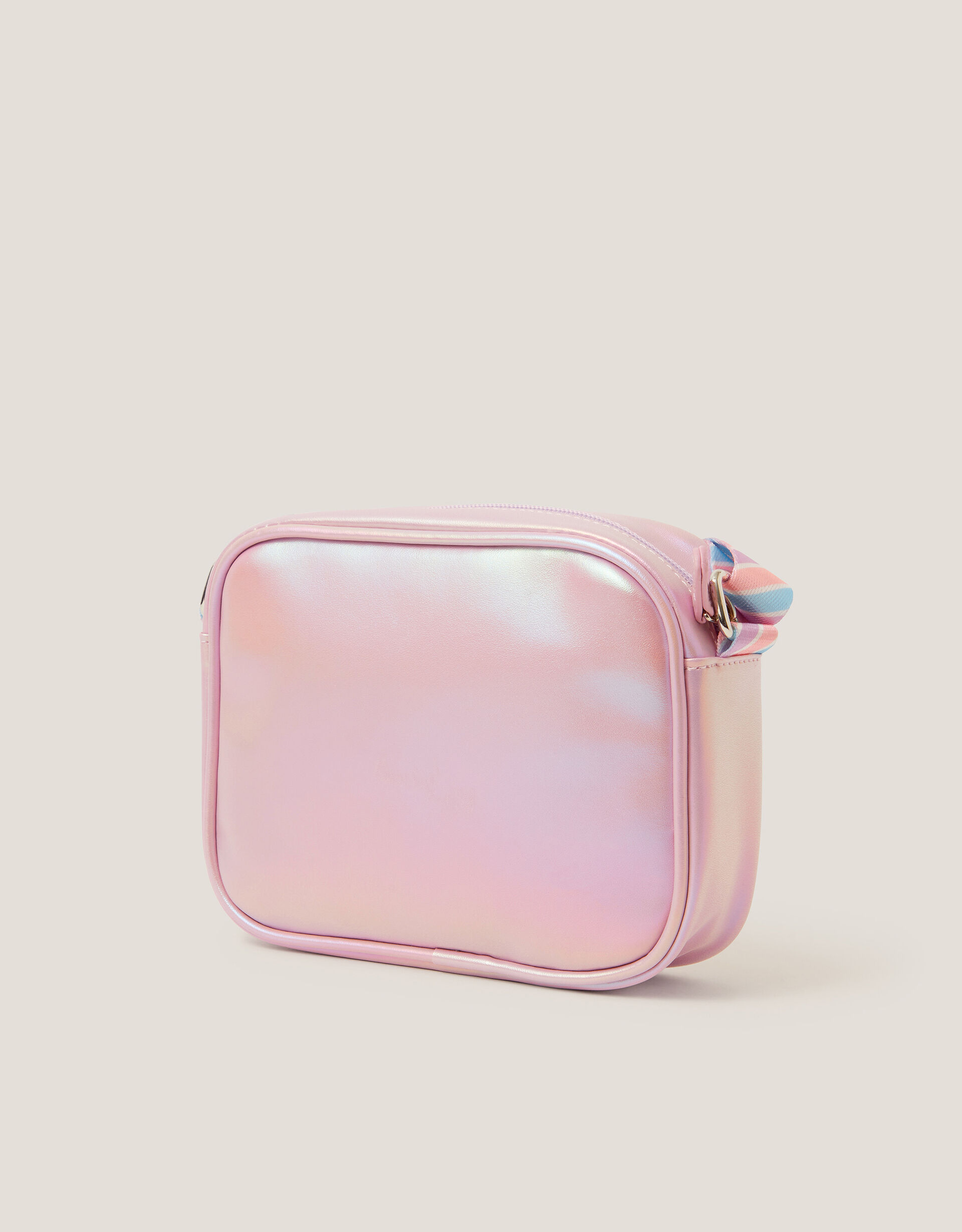 Carry a little love everywhere! Designed in shimmery pink, this bag showcases a cut-out heart filled with colourful confetti and pearly beads. Features a zip fastening and adjustable striped crossbody strap.
