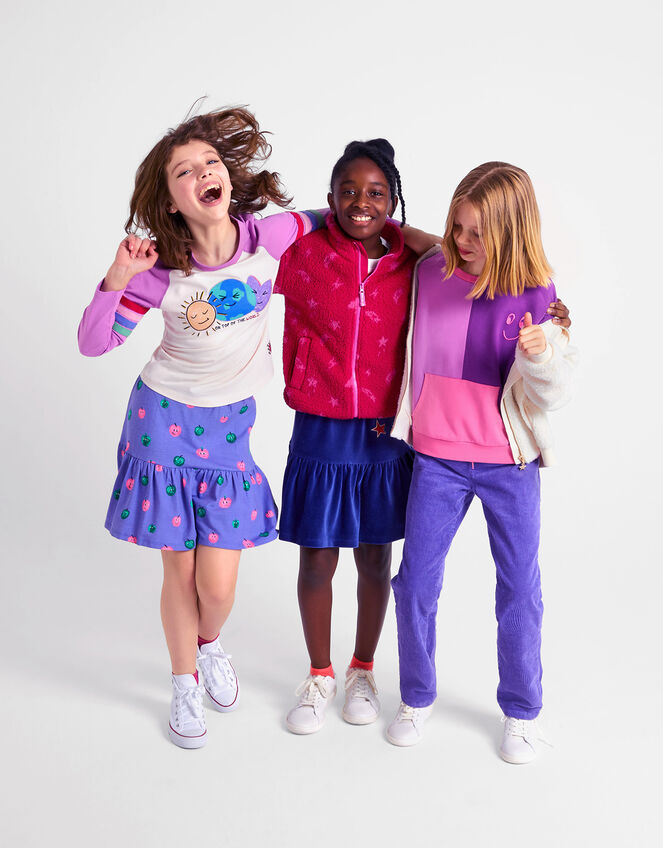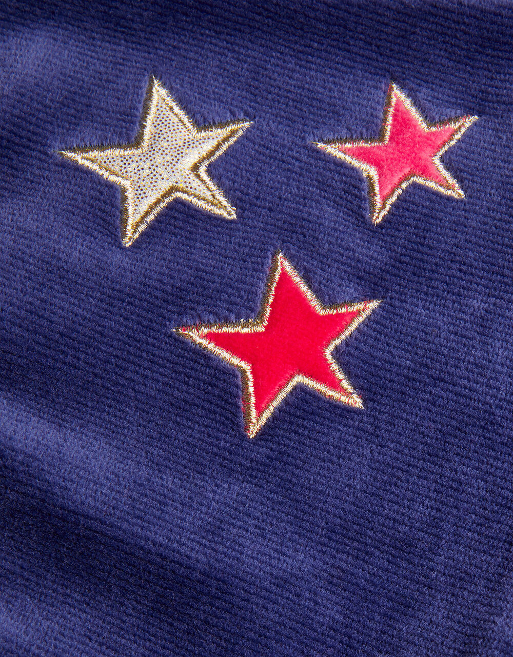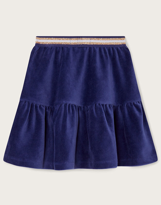 Dance with the stars. With tiered detailing for plenty of movement, this velour skirt is cast in a simple navy blue with embroidered stars to the front. They sparkle with gold metallic accents, matching the elasticated waistband for a super comfortable fit. As part of the journey to make our clothes kinder to the world around us, this item was made using more sustainable raw materials, such as organic cotton, recycled polyester and viscose from responsibly grown forests. Blue