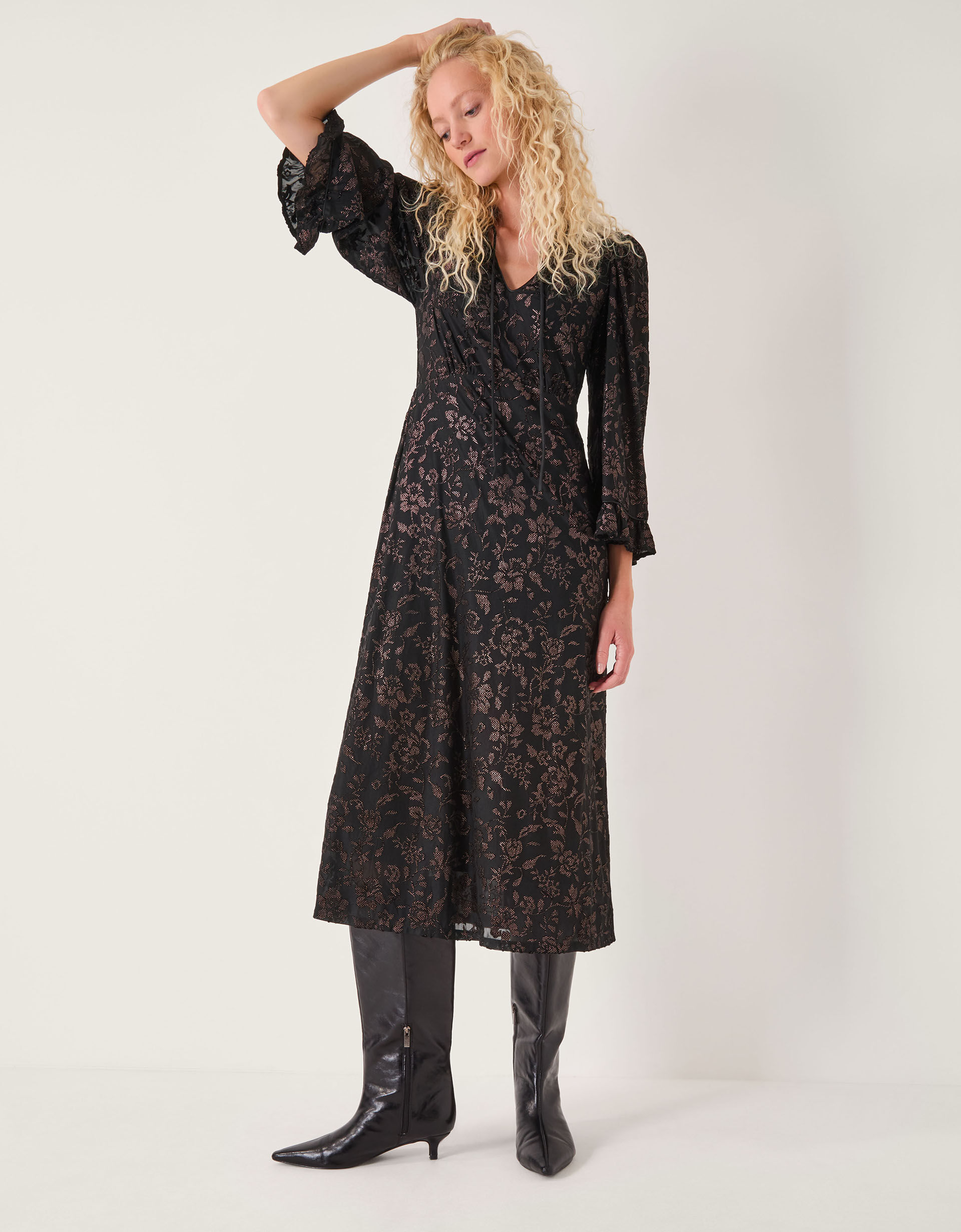 Let’s meet at 8. Decorated with glittery florals, this midi dress is made for dinner dates and cocktail sipping with the girls. Designed with floaty, ¾ sleeves and a tie at the neckline, it’s devoré print is sure to catch everyone’s eye. All you need are some pointed boots! Black