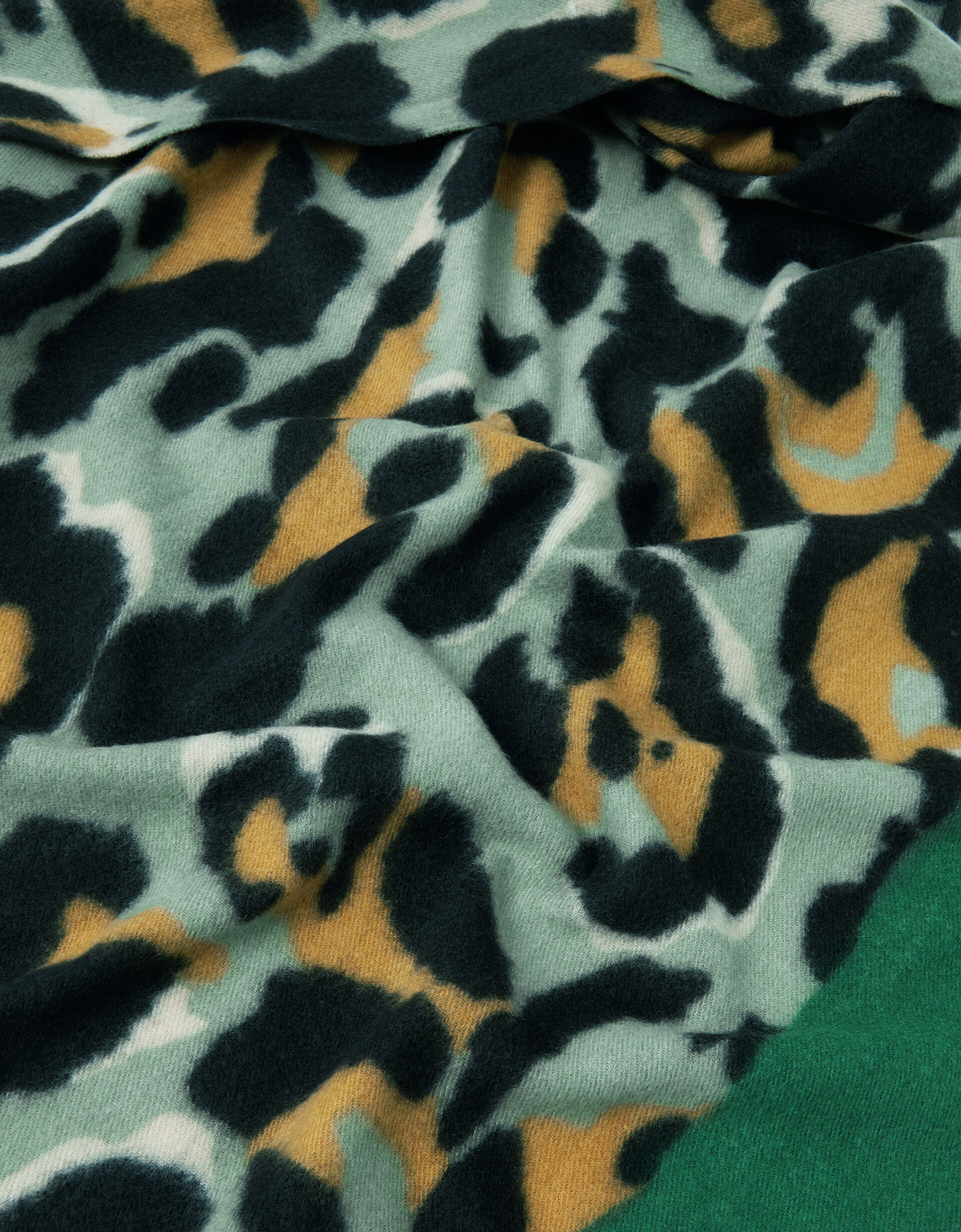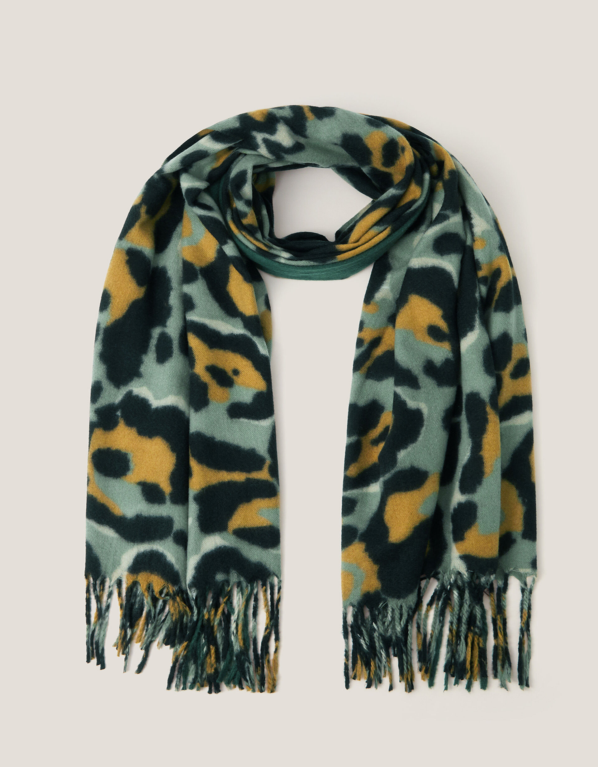 Purrr over Brrrr. A fun way of adding a pop of pattern into your winter looks, this scarf is cloaked in animal spots with classic tassel trims. Green
