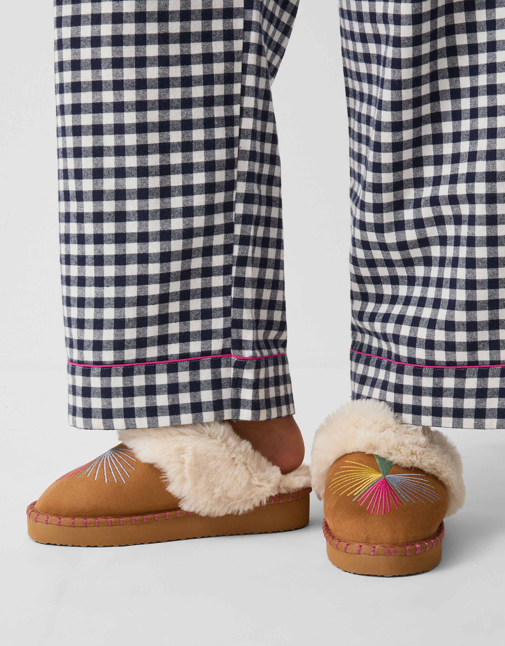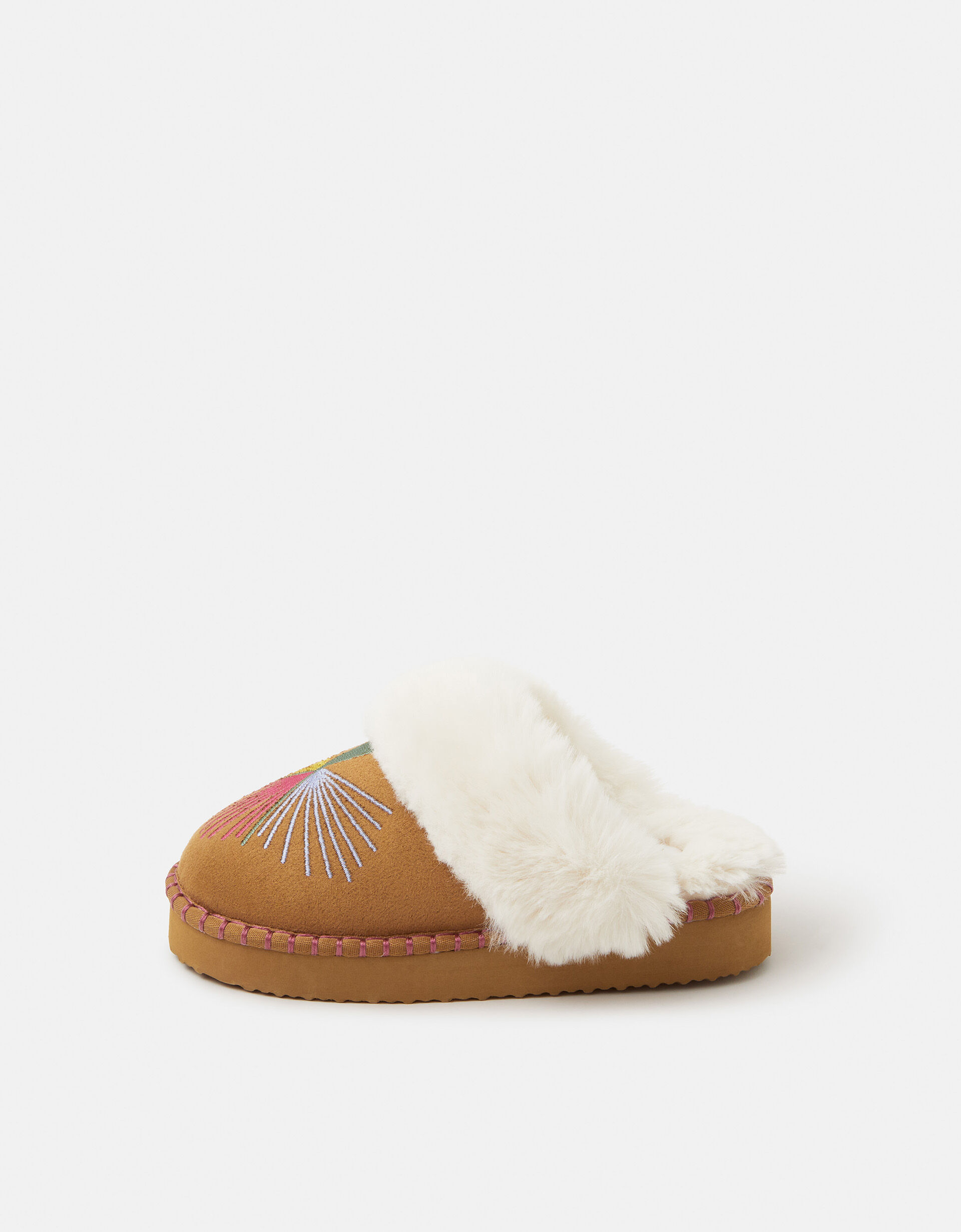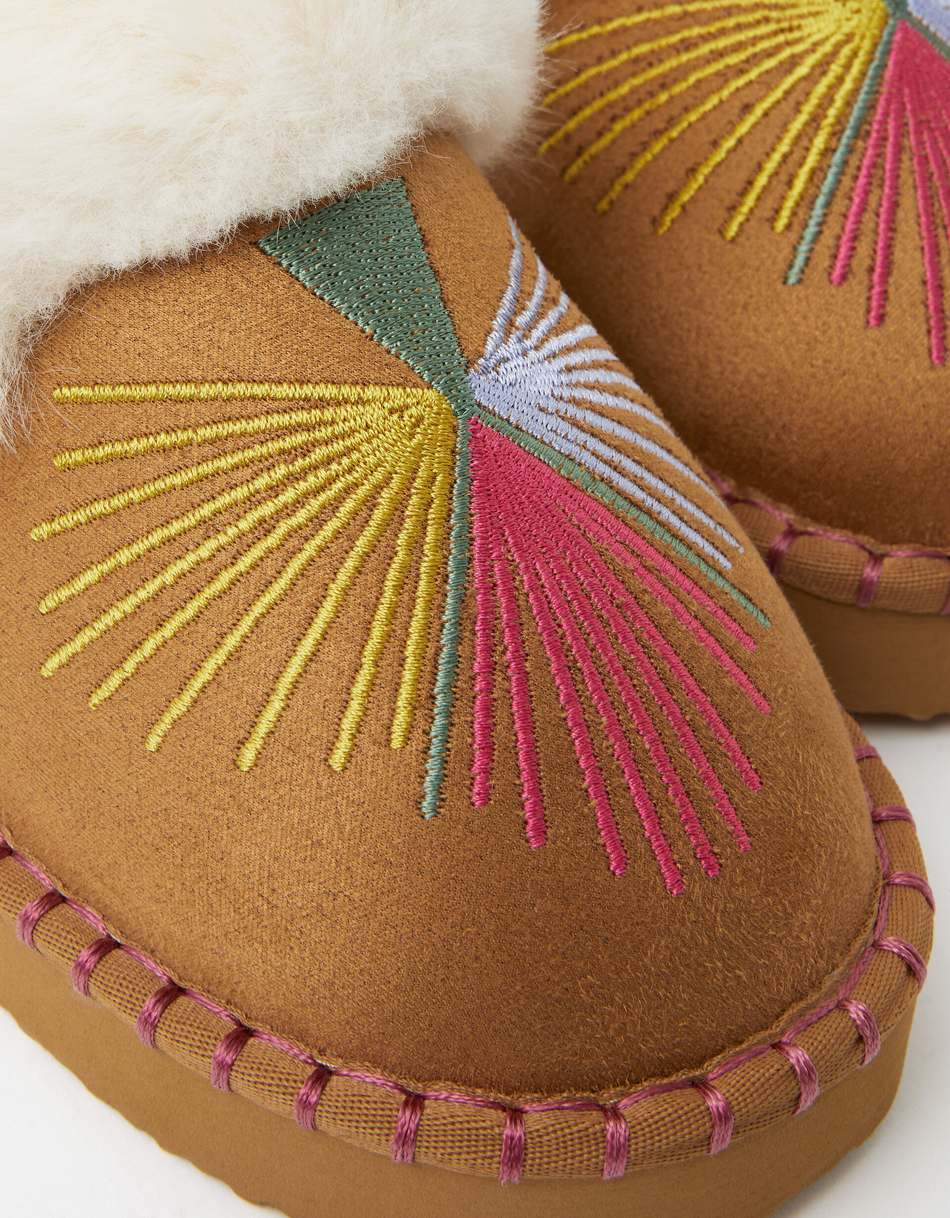 Why not slip into something a little more cosy? Made from tan suedette with a super-soft faux fur lining, these slippers are decorated with a burst of colourful embroidery on the closed toe design. Perfect for nights-in, lazy mornings and general mooching around the house. Multi