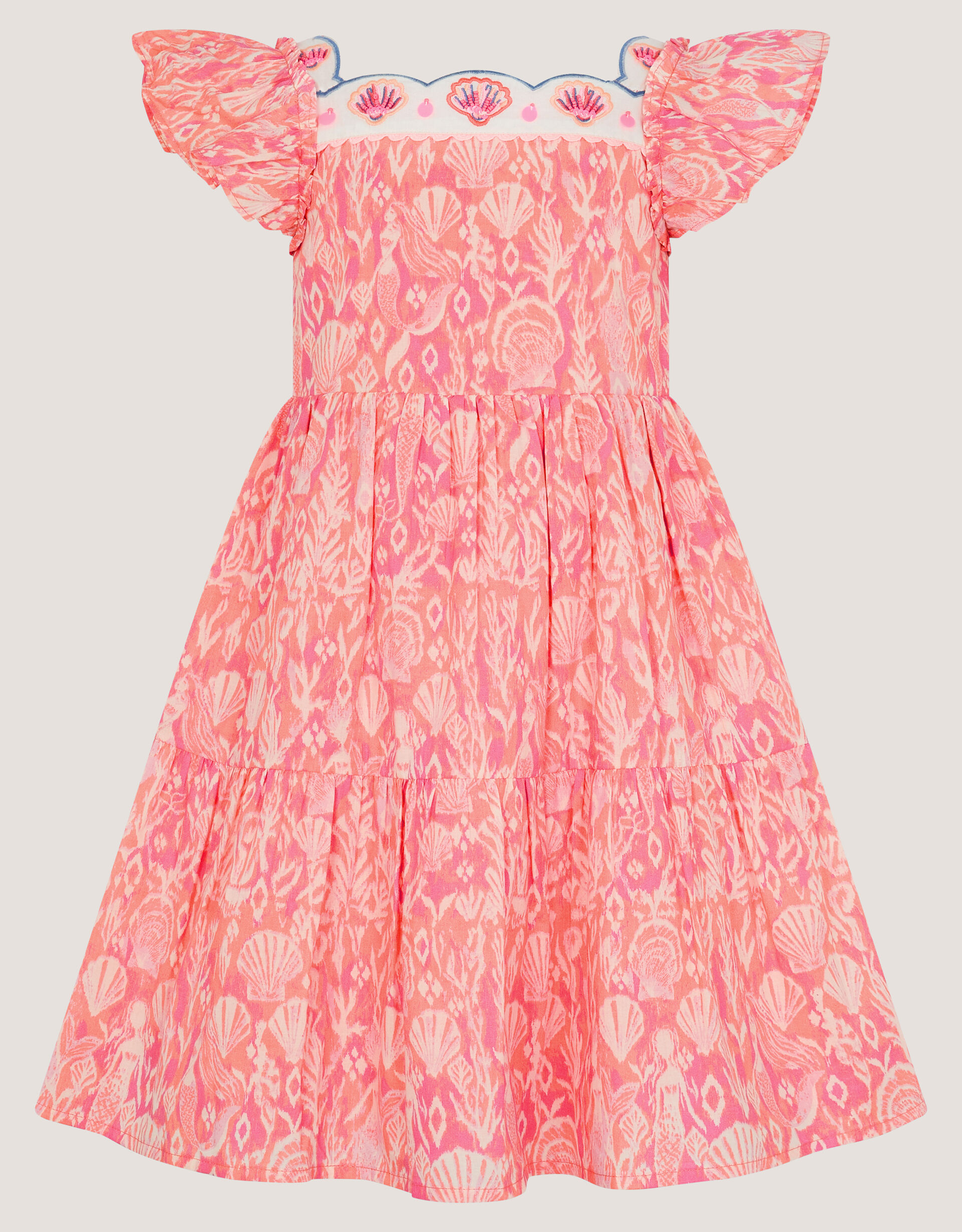Ariel-approved. Soaked in dreamy coral colours and patterned with mermaids and seashells, this dress is made for summertime. Finished with frilly sleeves, a swishy tiered hem and embroidered neckline.