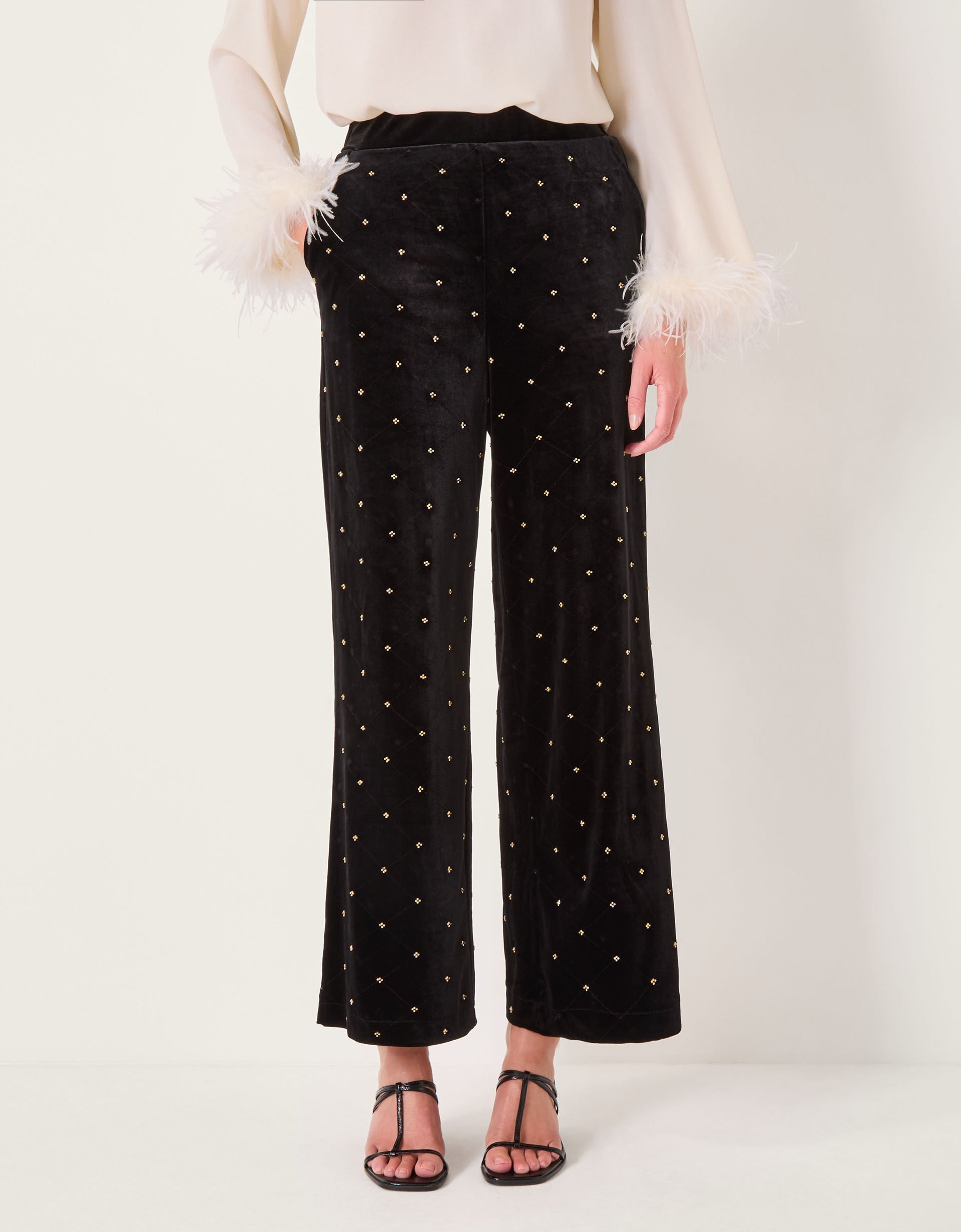 It’s velvet time, baby! A top contender for party season, these trousers make a statement with every stride. Designed in velvet with a lightly quilted finish, the wide legs are embellished with clusters of gold beads for a touch of sparkle. Black