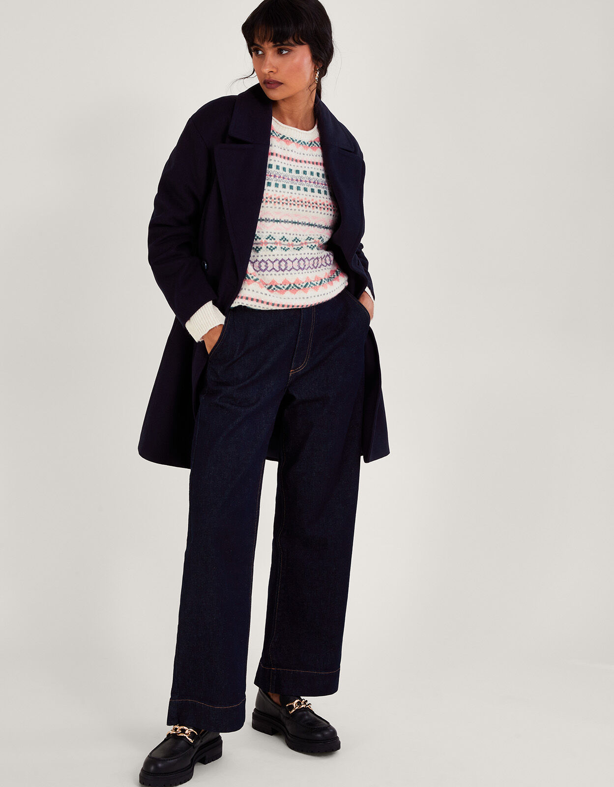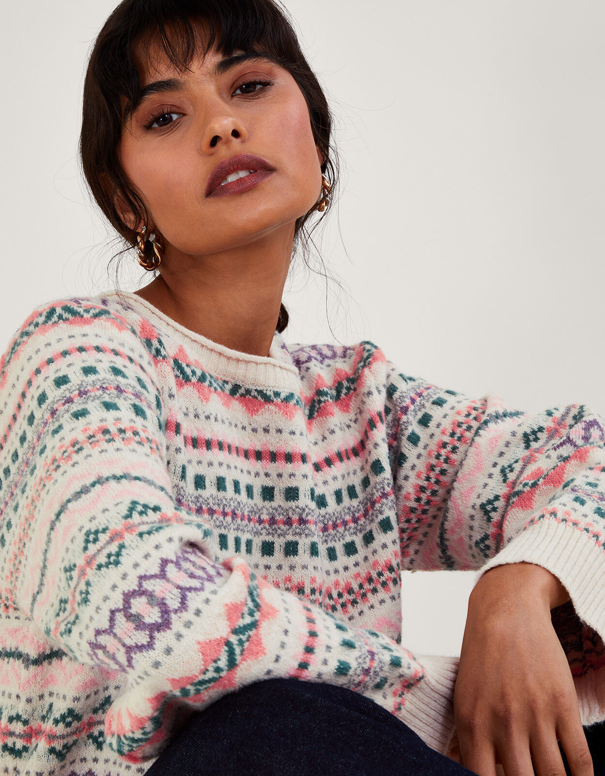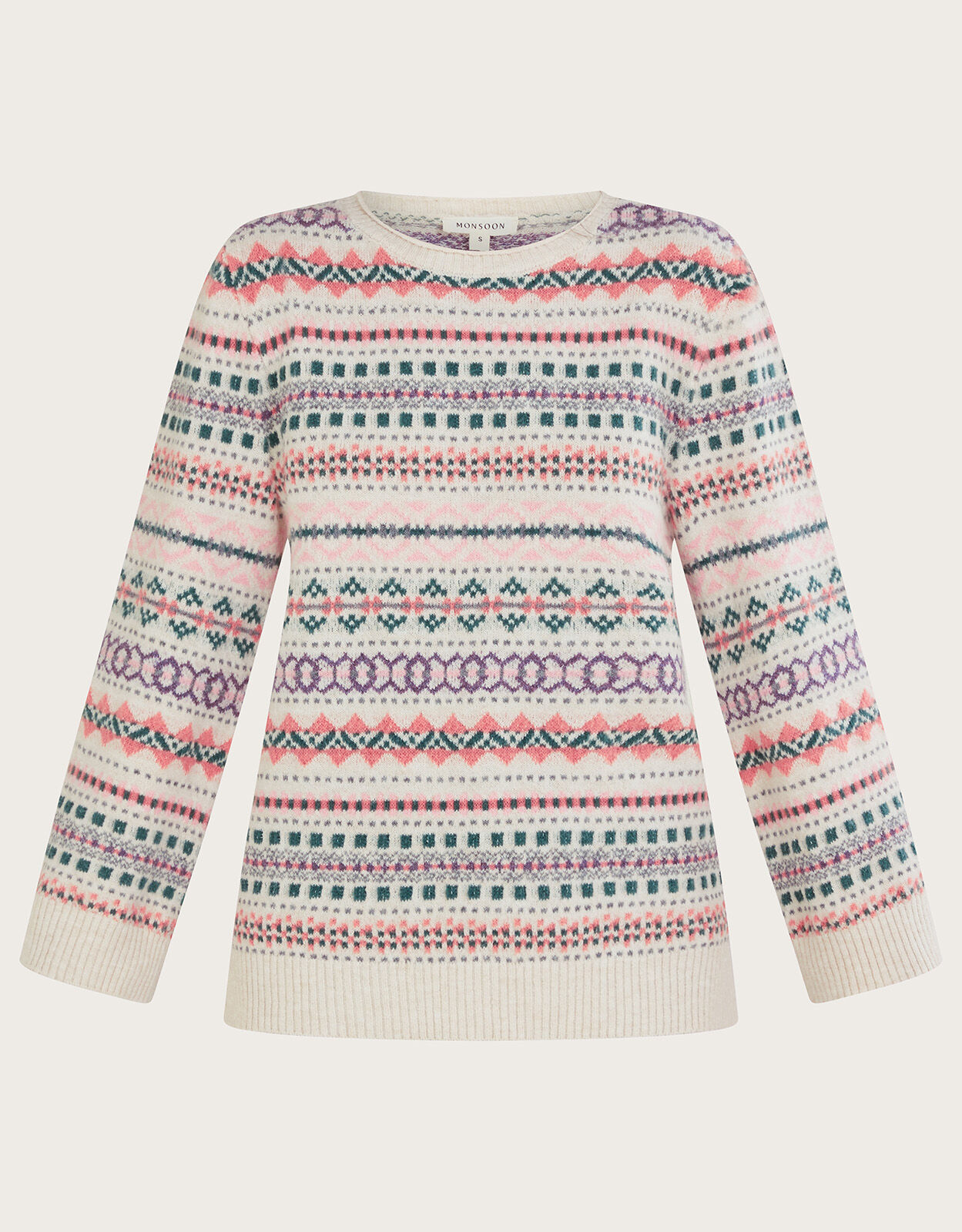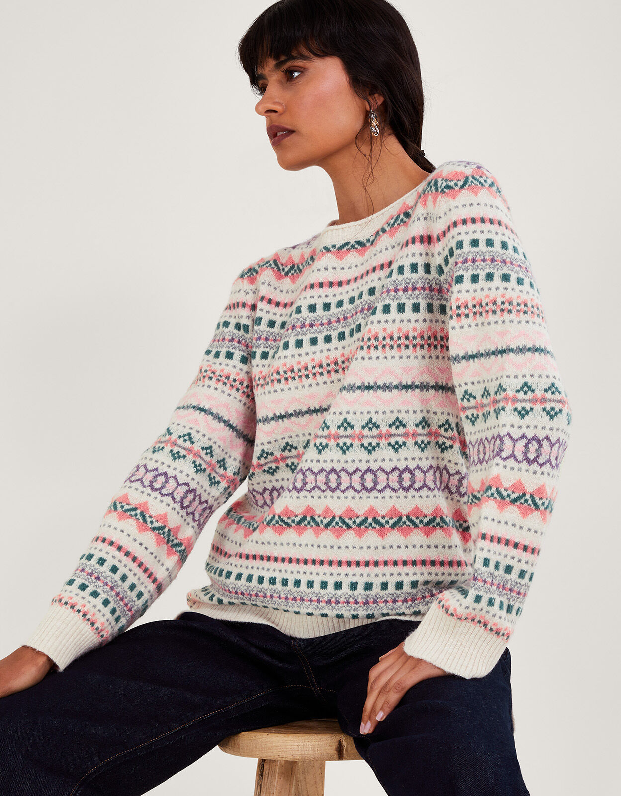 Like a big comforting hug. Slip into this jumper during the cooler months with its relaxed, longline fit for maximum comfort. Designed with a fair isle print and pink colour palette, it’s finished with ribbed trims to keep the cold out. As part of the journey to make our clothes kinder to the world around us, this item was made using more sustainable raw materials, such as organic cotton, recycled polyester and viscose from responsibly grown forests. Ivory