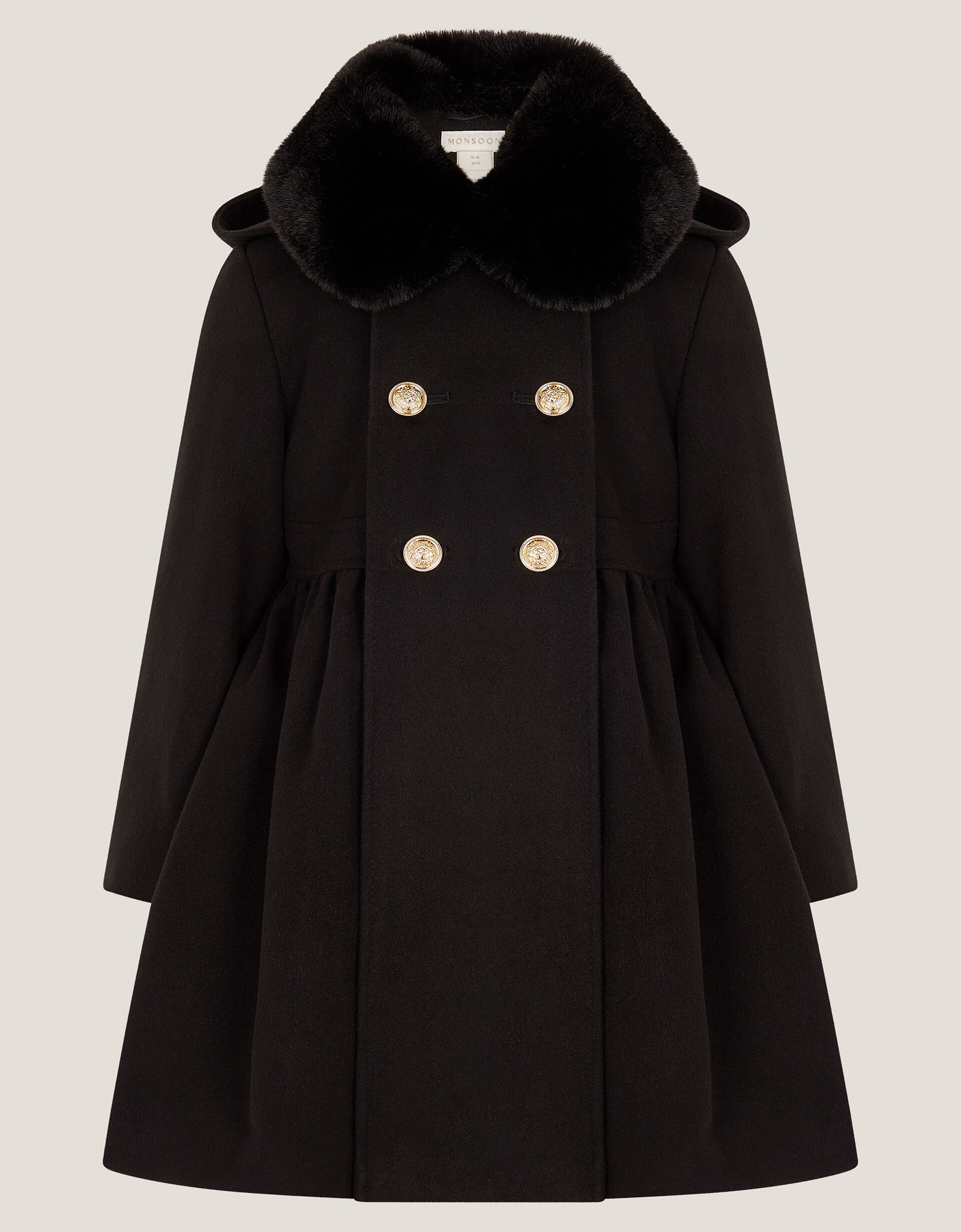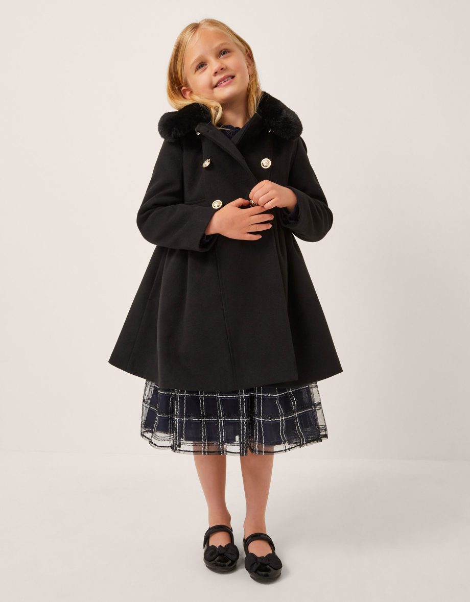 Back to school basics. Designed to keep them cosy on their school commute, this classic coat features a flared silhouette and double-breasted buttons to the front. Finished with a detachable faux fur collar. Black