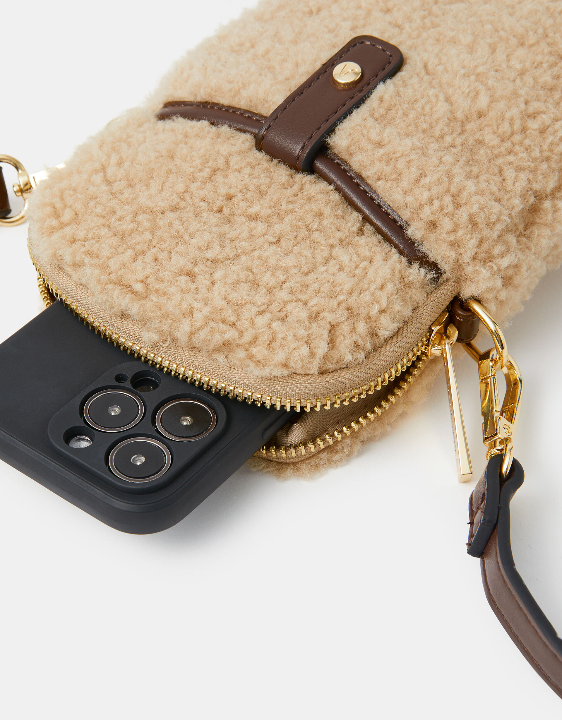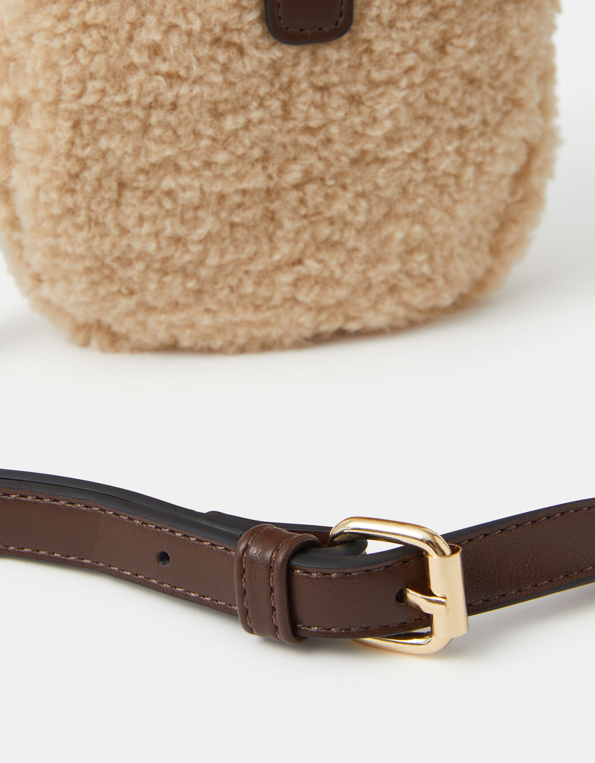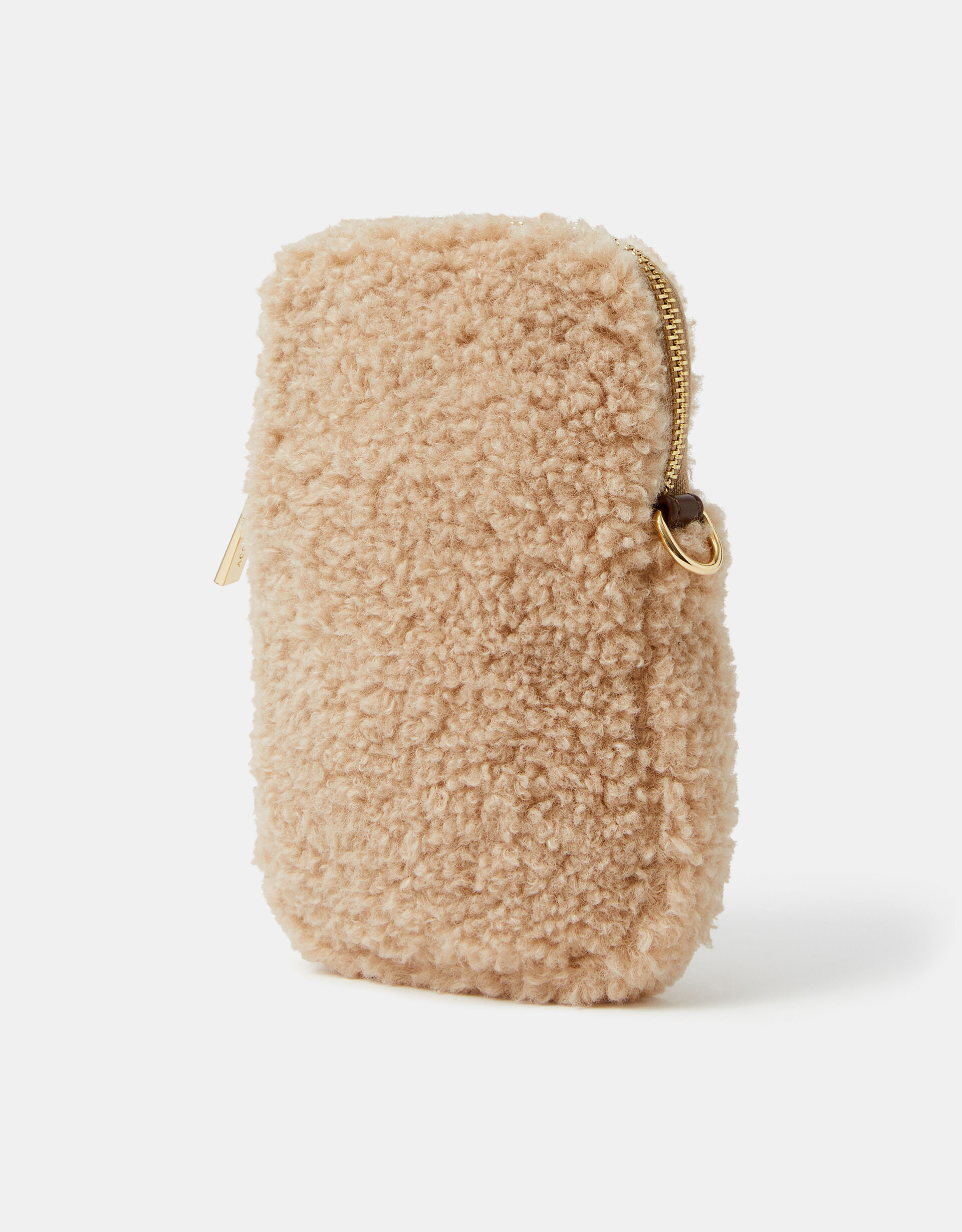 A cuddly home for your phone! Made from soft faux shearling fabric, this bag features a main phone-sized compartment with a zip fastening, front tab pocket and adjustable crossbody strap.