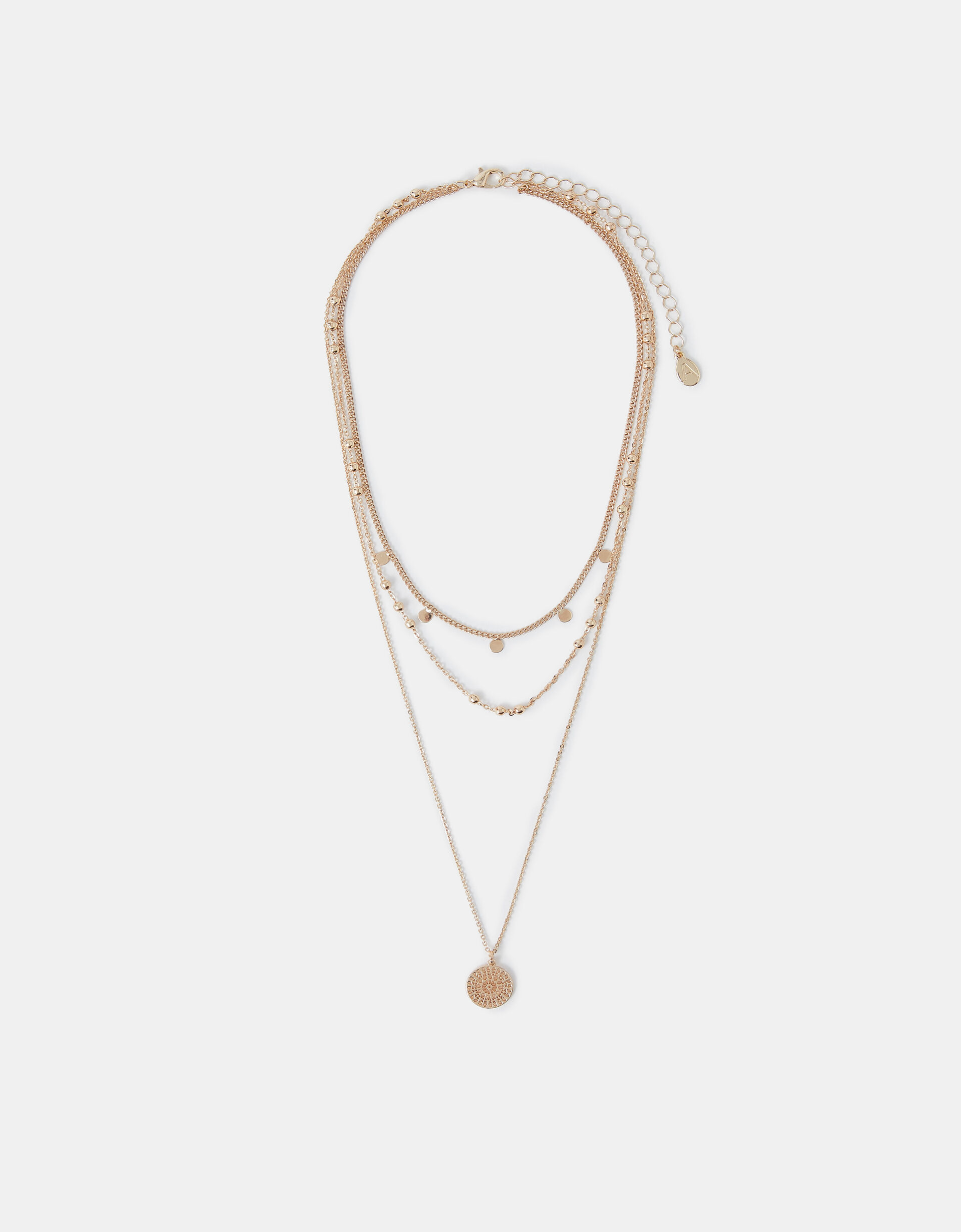 Delicate and effortlessly pretty, this layered necklace showcases small beads, mirrors and a filigree coin pendant. Slip on and go-go!