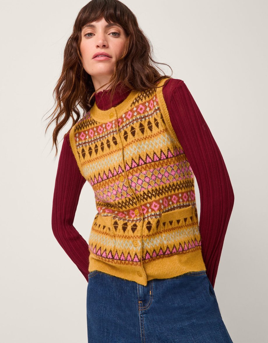 Knit happens. A cosy layer to style over T-shirts and long sleeve tops, this knitted vest is stitched with a decorative fair isle pattern in a mix of mustard and baby pink hues. Finished with front button fastenings and two patch pockets. Yellow
