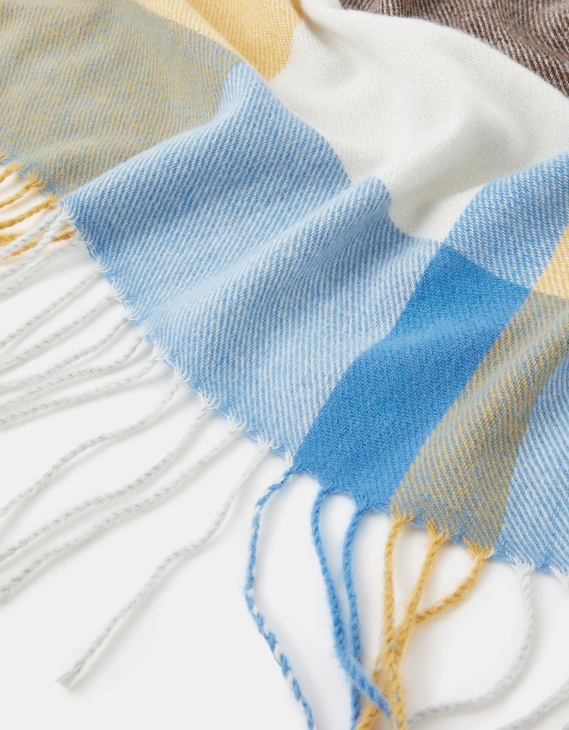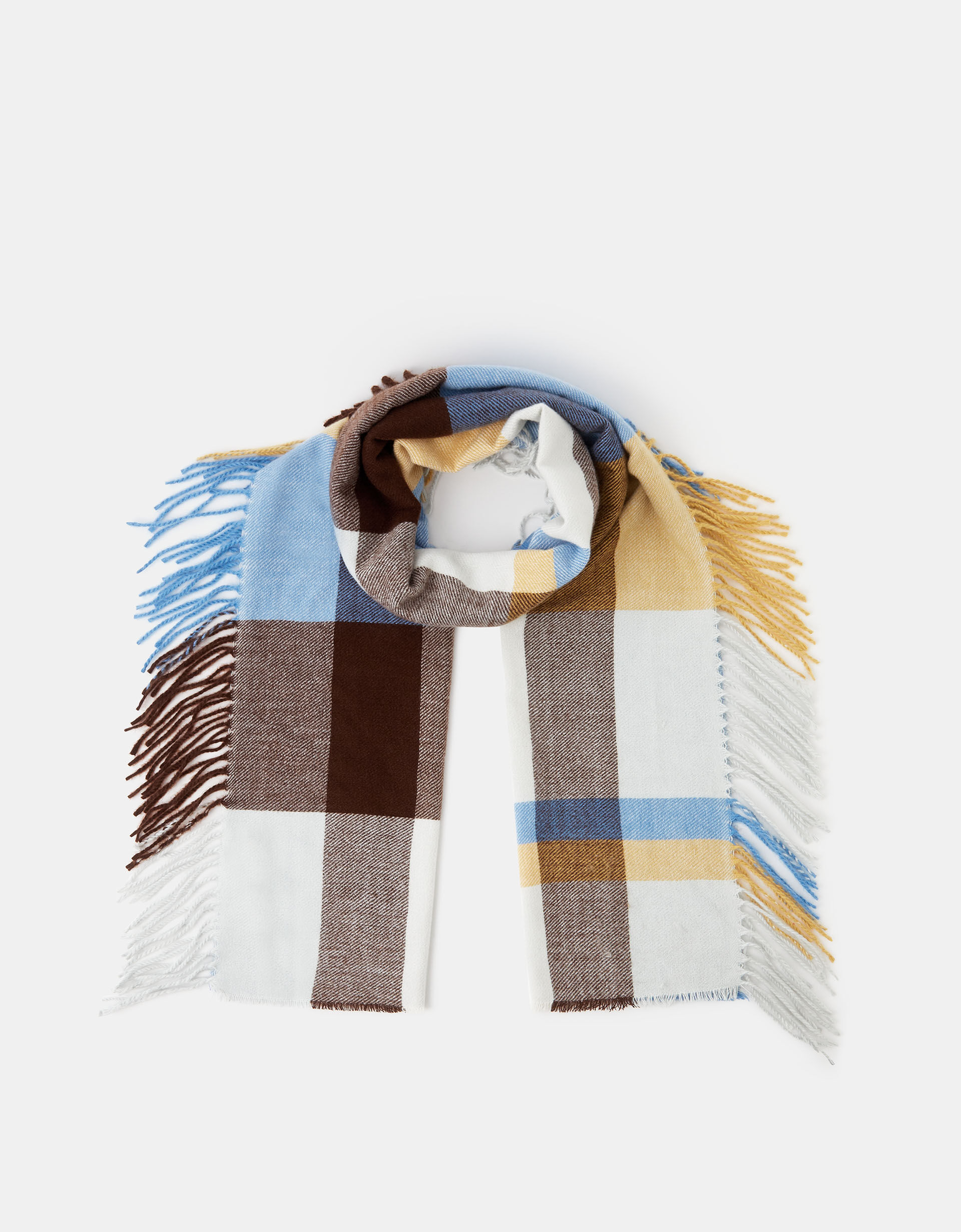 Designed with tassel fringing through the sides rather than at each end, this super-soft blanket scarf adds a warm, Western-inspired vibe to your look. Woven with a bold checkered pattern in butter yellow, baby blue and brown.