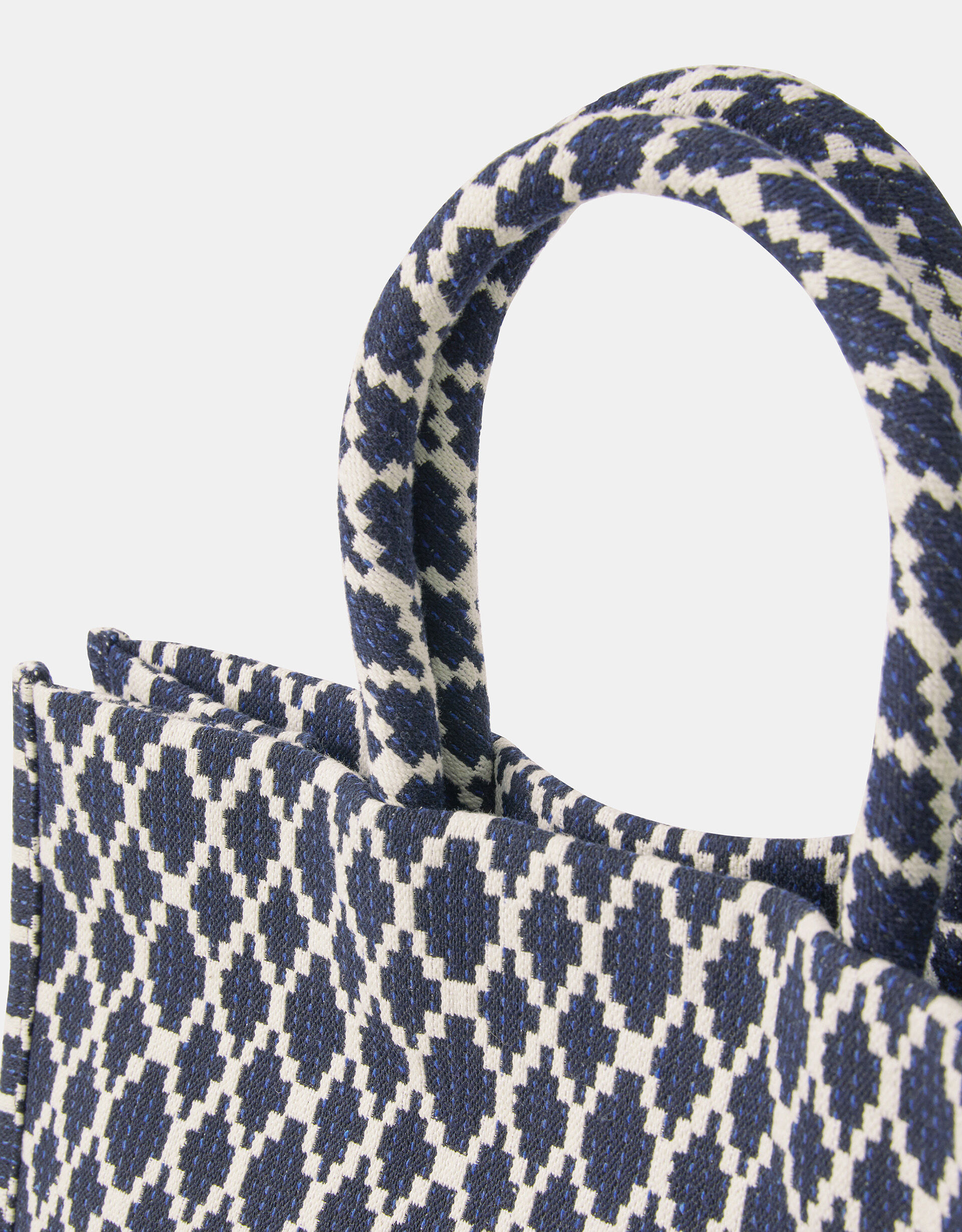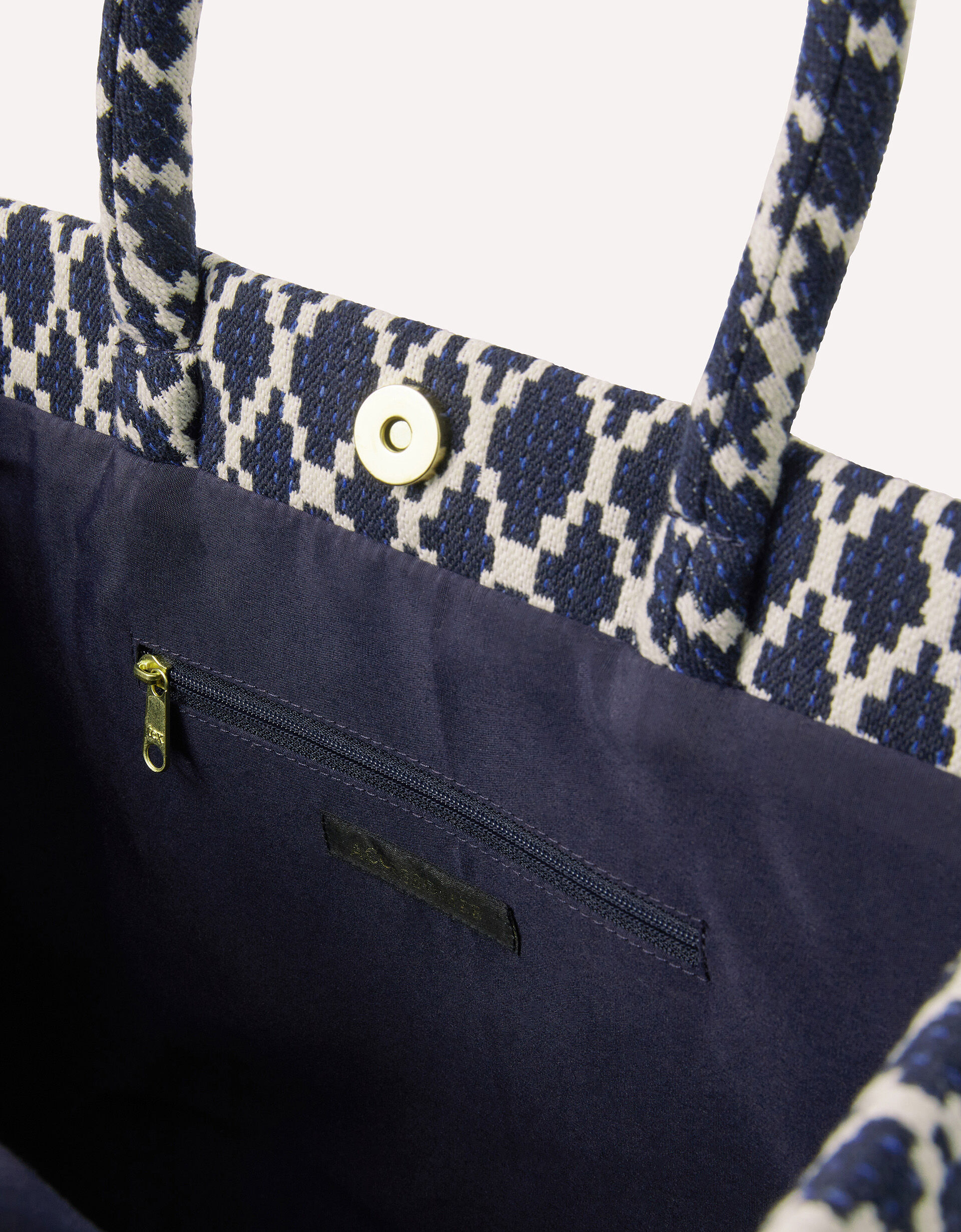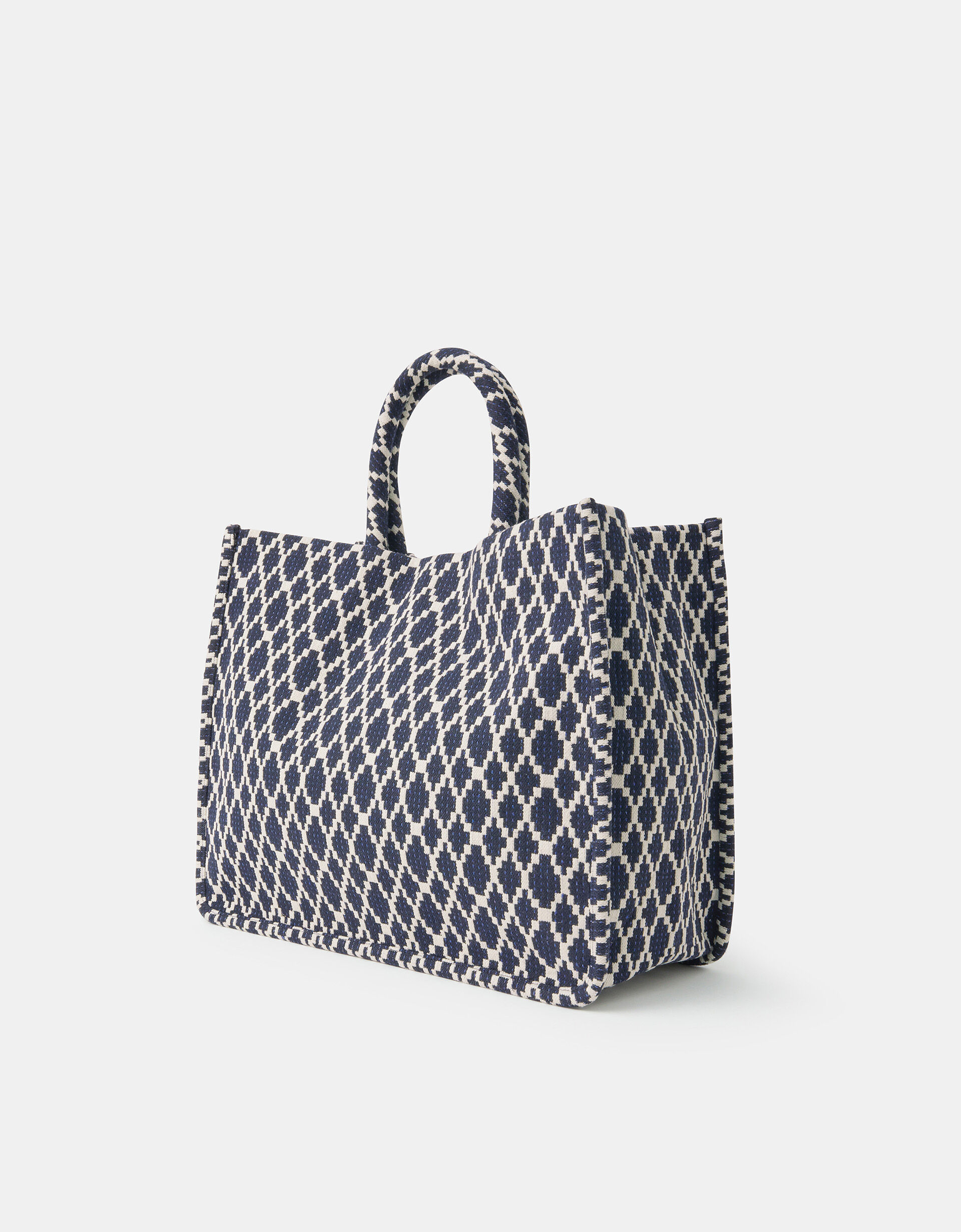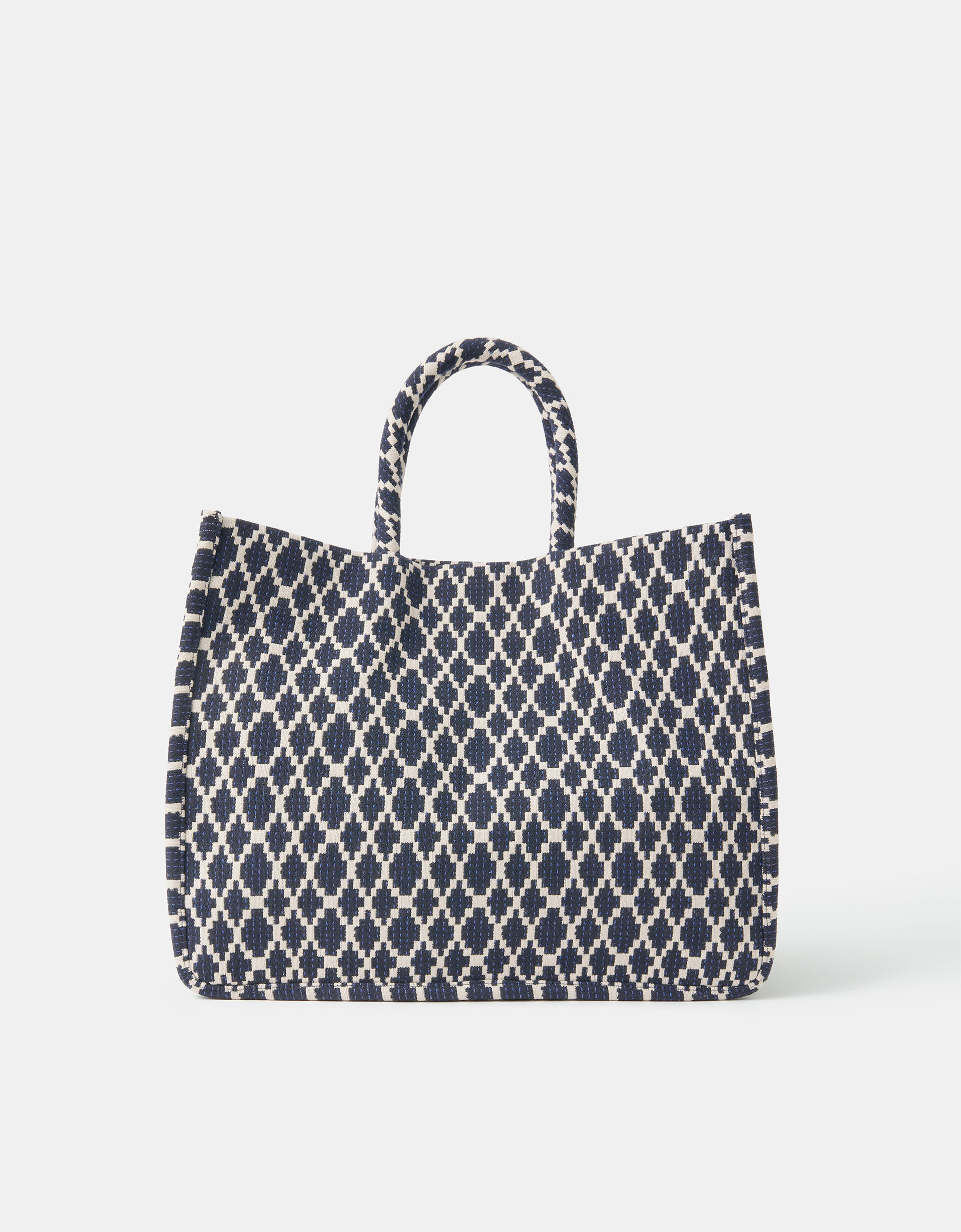 Patterned with bold geometric shapes in navy blue, this handheld bag is the perfect pick for errand-running or last minute grocery shopping. Features a magnetic button fastening and inner zip pocket.