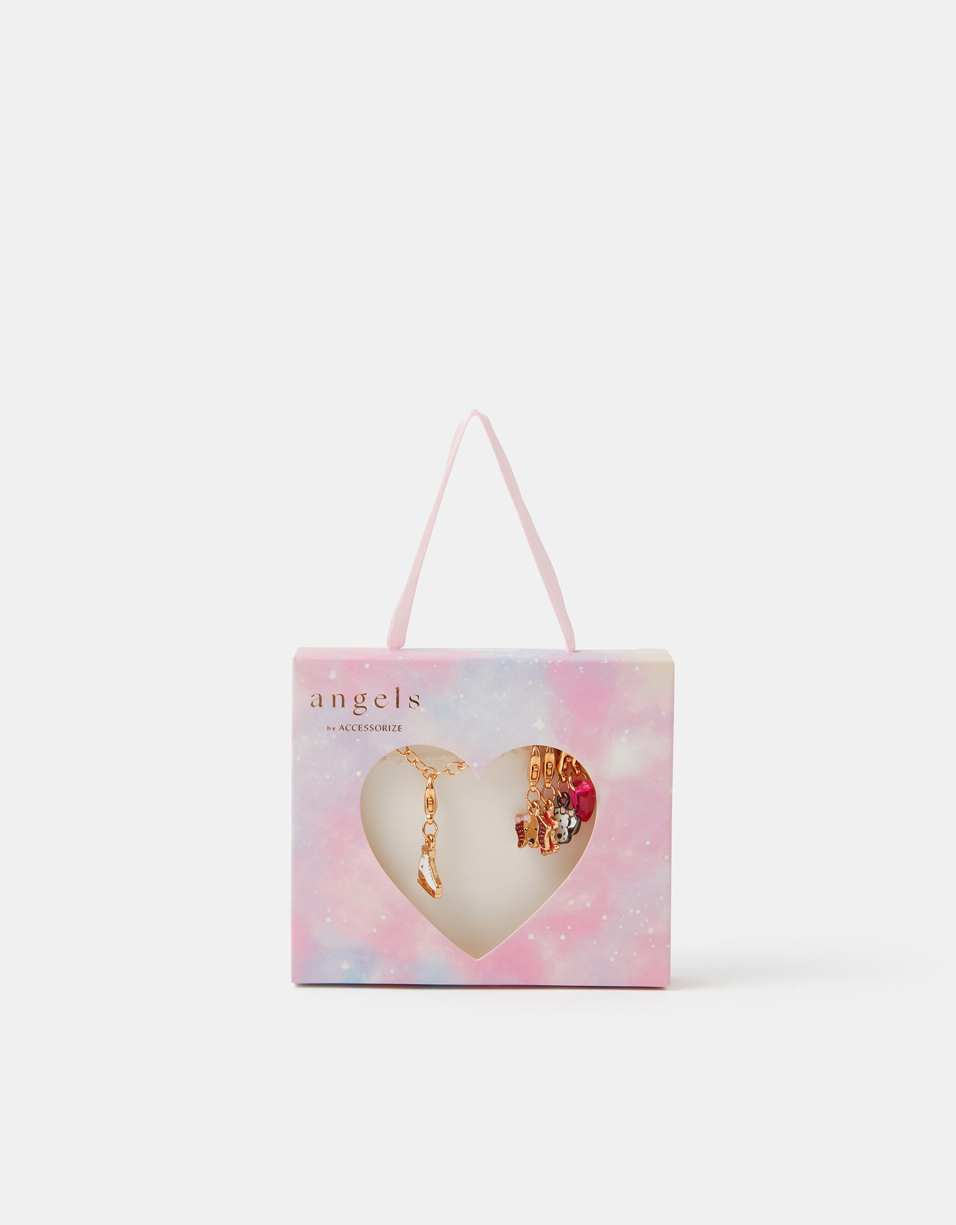 A fun way of adding some personality to their looks, this jewellery gift set comes with a gold-tone chain bracelet and cute charms for them to clip on themselves. Featuring a pink bow, two dogs, an ice skate and jewel heart. Which will be their favourite? Warning! Choking Hazard—Small parts. Not suitable for children under 3 years old.