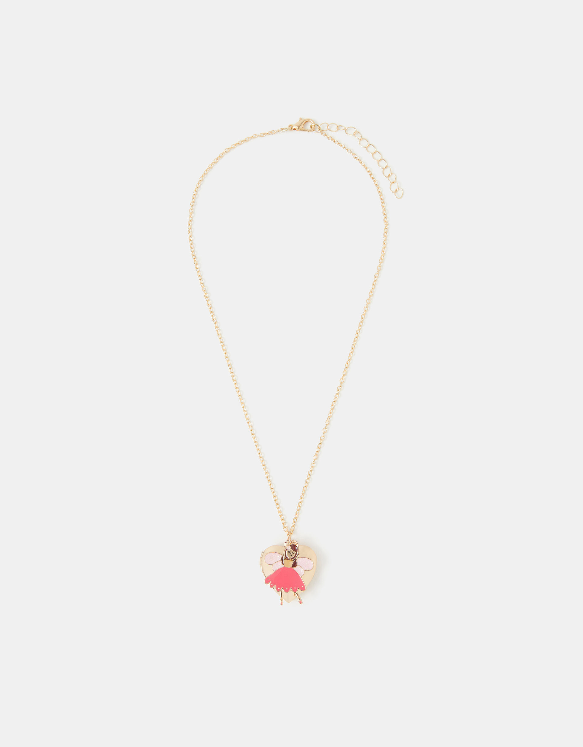 A cute way of keeping loved ones close to their hearts. Dipped in a gold tone, this necklace features a heart-shaped locket that opens to reveal space for two small photographs. Finished with a fairy pendant to the front. Warning! Choking Hazard—Small parts. Not suitable for children under 3 years old.