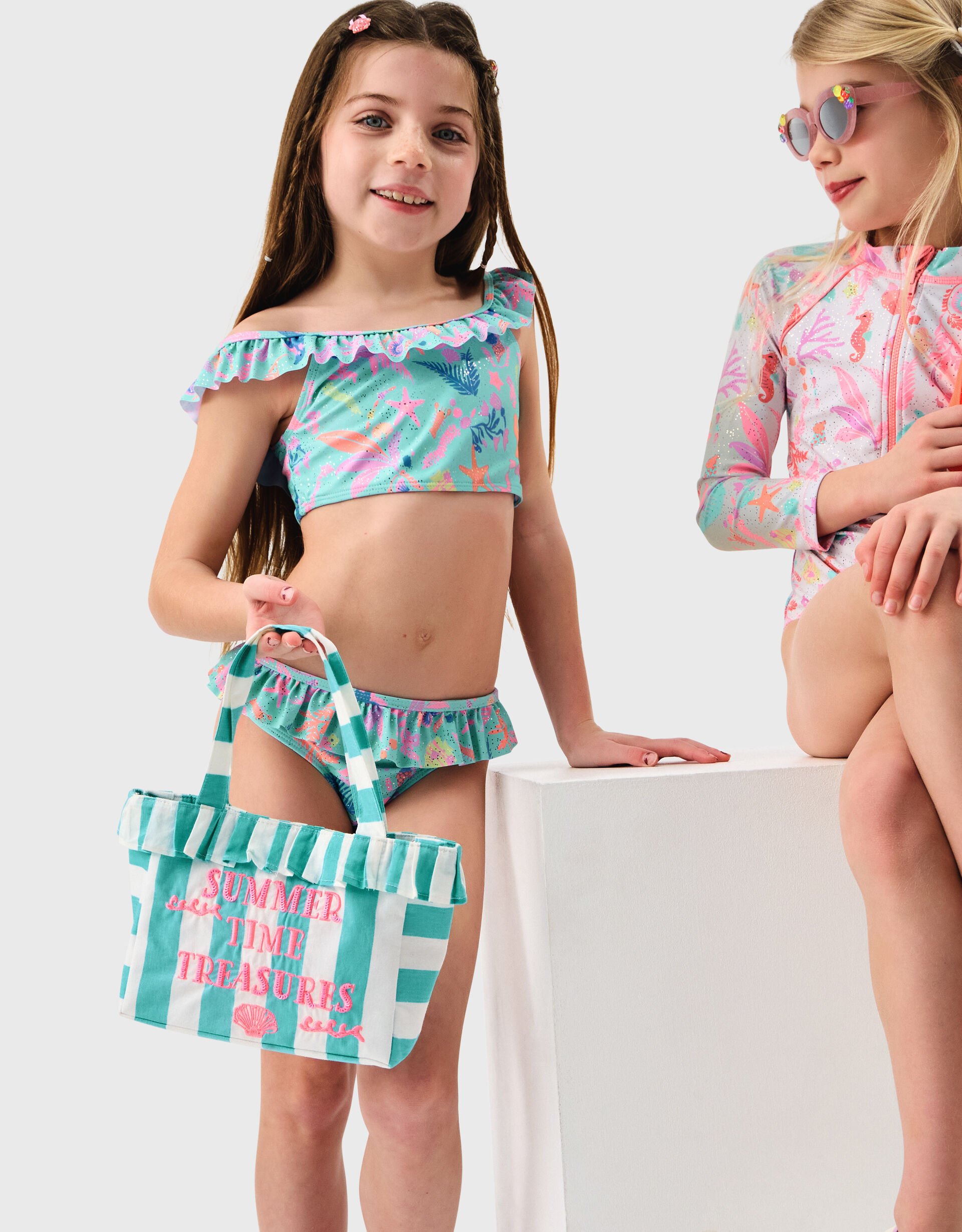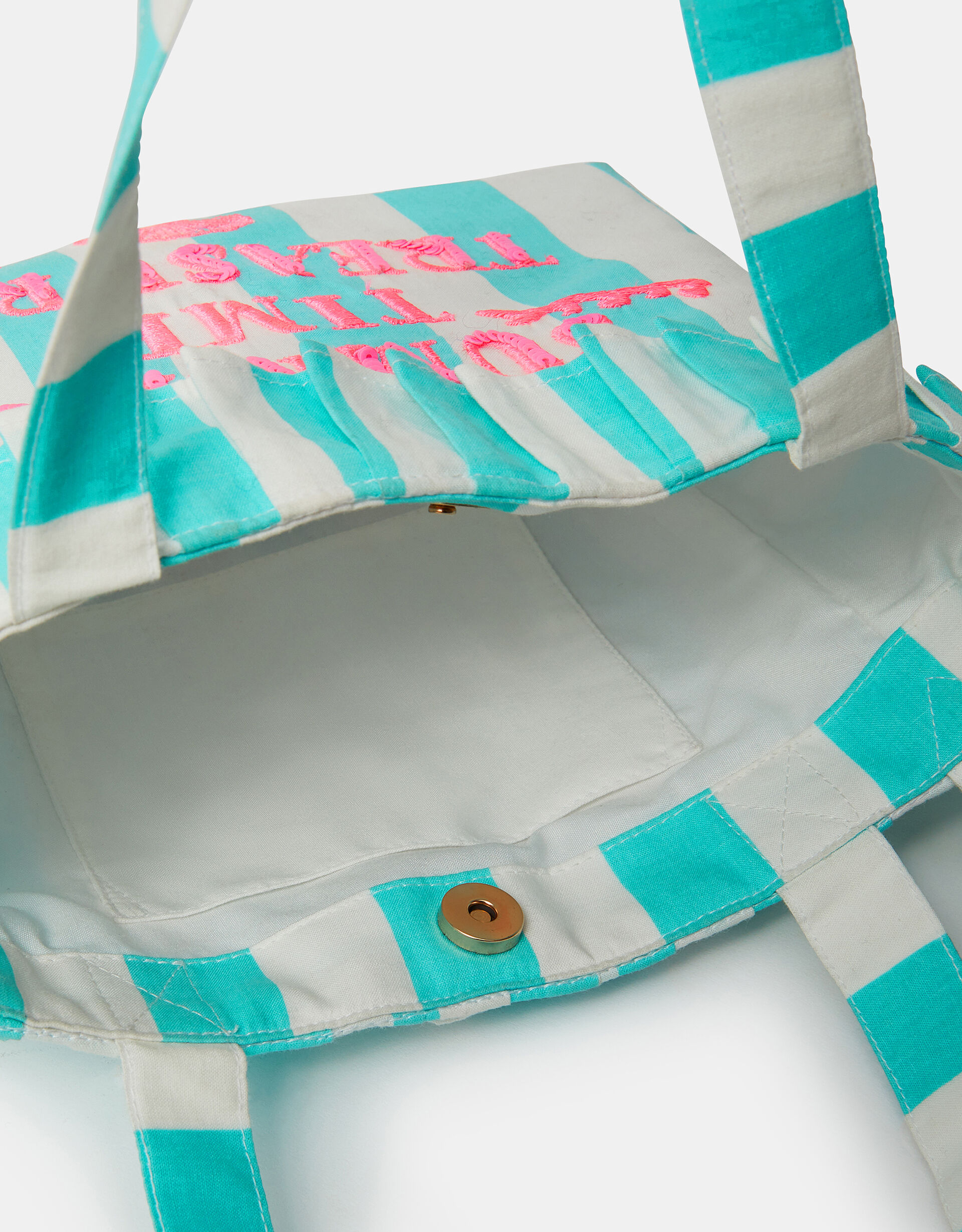 Showcasing stripes in white and aquamarine, this tote features two strap options, frilly trim and an embroidered slogan on the front. Open to find a small side pocket and magnetic button closure. Do what it says on the bag and fill it with all their summer time treasures!